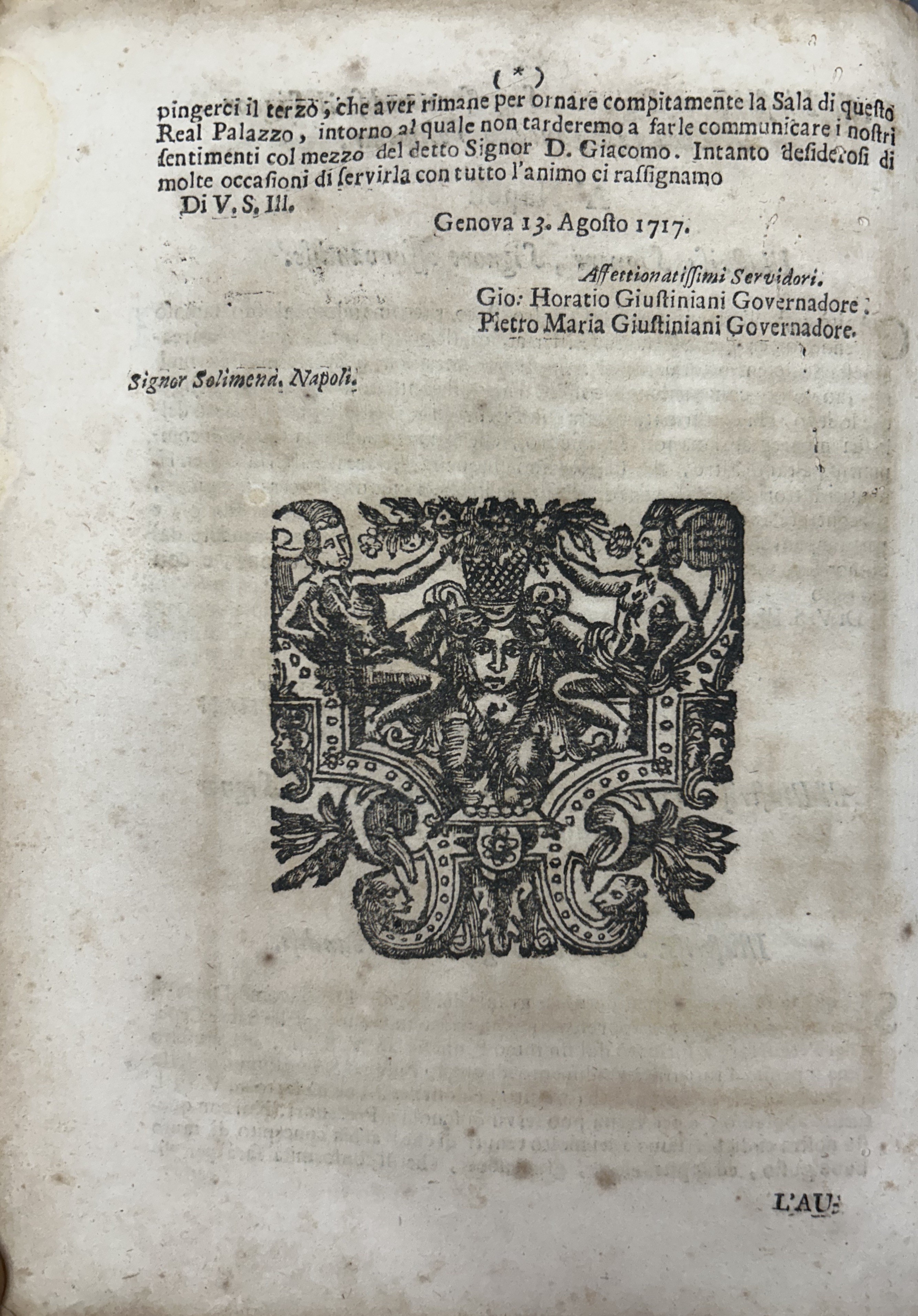 Opera comprendente le biografie degli artisti italiani e stranieri fino al XVII secolo. Completo della biografia di Francesco Solimena al quale è dedicata l’opera e delle cinque tavole raffiguranti i monogrammi degli artisti. Marca tipografica, iniziali e finalini xilografici.