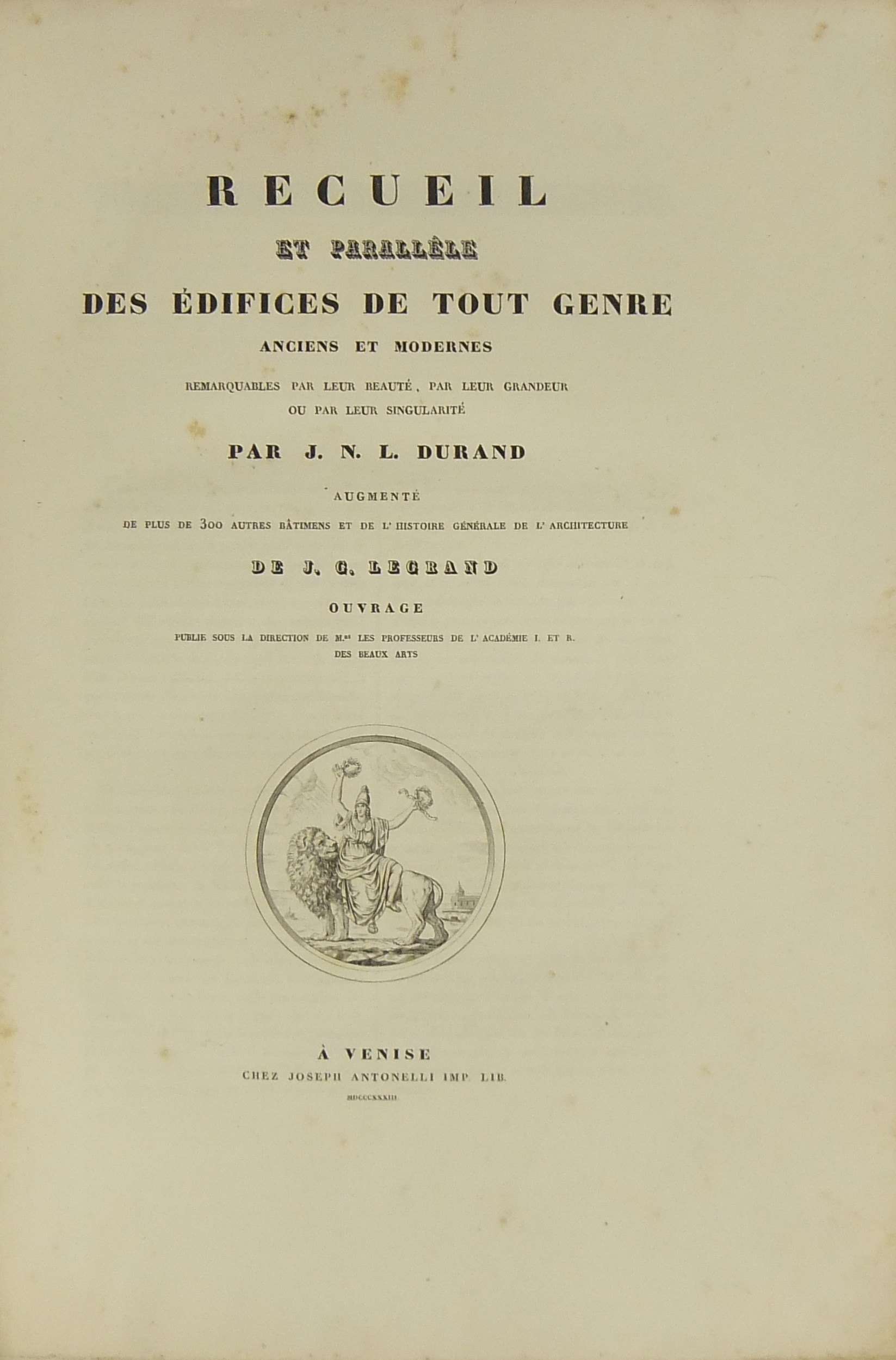 Raccolta e parallelo delle fabbriche classiche di tutti i tempi d'ogni popolo e di ciascun stile con l'aggiunta di altre 300 e più fabbriche e monumenti d'ogni genere antichi e moderni e della storia generale dell'architettura di J.G. Legrand