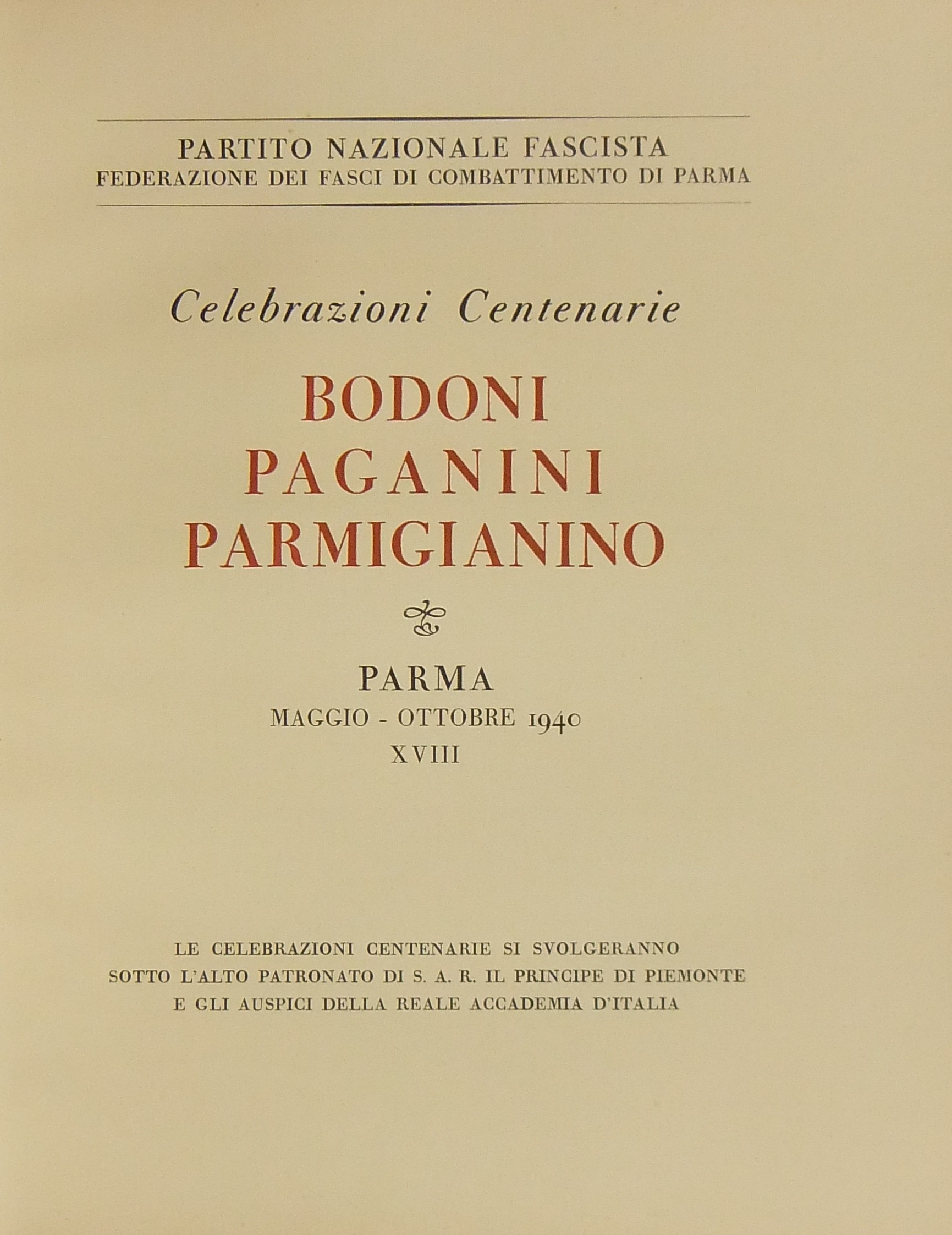 Bodoni, Paganini, Parmigianino. Parma Maggio - Ottobre 1940-XVIII