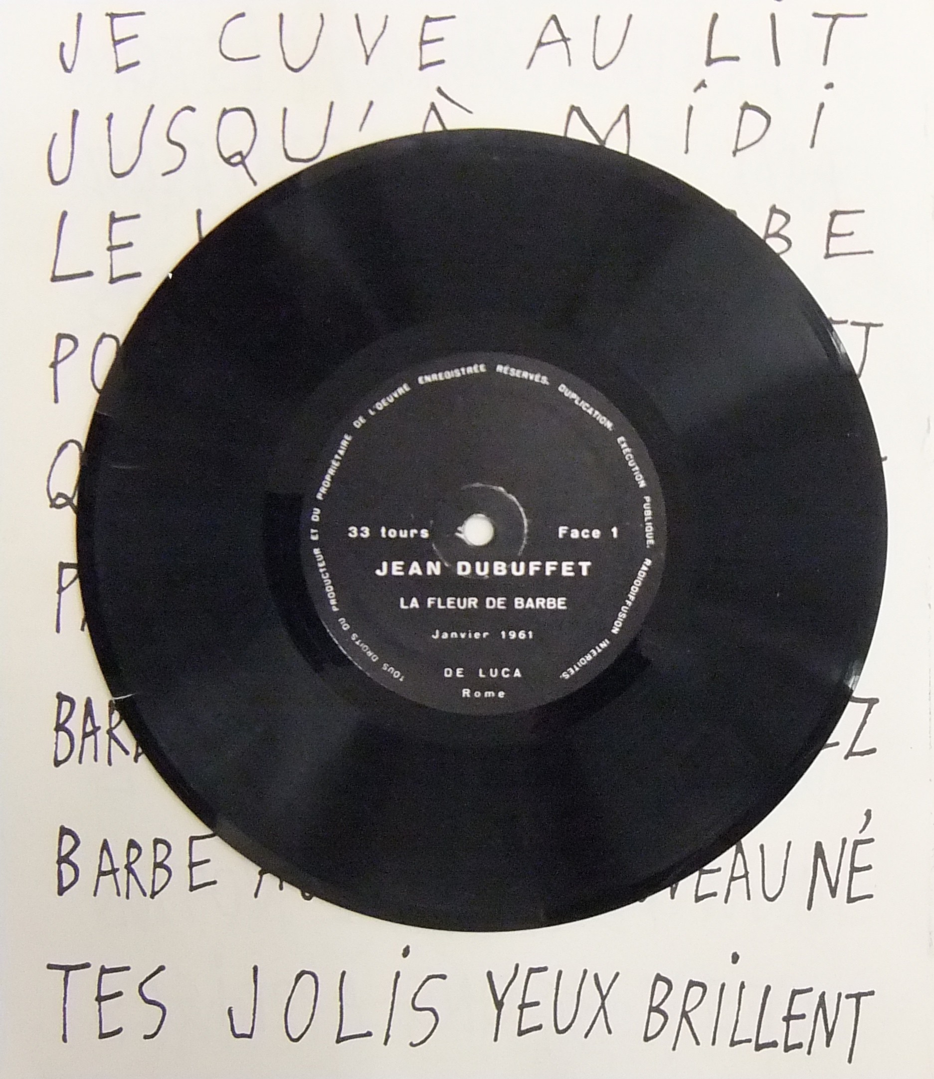 Completo di testi di Jean Dubuffet in appendice, calendario, bibliografia, cronologia critica e in terza di copertina disco 33 giri intitolato "Le fleur de barbe" (testo, musica e esecuzione dell'Artista).