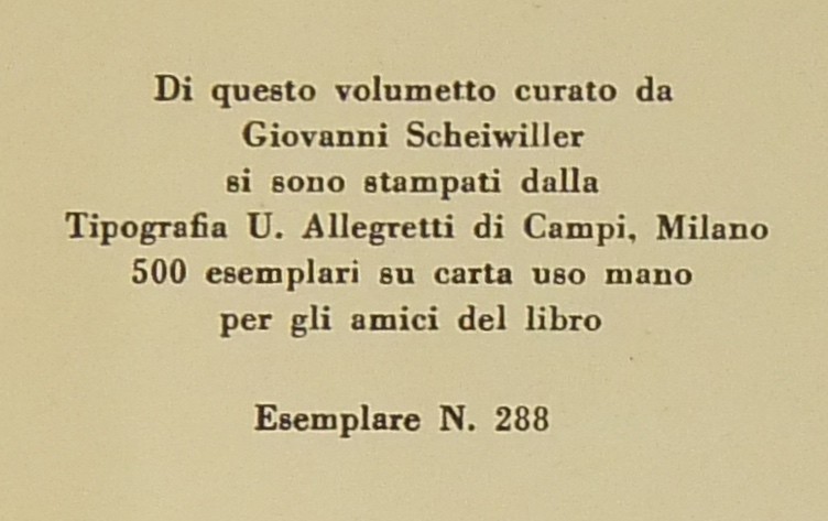 Nuova edizione in facsimile del manoscritto. Edizione di 500 copie numerate su carta uso mano per gli Amici del Libro. Ns. n. 288