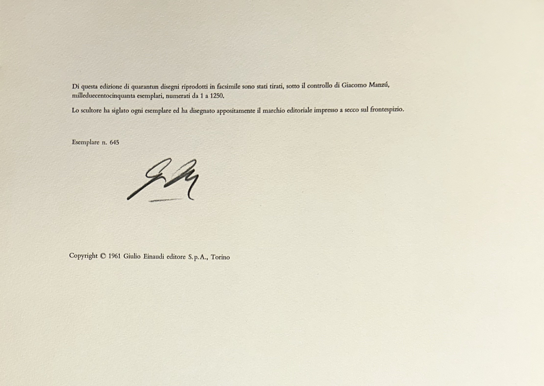 Di questa edizione sono stati tirati, sotto il controllo di Giacomo Manzù, 1250 esemplari numerati. Lo scultore ha siglato ogni esemplare ed ha disegnato appositamente il marchio editoriale impresso a secco sul frontespizio. Nostro esemplare n. 645