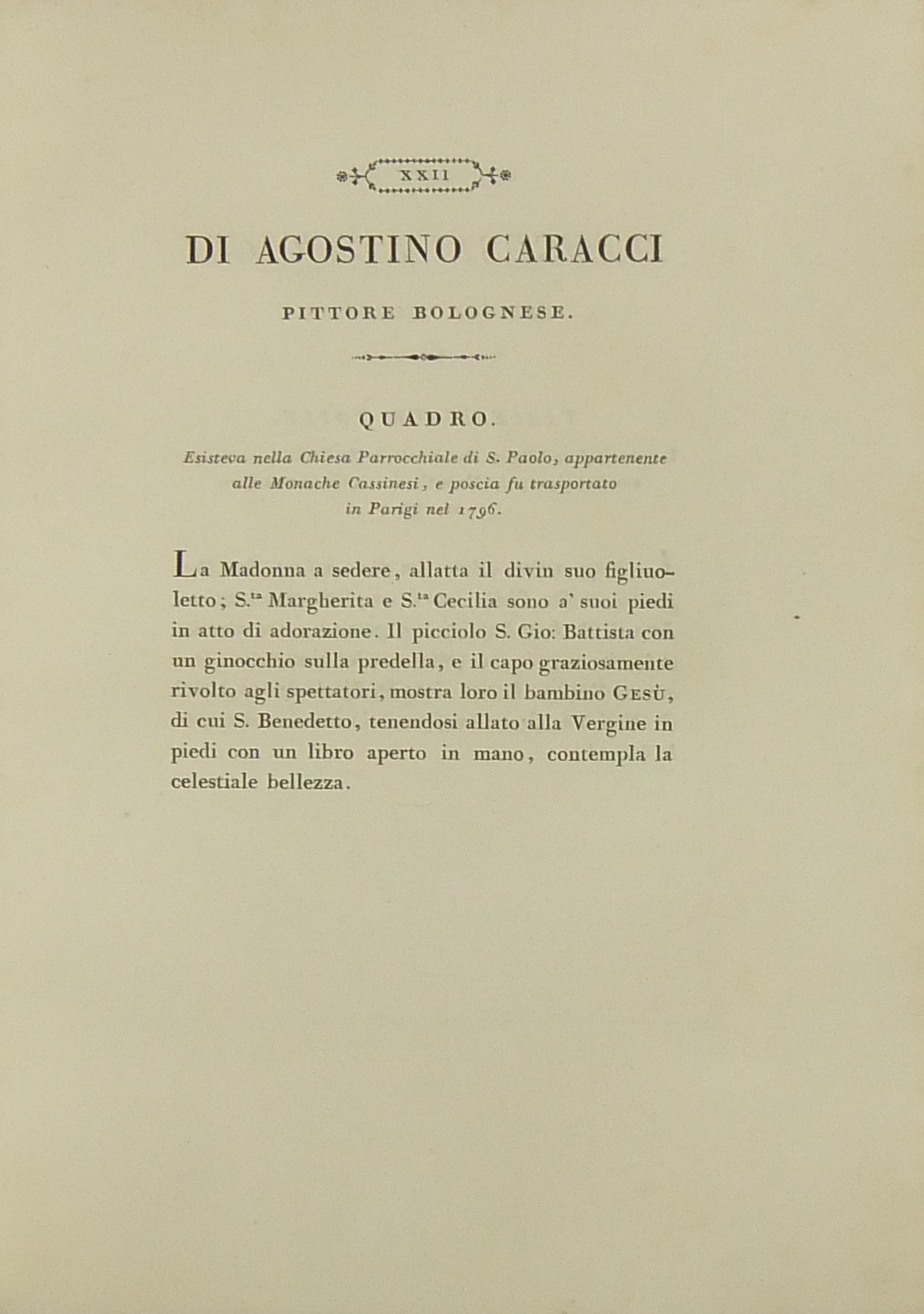 Opera esposta alla mostra bodoniana di Parma nel 1940. Prefazione di Bodoni in italiano e francese. Le pregevoli incisioni sono state disegnate dal portoghese F. Vieira e incise dal Rosaspina. Testo bilingue italiano-francese. Erroneamente attribuita dal Brooks