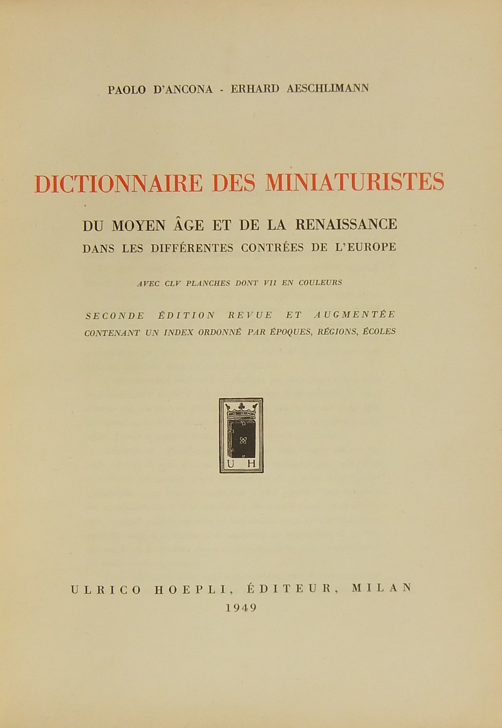 Dictionnaire des miniaturistes du moyen age et de la renaissance dans les differentes contrees de l'Europe. Avec CLV planches dont VII en couleurs