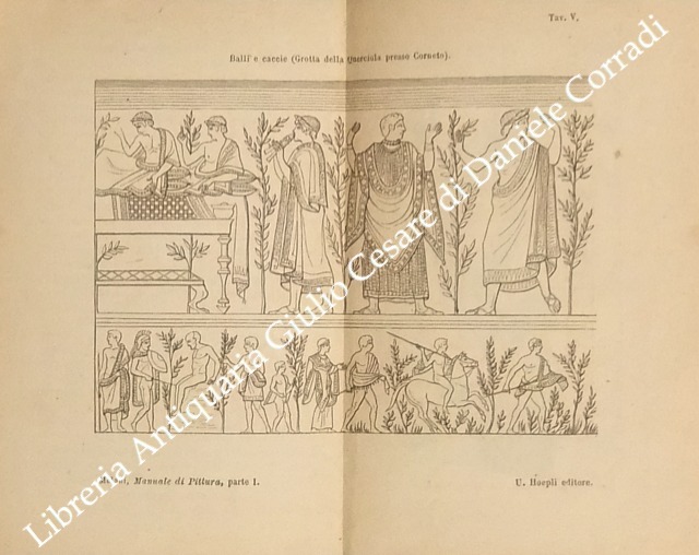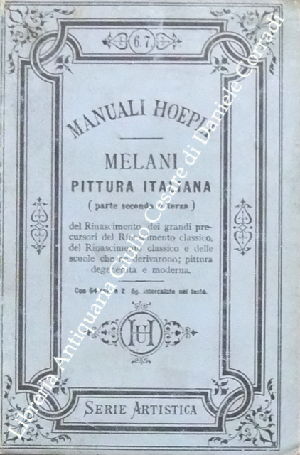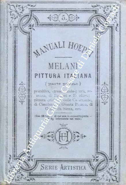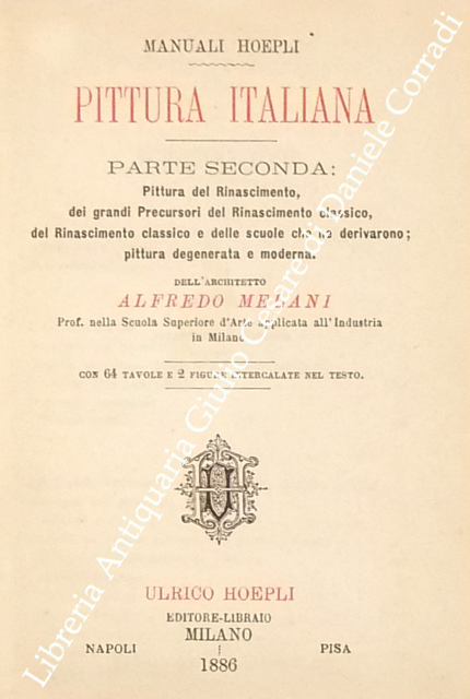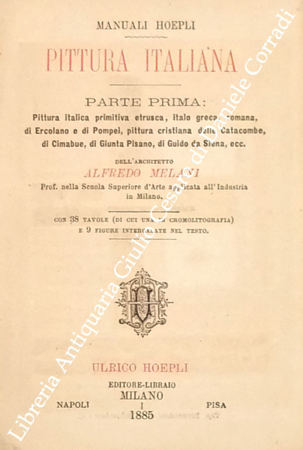 Pittura italiana. Parte prima: pittura italica primitiva etrusca, italo greca, romana, di Ercolano e di Pompei, pittura cristiana delle Catacombe di Cimabue, di Giunta Pisano, di Guido da Siena, con 38 tavole (di cui una in cromolitografia) e 9 figure intercalate nel testo; parte seconda: pittura del Rinascimento, dei grandi Precursori del Rinascimento classico, del Rinascimento classico e delle scuole che ne derivarono, pittura degenerata e moderna con 64 tavole e 2 figure intercalate nel testo