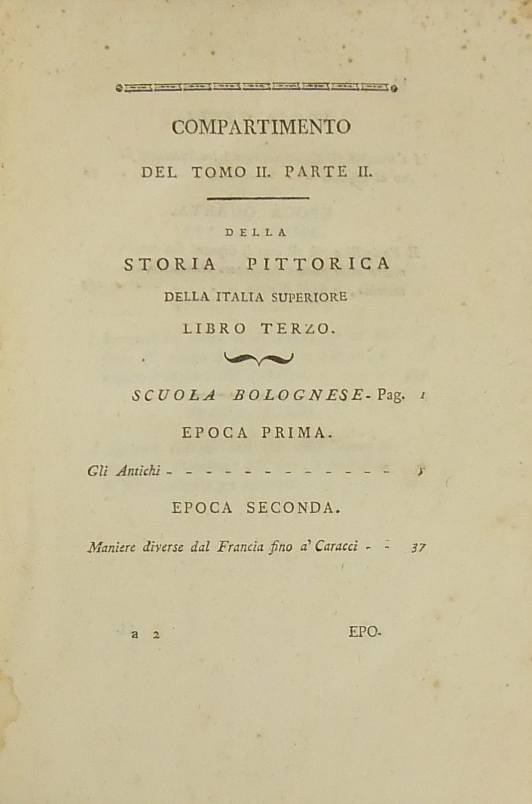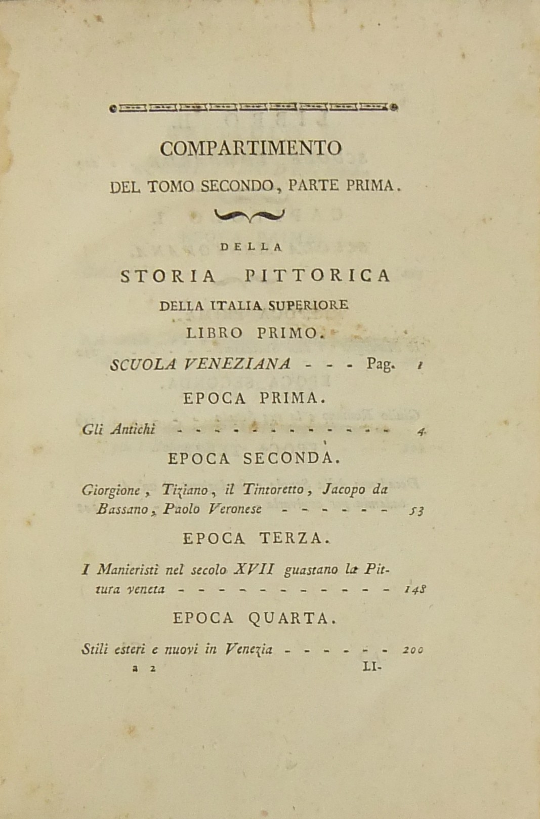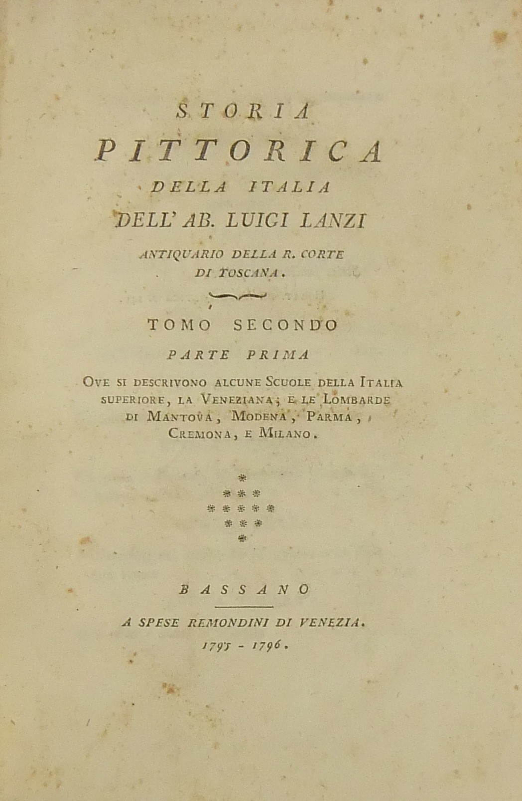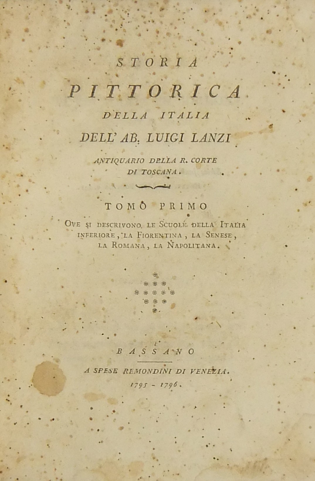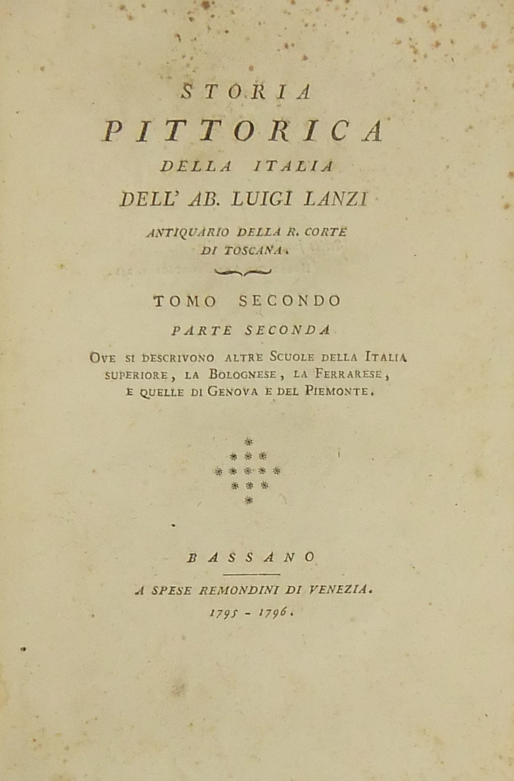 Storia pittorica della Italia... Tomo primo - Ove si descrivono le Scuole della Italia Inferiore, la Fiorentina, la Senese, la Romana, la Napolitana. Tomo secondo, parte prima - Ove si descrivono alcune Scuole della Italia Superiore, la Veneziana e le Lombarde di Mantova, Modena, Parma, Cremona e Milano. Tomo secondo, parte seconda - Ove si descrivono altre Scuole dell'Italia Superiore, la Bolognese, la Ferrarese e quelle di Genova e del Piemonte
