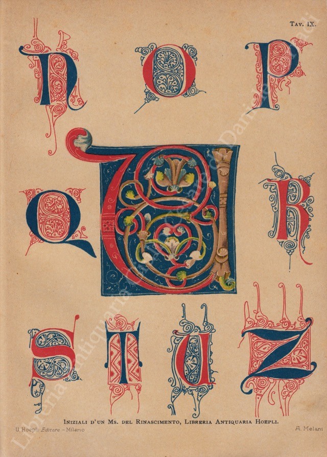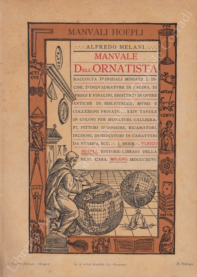 Manuale dell'ornatista. Raccolta d'iniziali miniate e incise di frontespizi d'inquadrature di pagina di fregi finalini e legature esistenti in opere antiche di biblioteche musei e collezioni private. XXIV tavole a colori per miniatori calligrafi pittori d'insegne ricamatori incisori disegnatori di caratteri da stampa ecc.