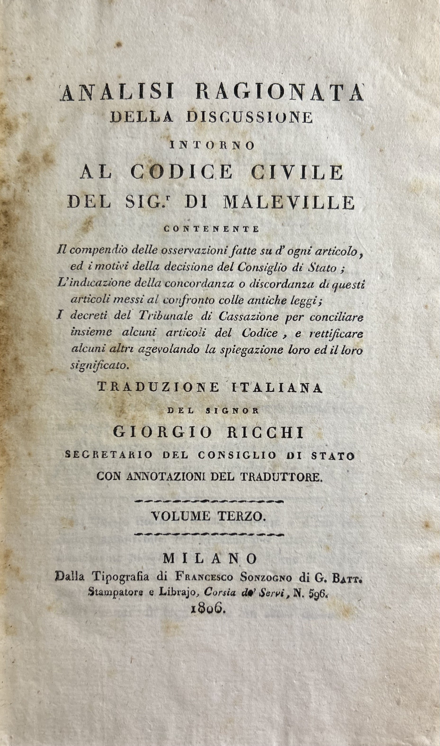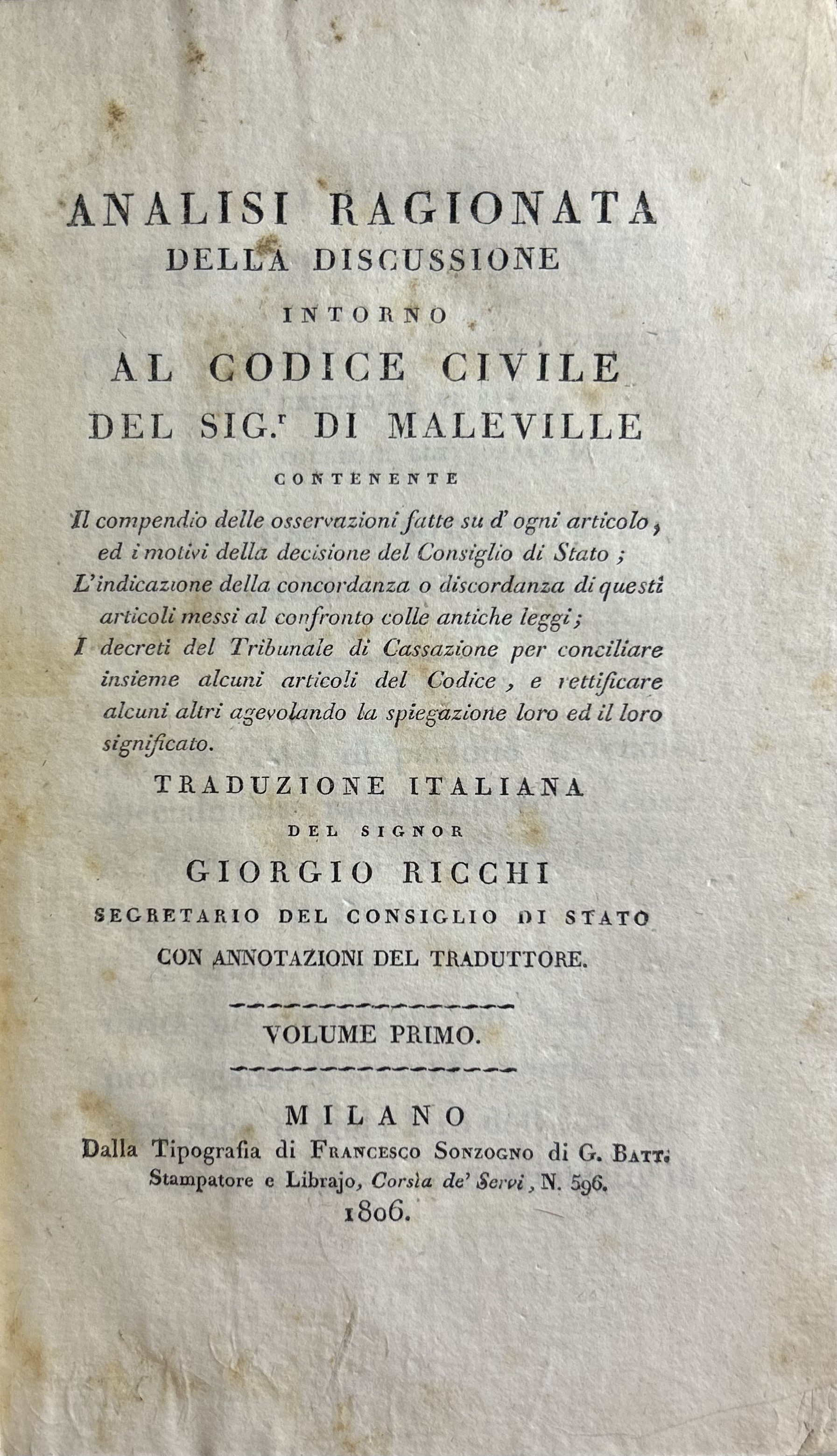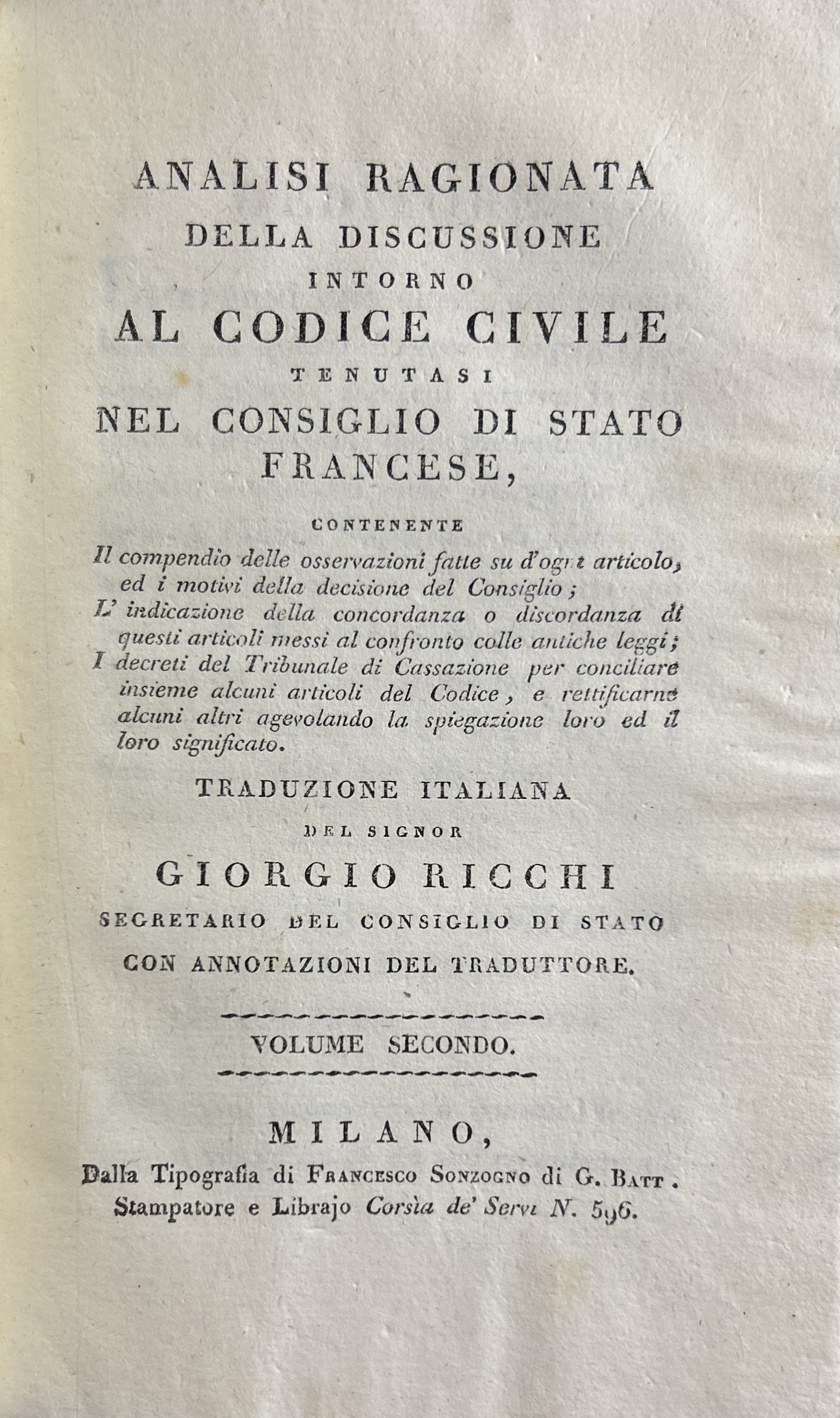 Analisi ragionata della discussione intorno al Codice Civile contenente il compendio delle osservazioni fatte su ogni articolo, ed i motivi della decisione del Consiglio di Stato; L'indicazione della concordanza o discordanza di questi articoli messi al confronto colle antiche leggi; I decreti del Tribunale di Cassazione per conciliare insieme alcuni articoli del Codice, e rettificare alcuni altri agevolando la spiegazione loro ed il loro significato. Traduzione italiana del signor Giorgio Ricchi