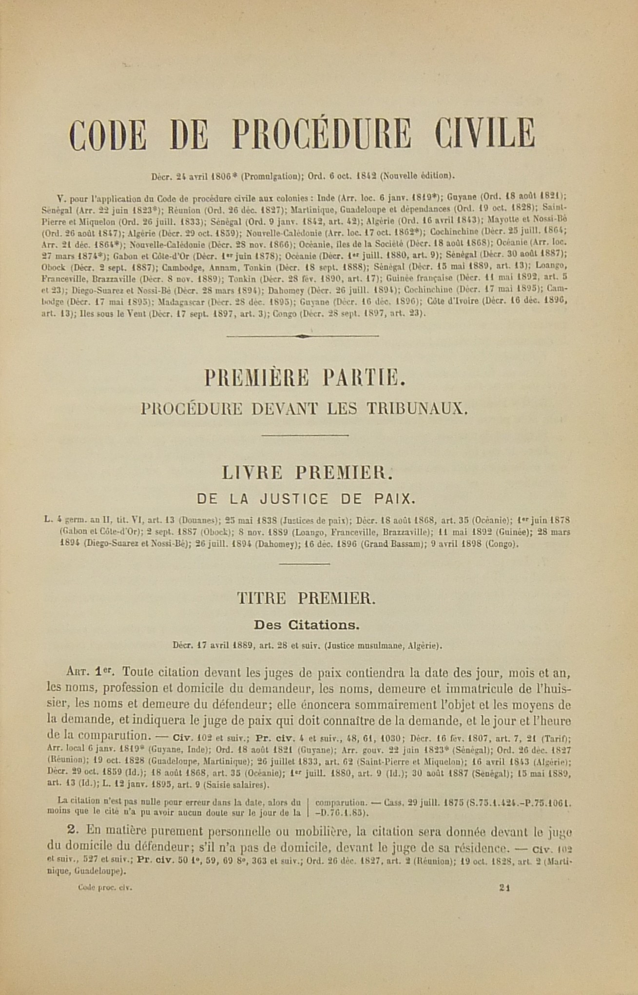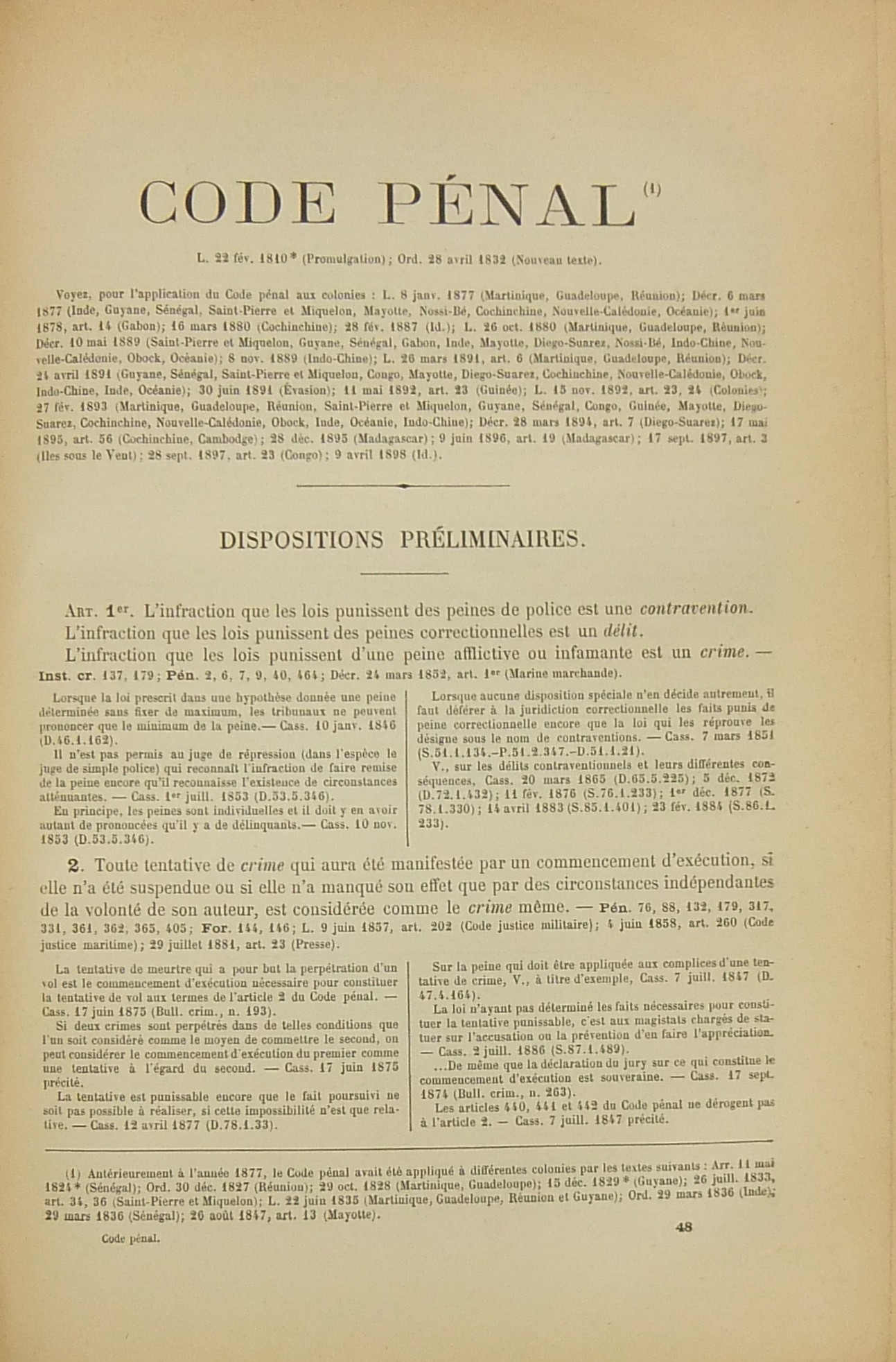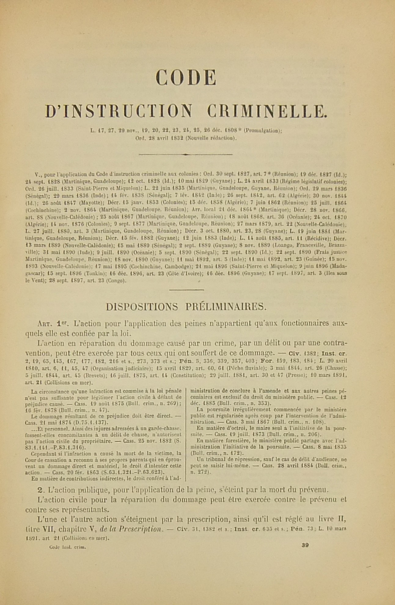 Codes et lois pour la France, l'Algerie et les Colonies. Ouvrage contenant sous chaque article des code de nombreuses referencesaux articles correspondants et aux lois d'interet general..