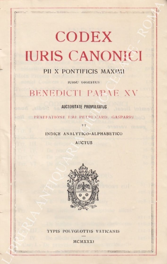 Codex iuris canonici Pii X Pontificis Maximi iussu digestus Benedicti Papae XV auctoritate promulgatus. Praefatione Emi Petri Card. Gasparri