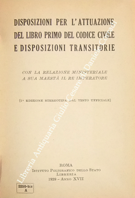 Codice civile. Libro primo. Disposizioni per l'attuazione e disposizioni transitorie con la relazione ministeriale a Sua Maestà il Re Imperatore