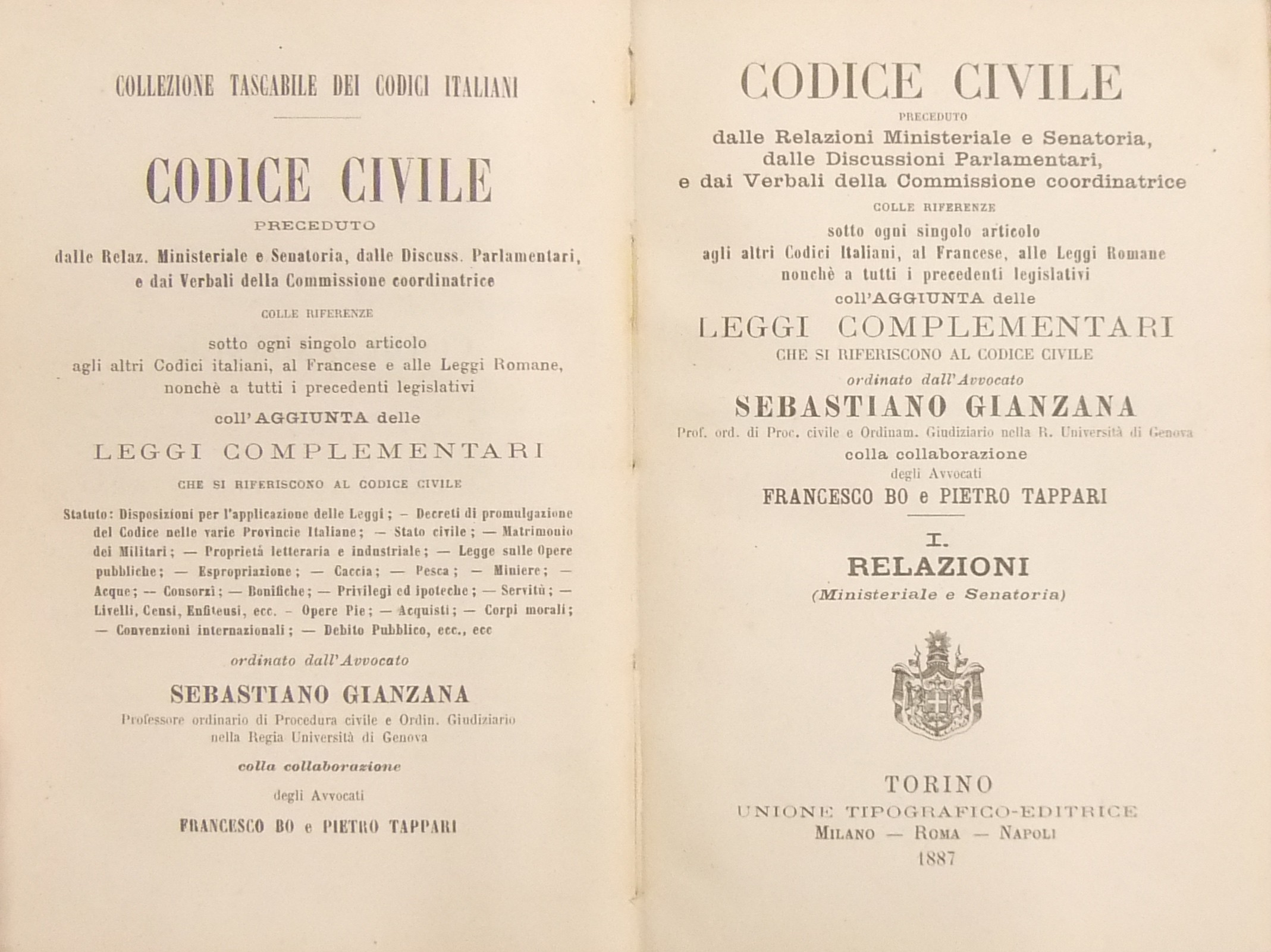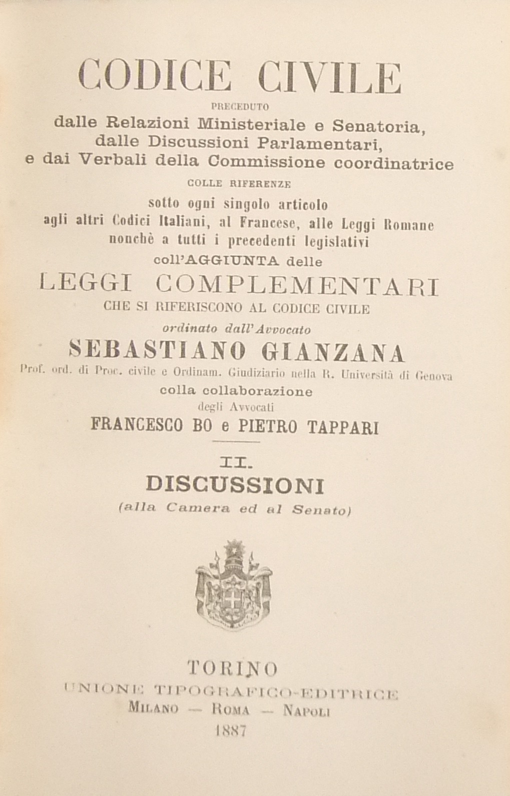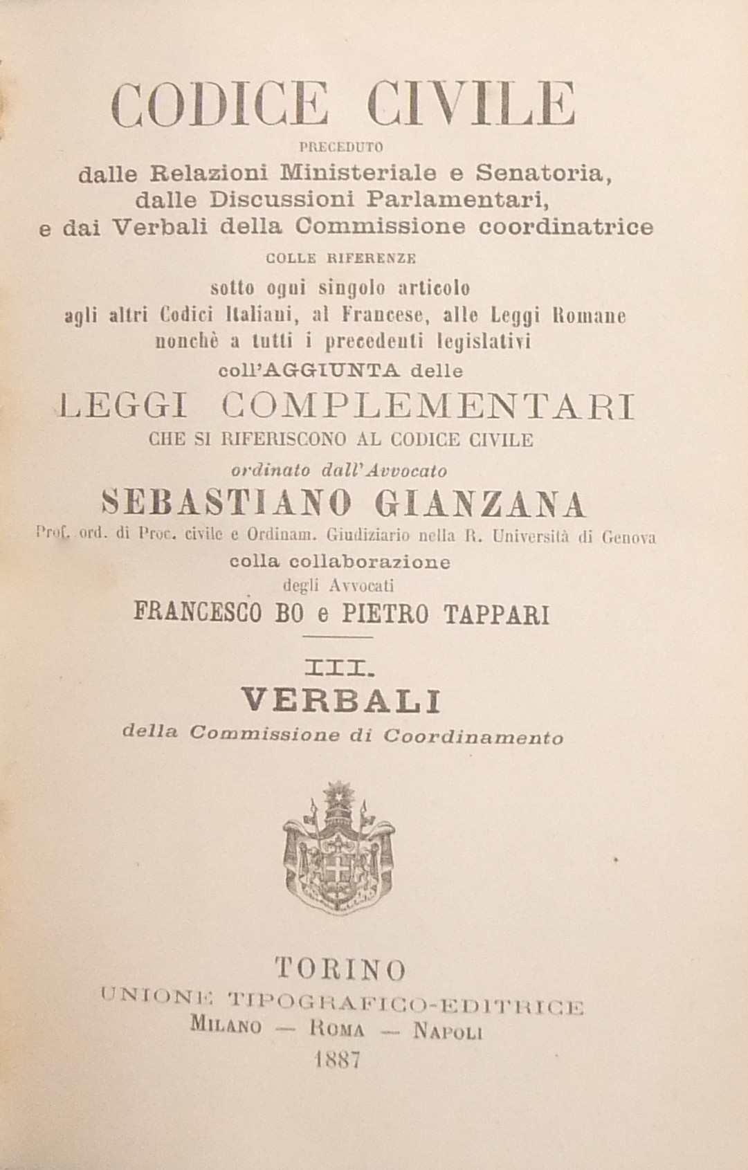 Codice Civile preceduto dalle Relazioni Ministeriale e Senatoria dalle Discussioni Parlamentari e dai Verbali della Commissione coordinatrice. Colle riferenze sotto ogni singolo articolo agli altri Codici Italiani al Francese alle Leggi Romane nonchè a tutti i precedenti legislativi coll'aggiunta delle Leggi Complementari che si riferiscono al Codice civile. Vol. I - Relazioni (Ministeriale e Senatoria). Vol. II - Discussioni (alla Camera ed al Senato). Vol. III - Verbali della Commissione di Coordinamento