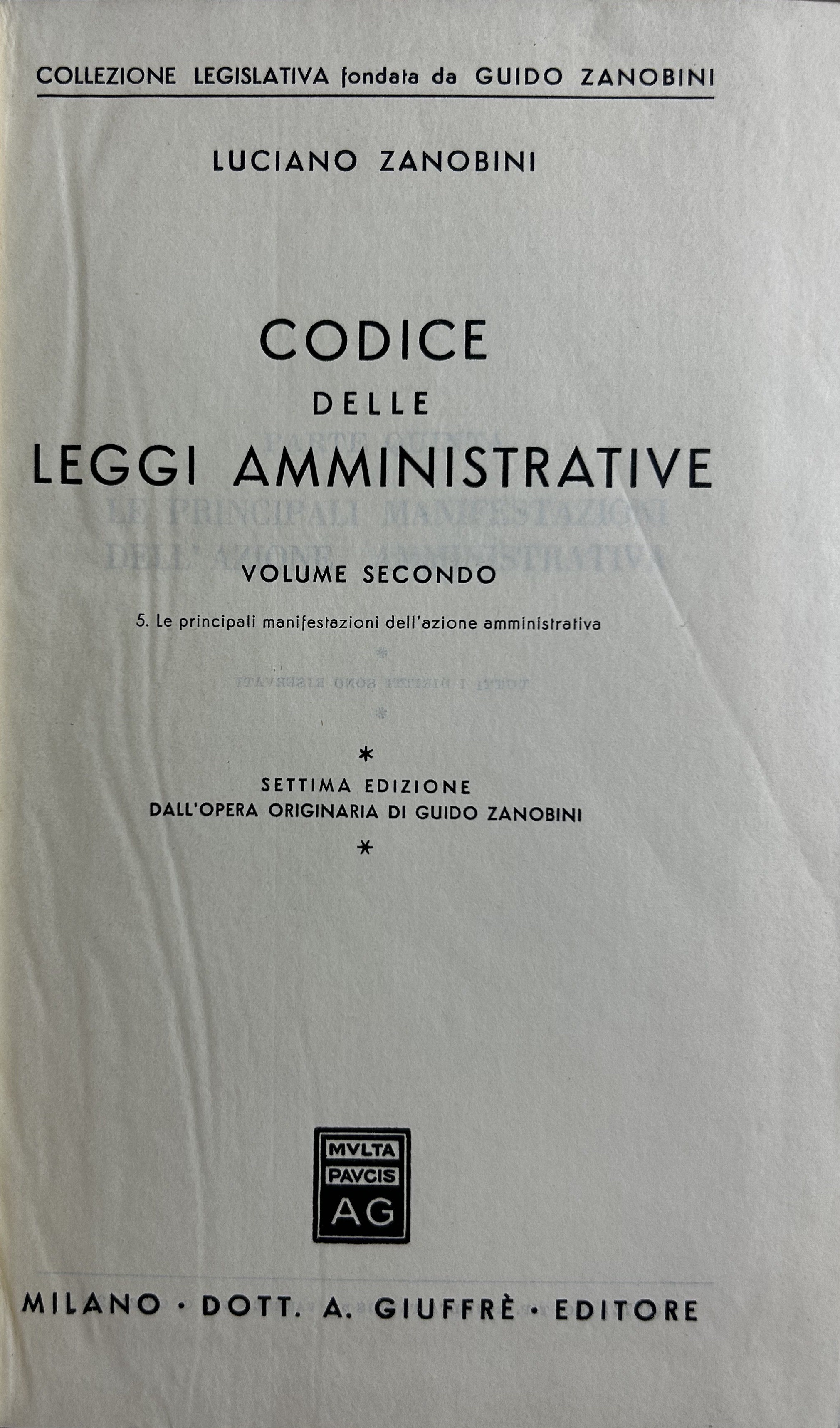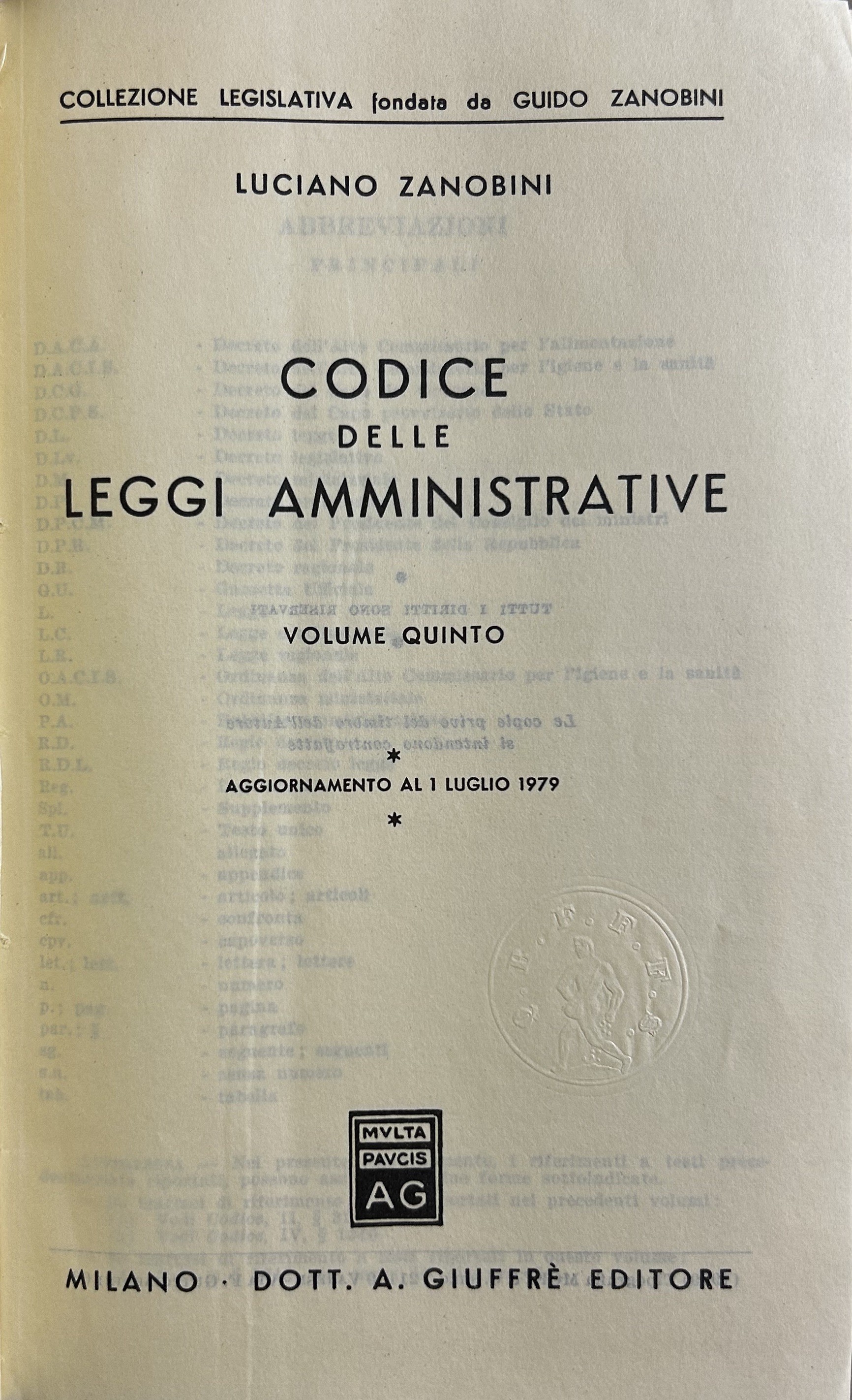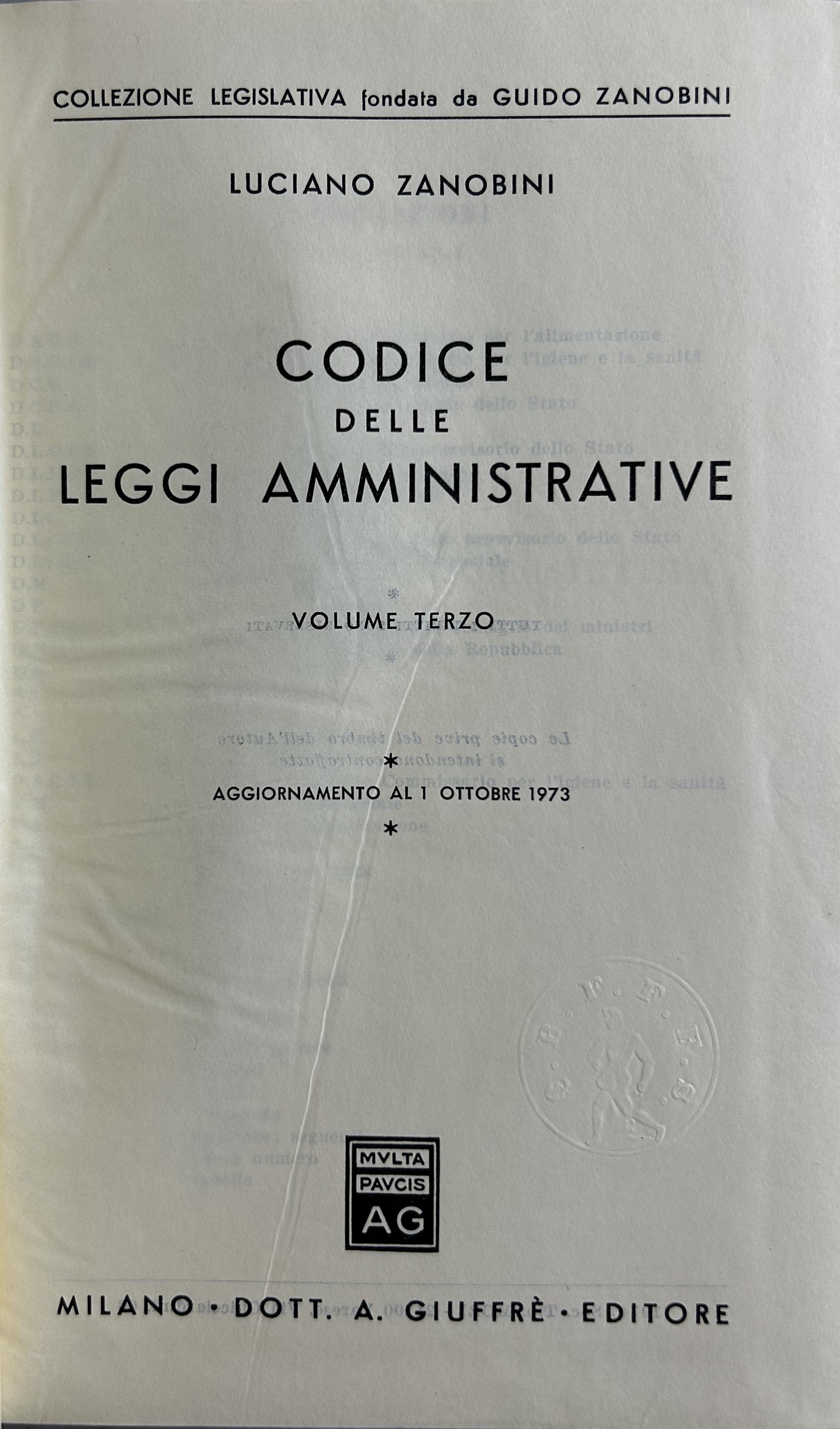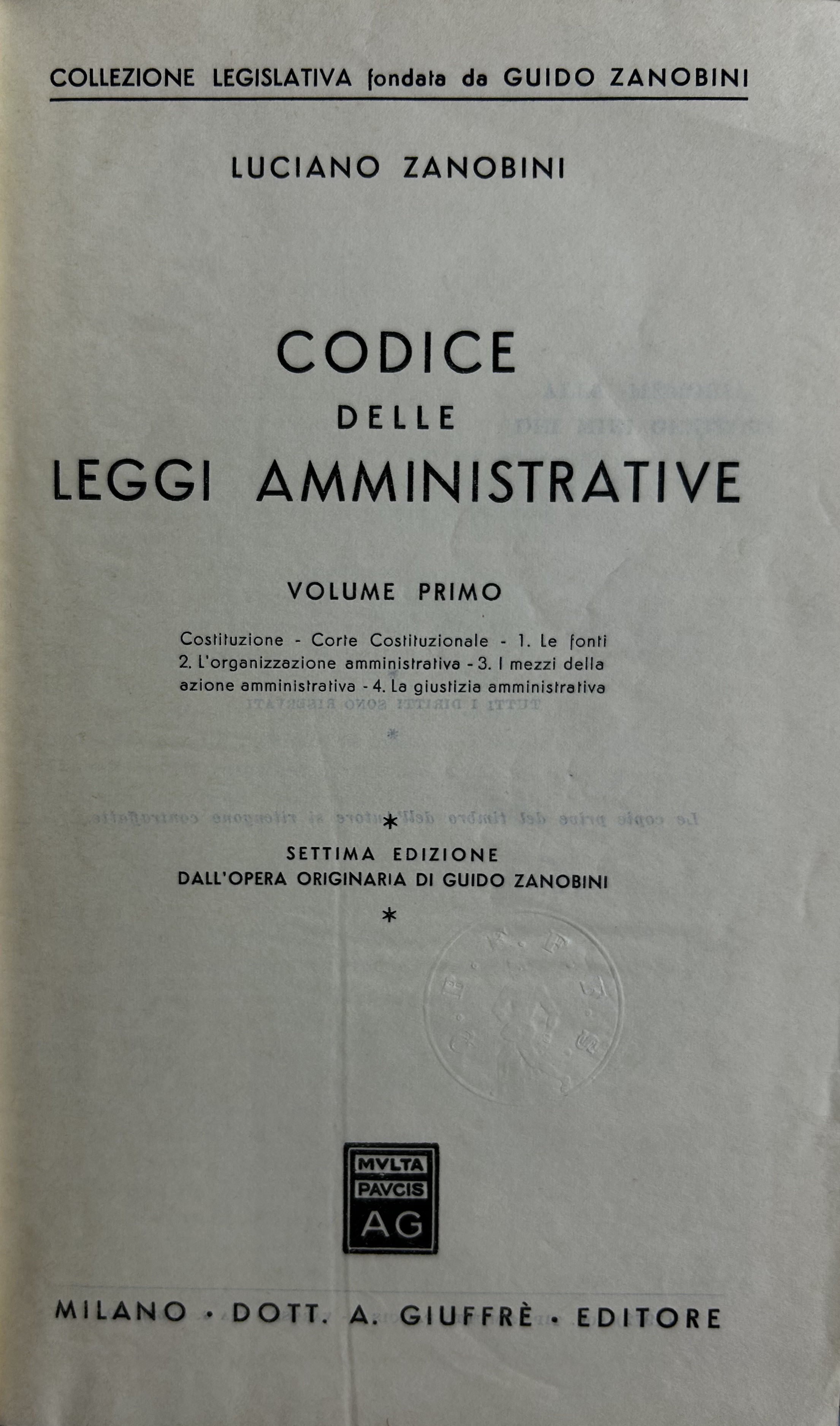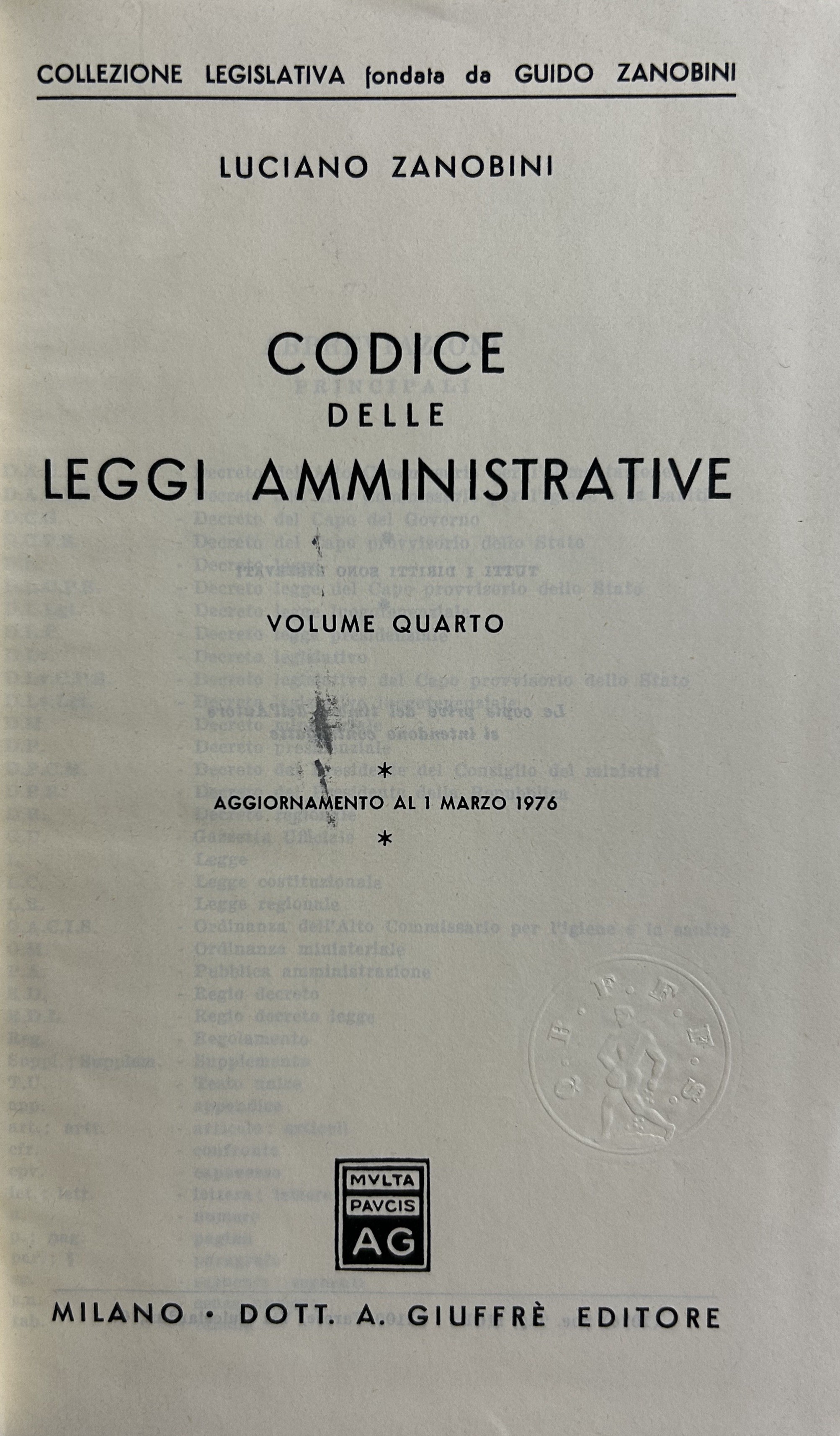 Codice delle leggi amministrative. Vol. I - Costituzione; Corte Costituzionale: 1 - Le fonti. 2 - L'organizzazione amministrativa. 3 - I mezzi della azione amministrativa. 4 - La giustizia amministrativa. Vol. II - 5 - Le principali manifestazioni dell'azione amministrativa. Vol. III - Aggiornamento al 1 ottobre 1973; Vol. IV - Aggiornamento al 1 marzo 1976. Vol. V - Aggiornamento al 1 luglio 1979
