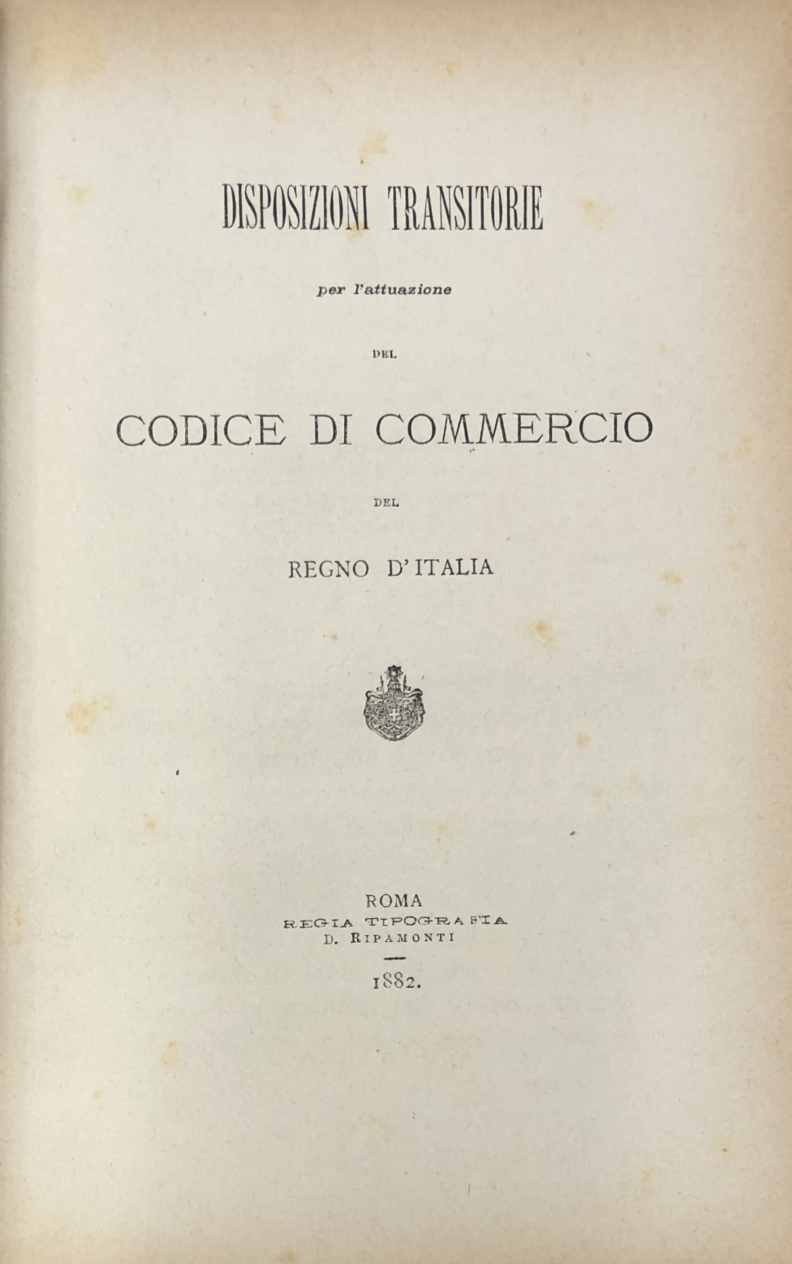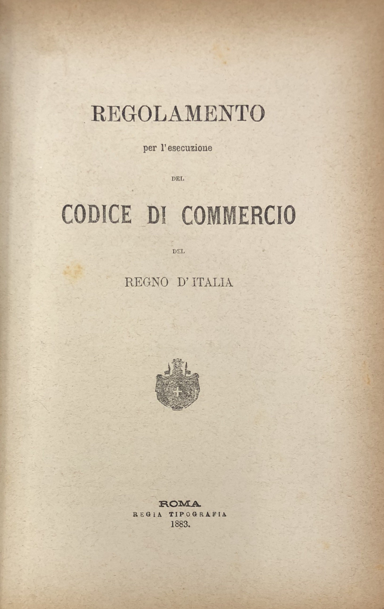 Codice di commercio del Regno d'Italia. UNITO A: Disposizioni transitorie per l'attuazione del Codice di commercio del Regno d'Italia. Roma, Regia Tipografia Ripamonti, 1882, pp. 15. UNITO A: Regolamento per l'esecuzione del Codice di commercio del Regno d'Italia. Roma, Regia Tipografia Ripamonti, 1883, pp. 5 + 69. UNITO A: Relazione a S.M. del Ministro Guardasigilli (G. Zanardelli)... Roma, Regia Tipografia, 1882, pp. XLIII