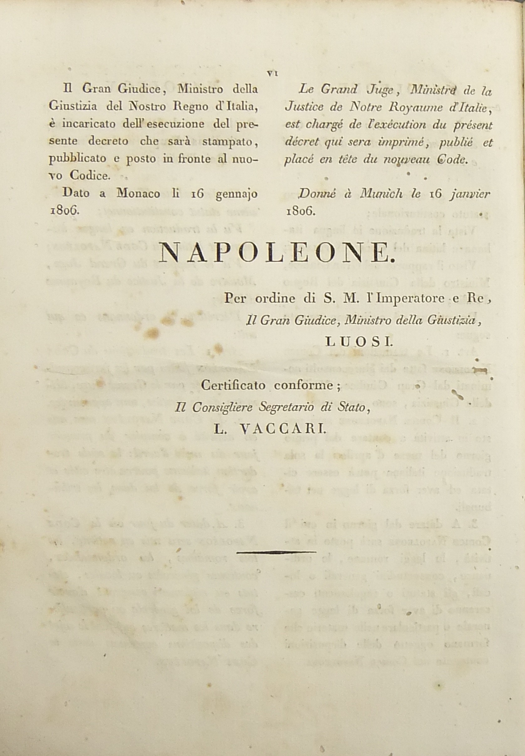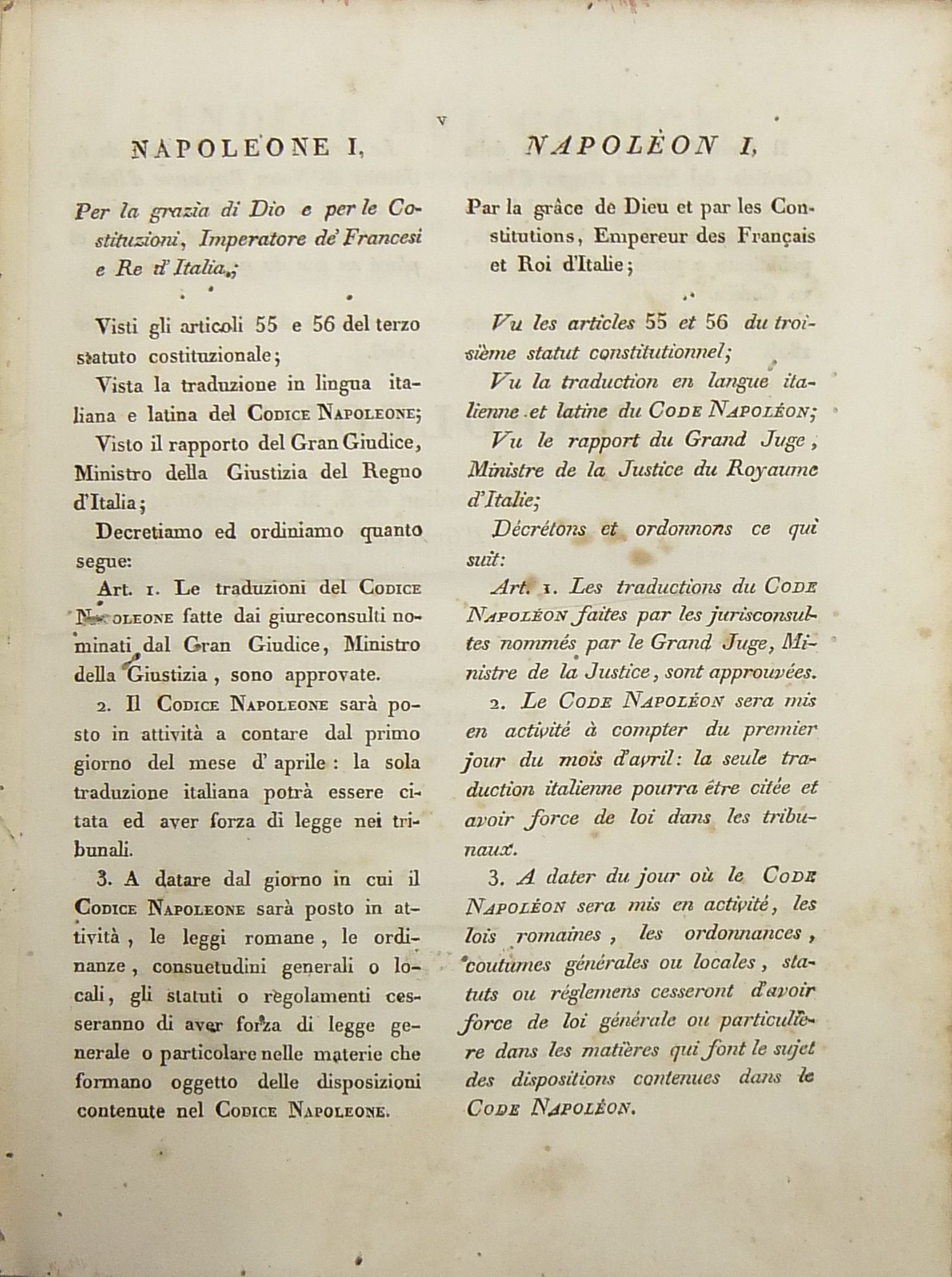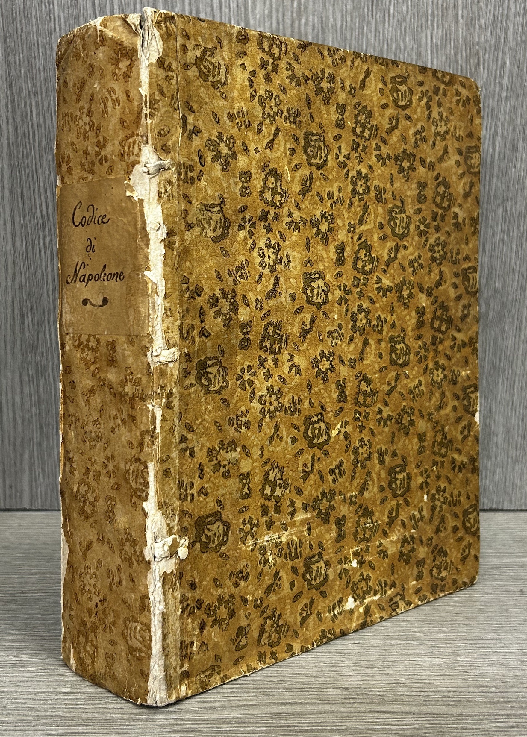 Edizione bilingue francese-italiano. Del Codice si erano avute le prime stampe già nel 1805 a Torino (presso Pane e Bocca 2 volumi in formato piccolo) e a Milano (presso Sonzogno 10 volumi di 21 cm circa di altezza). Dopo l’edizione ufficiale milanese stampata per cura di L. Nardini, direttore della Regia Stamperia, si ebbero altre stampe a Napoli, a Firenze e a Livorno tutte nello stesso 1806.