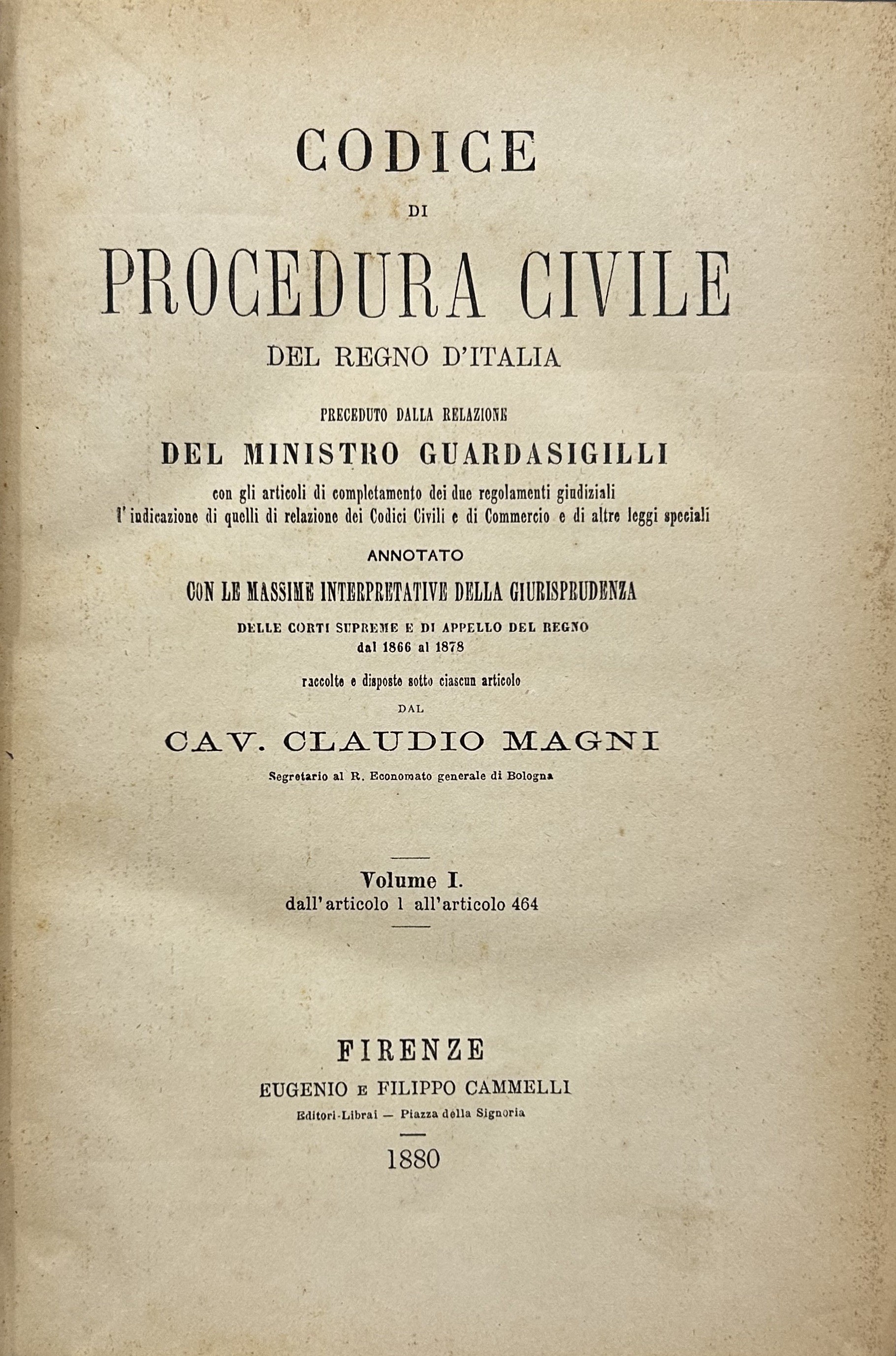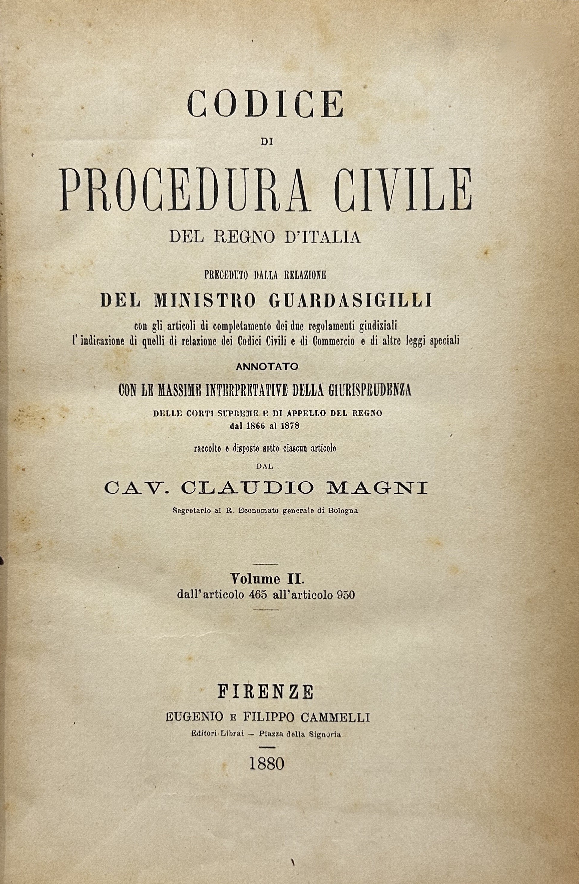 Codice di procedura civile del Regno d'Italia preceduto dalla Relazione del Ministro Guardasigilli con gli articoli di completamento dei due regolamenti giudiziali, l'indicazione di quelli di relazione dei Codici civili e di commercio e di altre leggi speciali annotato. Vol. I - Dall'articolo 1 all'articolo 464; Vol. II - Dall'articolo 465 all'articolo 950
