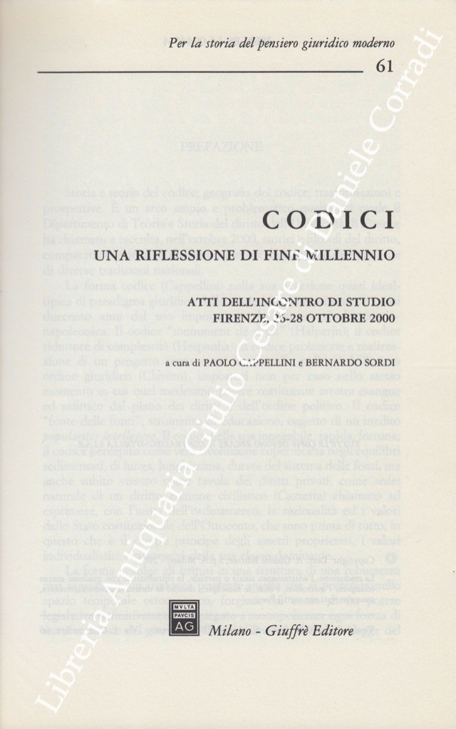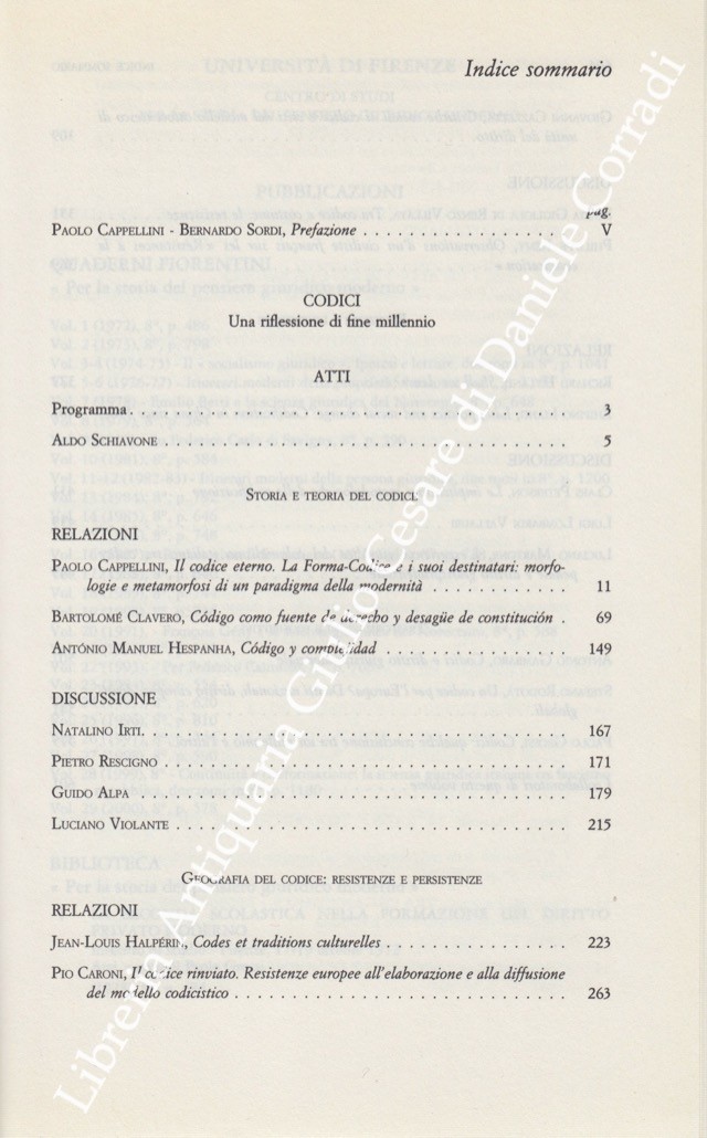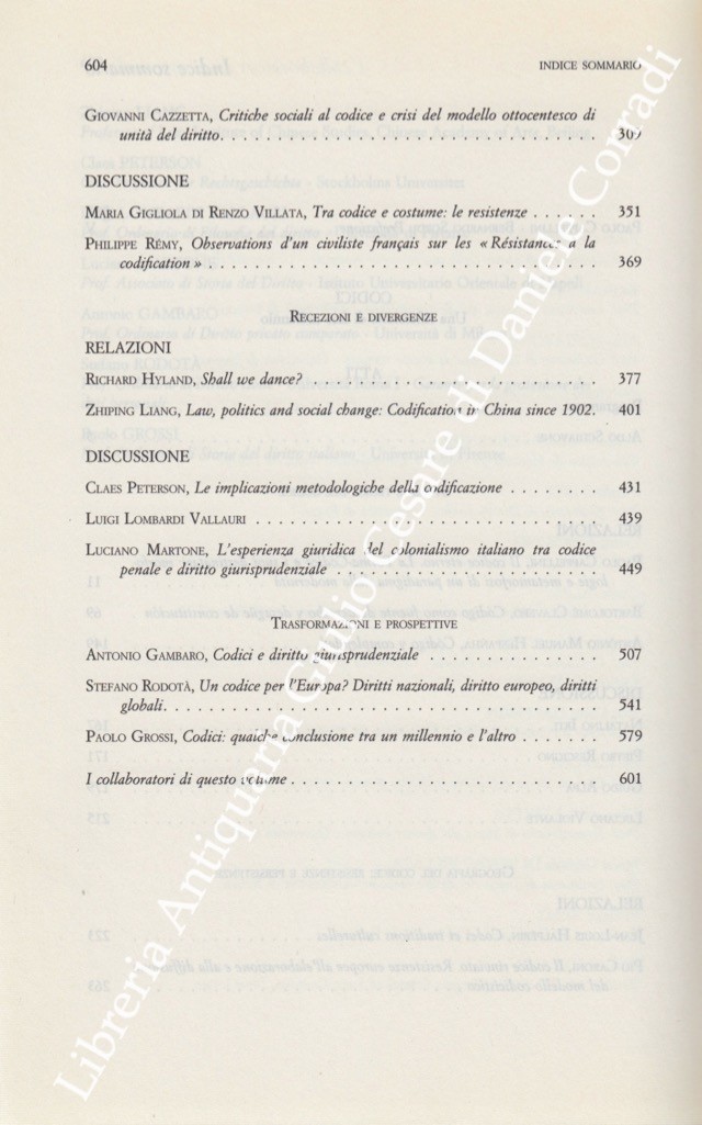 Scritti di: Alpa, Cappellini, Caroni, Cazzetta, Clavero, Di Renzo Villata, Gambaro, Grossi, Halperin, Hespanha, Hyland, Irti, Liang, Lombardi Vallauri, Martone, Peterson, Remy, Rescigno, Rodotà , Schiavone, Sordi, Violante