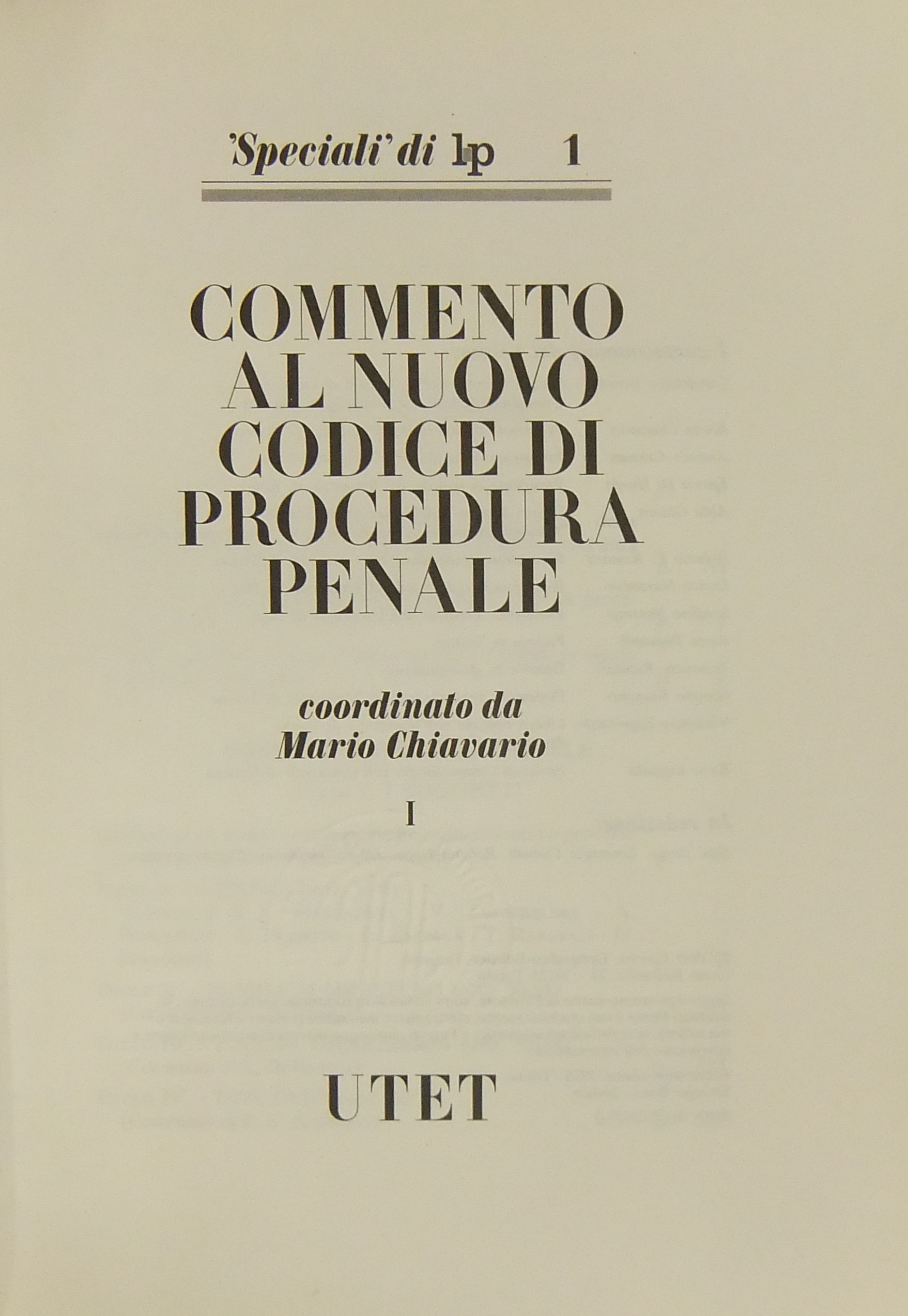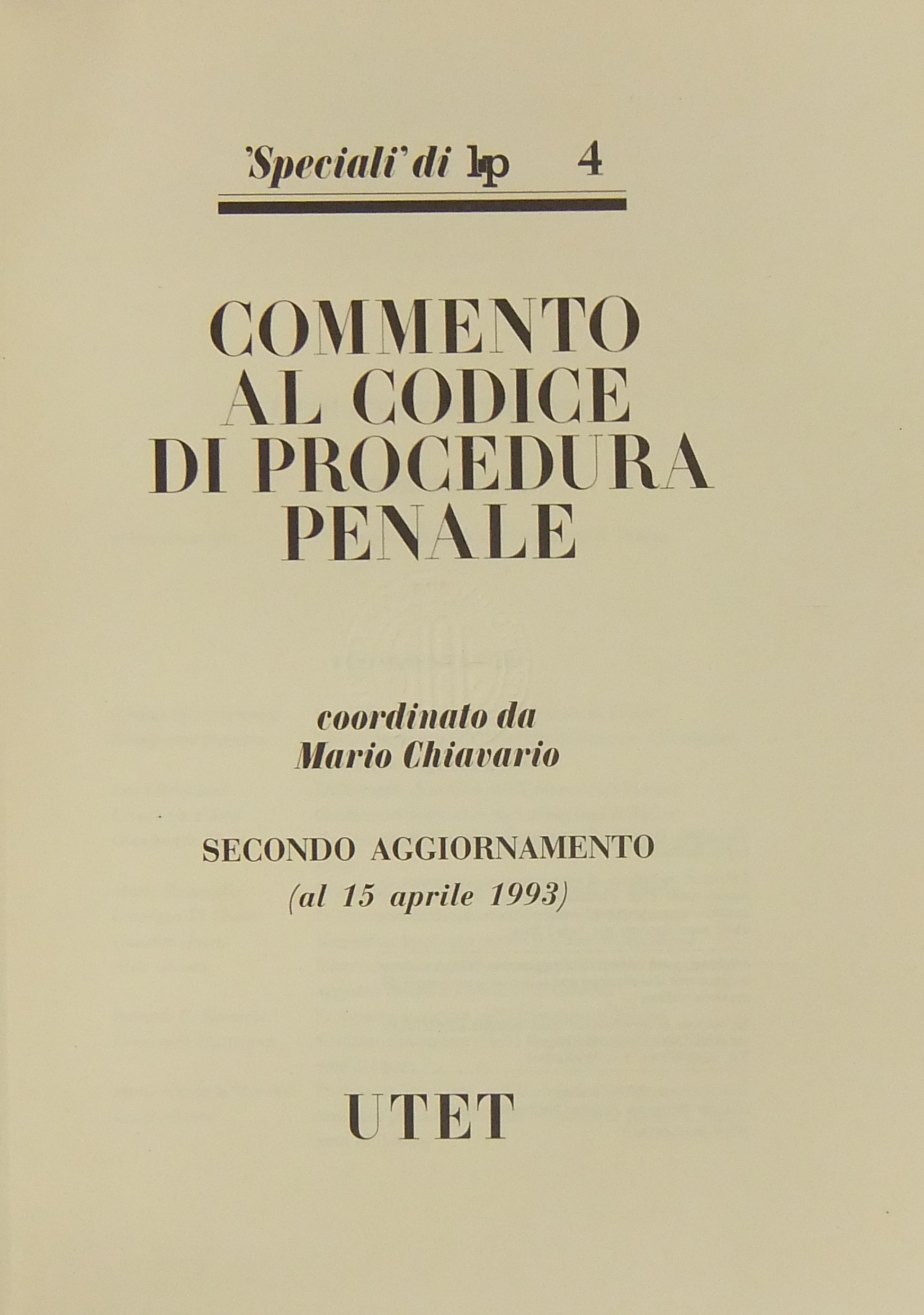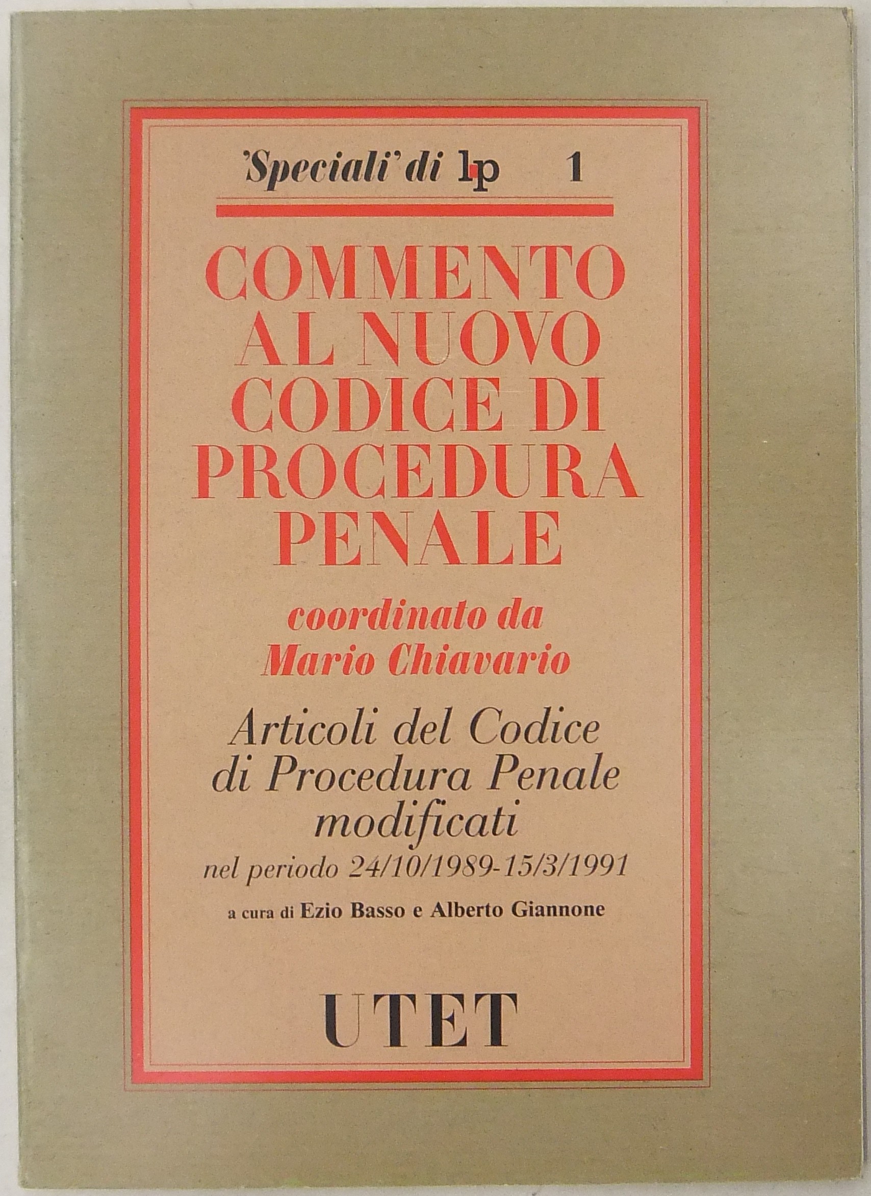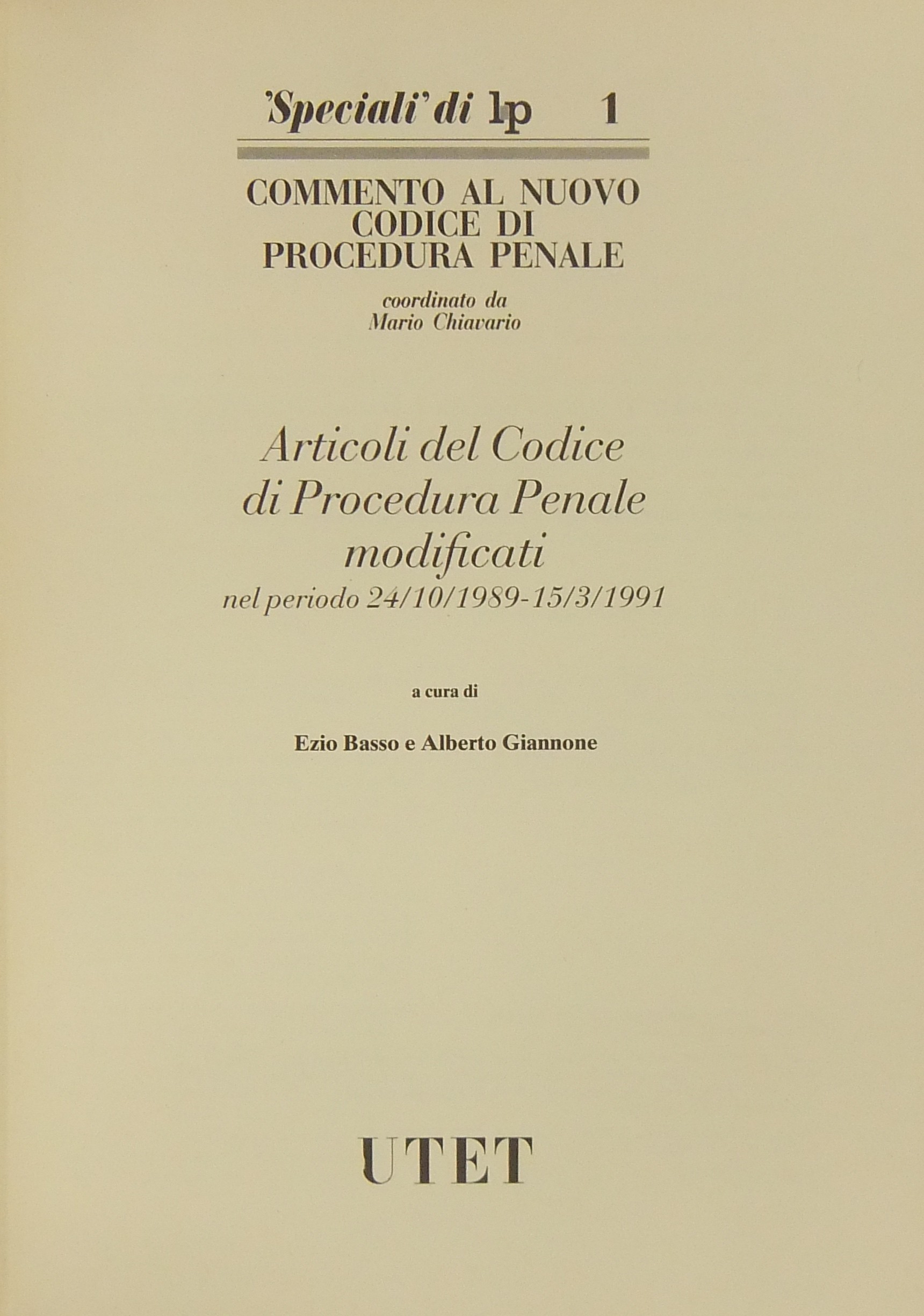 Commento al nuovo codice di procedura penale. Vol. I - artt. 1-108. Vol. II - artt. 109-271. Vol. III - artt. 272-325. Vol. IV - artt. 326-464. Vol. V - artt. 465-567. Vol. VI - artt. 568-746. Bibliografia e indici. Articoli del Codice di procedura penale modificati nel periodo 24/10/1989-15/03/1991 a cura di Ezio Basso e Alberto Giannone. Primo aggiornamento (al 1° giugno 1992). Secondo aggiornamento (al 15 aprile 1993)
