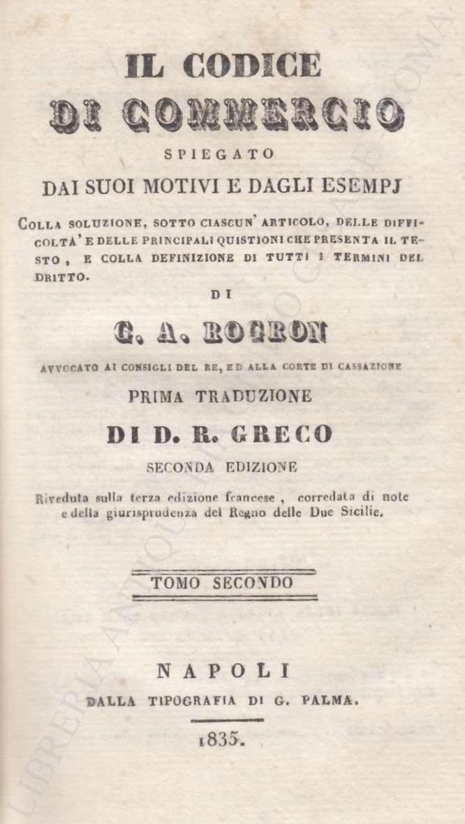 Il Codice di Commercio spiegato dai suoi motivi e dagli esempj. Colla soluzione, sotto ciascun'articolo, delle difficoltà e delle principali quistioni che presenta il testo, e colla definizione di tutti i termini del dritto. Tomo primo Tomo secondo