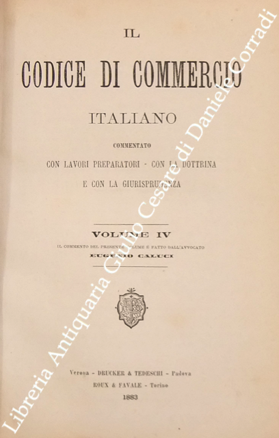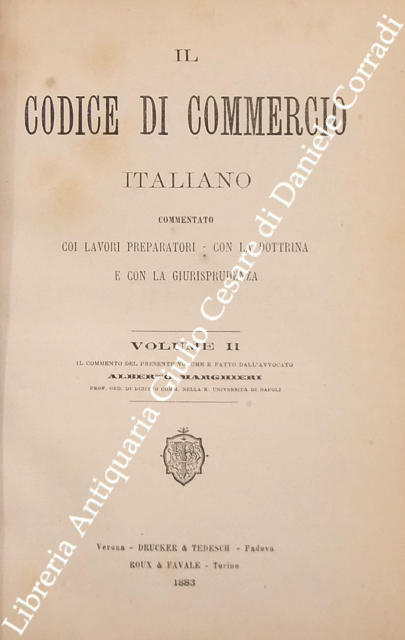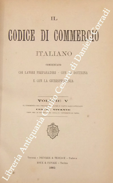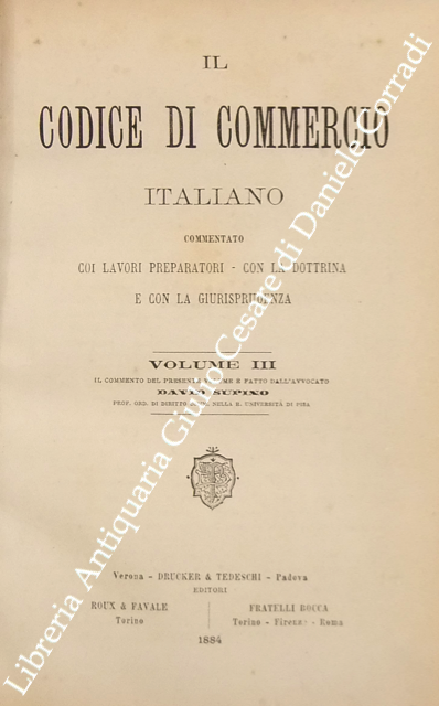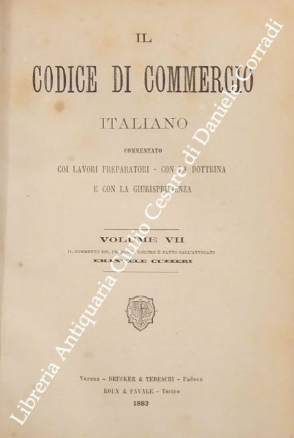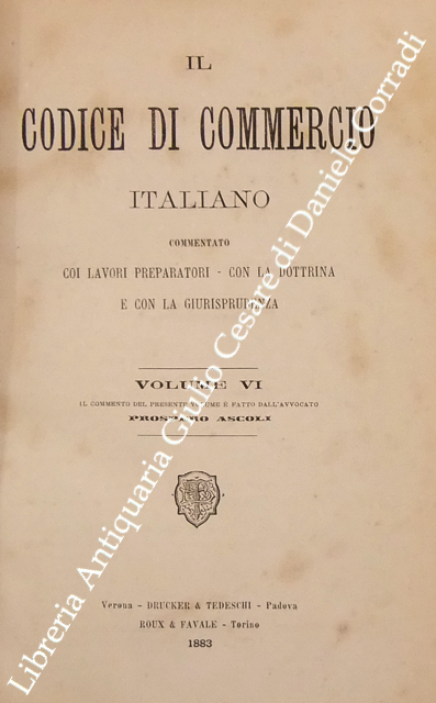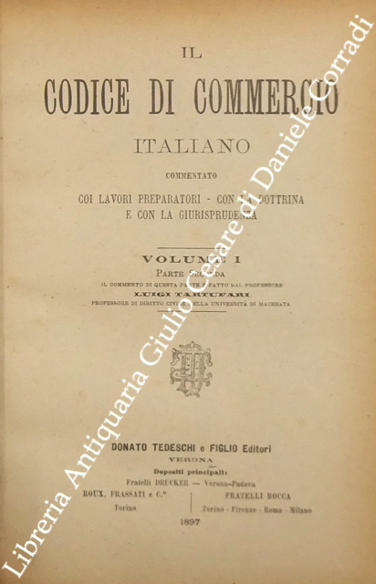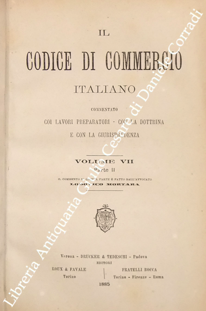 Il codice di commercio italiano commentato coi lavori preparatori, con la dottrina e con la giurisprudenza. Vol. I, parte I - Commento di L. Bolaffio; Vol. I, parte II - Commento di L. Tartufari; Vol. II - Commento di A. Marghieri; Vol. III - Commento di D. Supino; Vol. IV - Commento di E. Caluci; Vol. V - Commento di C. Vivante; Vol. VI - Commento di P. Ascoli; Vol. VII, parte I - Commento di E. Cuzzeri; Vol. VII, parte II - Commento di L. Mortara + Appendice
