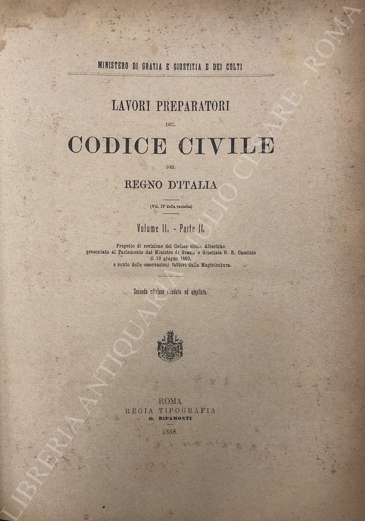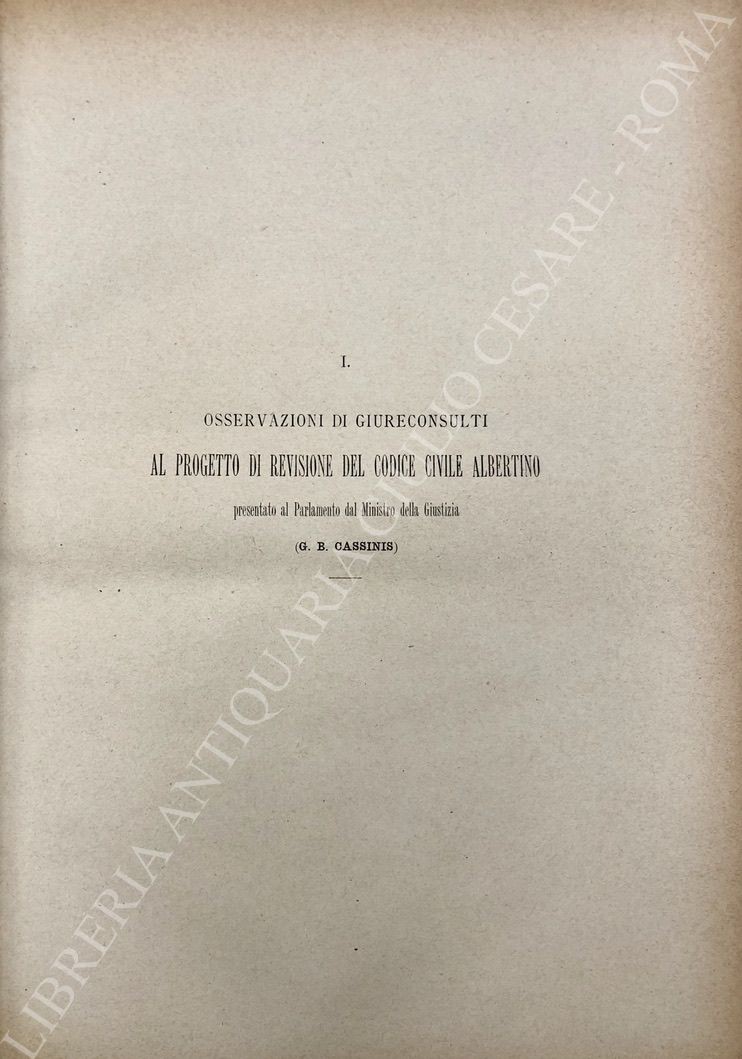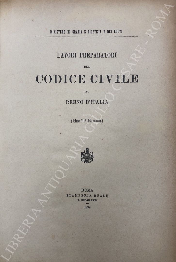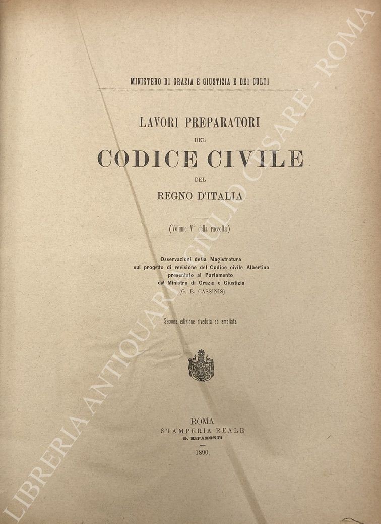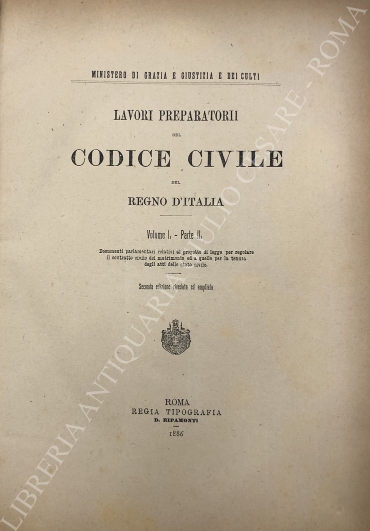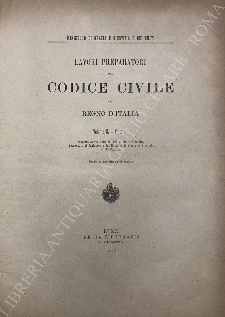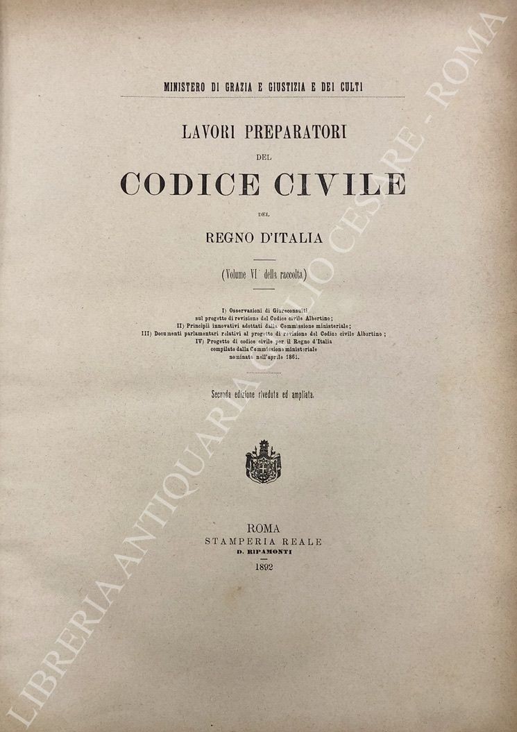 Lavori preparatorii del Codice civile del Regno d'Italia. Vol. I,1 - Studi e documenti parlamentari relativi al progetto di legge sul matrimonio; Vol. I,2 - Documenti parlamentari relativi al progetto di legge per regolare il contratto civile di matrimonio ed a quello per la tenuta degli atti dello stato civile; Vol. II,1 - Progetto di revisione del Codice civile Albertino presentato al Parlamento dal Ministro di Grazia e Giustizia G.B. Cassinis; Vol. II,2 - Progetto di revisione del Codice civile Albertino presentato al Parlamento dal Ministro di Grazia e Giustizia G.B. Cassinis il 19 giigno 1860, e sunto delle osservazioni fattevi dalla Magistratura; Vol. V - Osservazioni della Magistratura sul progetto di revisione del Codice civile Albertino presentato al Parlamento dal Ministro di Grazia e Giustizia (G.B. Cassinis); Vol. VI - I - Osservazioni di Giureconsulti sul progetto di revisione del Codice civile Albertino; II - Principii innovativi adottati dalla Commissione ministeriale; III - Documenti parlamentari relativi al progetto di revisionedel Codice civile Albertino; IV - Progetto di codice civile per il Regno d'Italia compilato dalla Commissione ministeriale nominata nell'aprile 1861. Vol. VIII - Osservazioni al Progetto di codice civile del Regno d'Italia presentato alla camera dei Senatori dal Ministro della giustizia On. Vincenzo Miglietti nella tornata in data 9 gennaio 1862