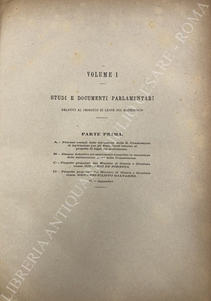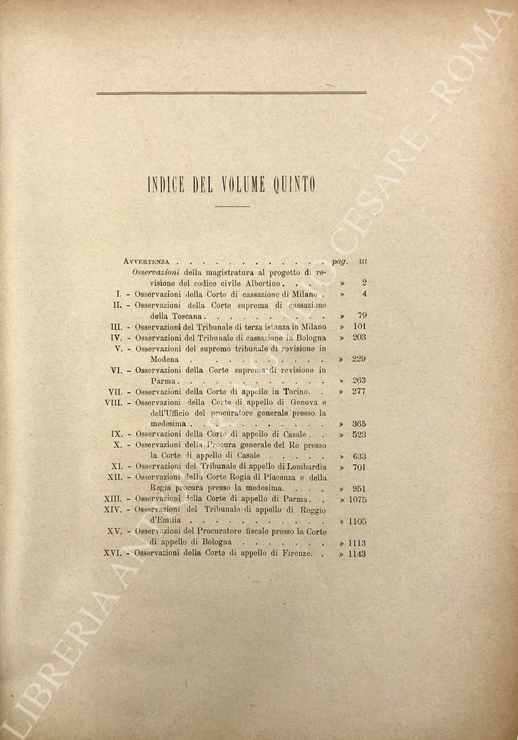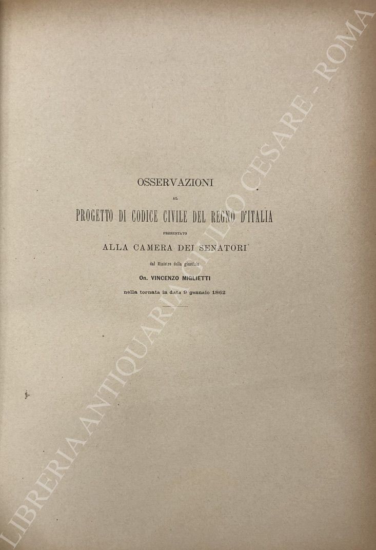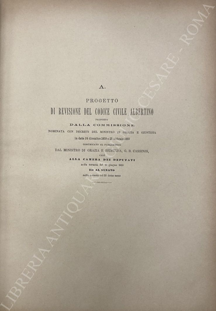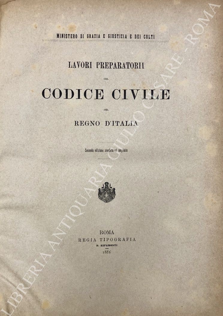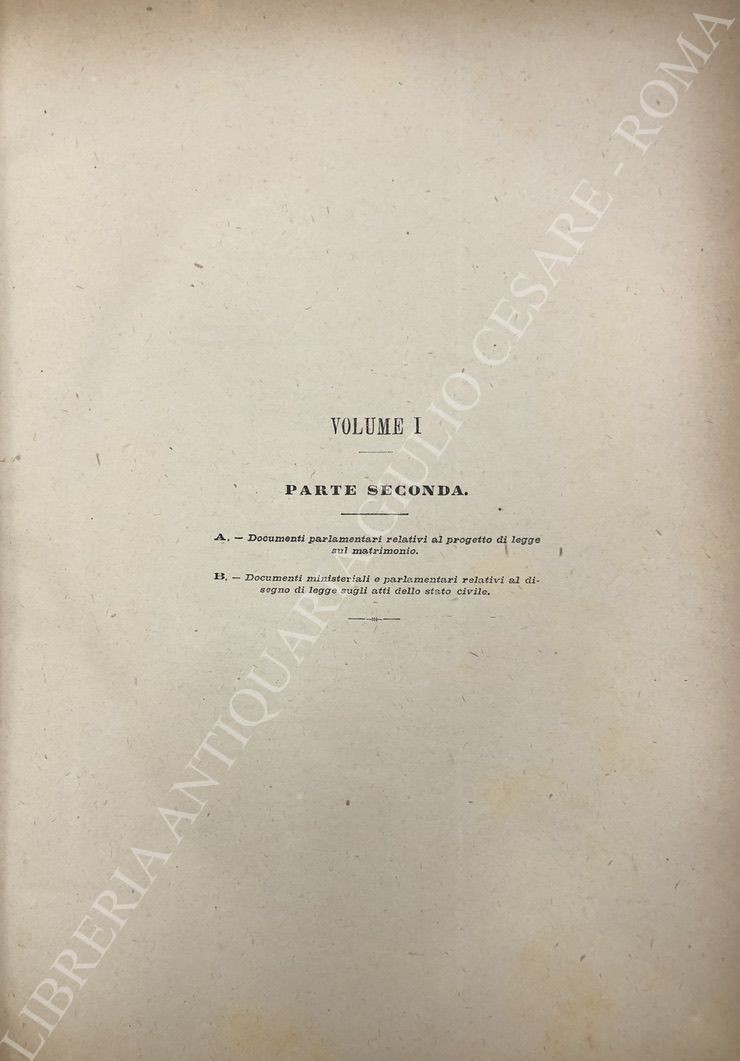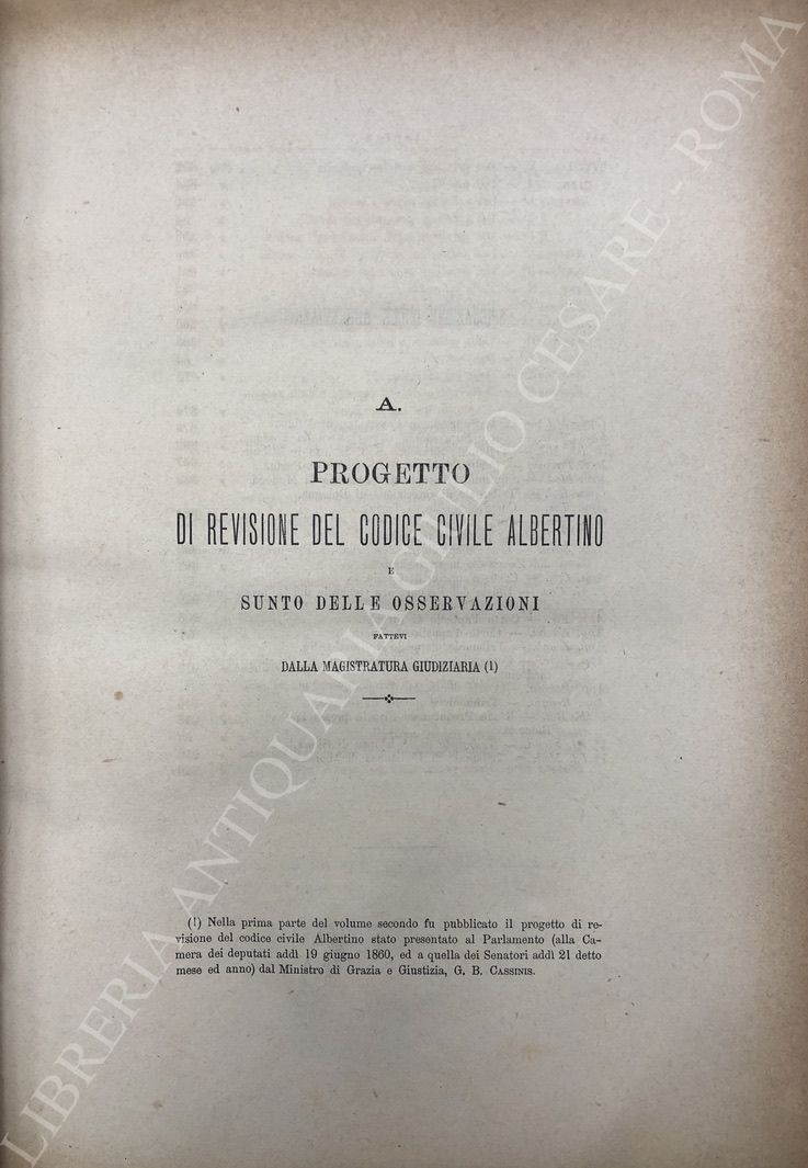 Lavori preparatorii del Codice civile del Regno d'Italia. Vol. I,1 - Studi e documenti parlamentari relativi al progetto di legge sul matrimonio; Vol. I,2 - Documenti parlamentari relativi al progetto di legge per regolare il contratto civile di matrimonio ed a quello per la tenuta degli atti dello stato civile; Vol. II,1 - Progetto di revisione del Codice civile Albertino presentato al Parlamento dal Ministro di Grazia e Giustizia G.B. Cassinis; Vol. II,2 - Progetto di revisione del Codice civile Albertino presentato al Parlamento dal Ministro di Grazia e Giustizia G.B. Cassinis il 19 giigno 1860, e sunto delle osservazioni fattevi dalla Magistratura; Vol. V - Osservazioni della Magistratura sul progetto di revisione del Codice civile Albertino presentato al Parlamento dal Ministro di Grazia e Giustizia (G.B. Cassinis); Vol. VI - I - Osservazioni di Giureconsulti sul progetto di revisione del Codice civile Albertino; II - Principii innovativi adottati dalla Commissione ministeriale; III - Documenti parlamentari relativi al progetto di revisionedel Codice civile Albertino; IV - Progetto di codice civile per il Regno d'Italia compilato dalla Commissione ministeriale nominata nell'aprile 1861. Vol. VIII - Osservazioni al Progetto di codice civile del Regno d'Italia presentato alla camera dei Senatori dal Ministro della giustizia On. Vincenzo Miglietti nella tornata in data 9 gennaio 1862