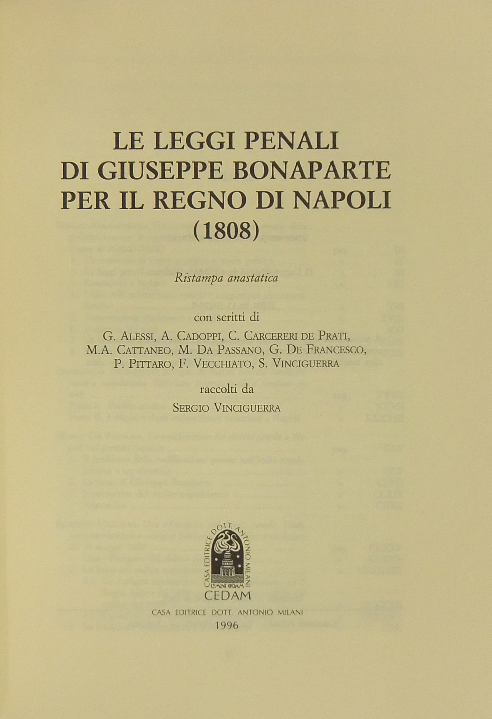 Le leggi penali di Giuseppe Bonaparte per il Regno di Napoli (1808). Con scritti di G. Alessi, A. Cadoppi, C. Carcereri De Prati, M. A. Cattaneo, M. Da Passano, G. De Francesco, P. Pittaro, F. Vecchiato, S. Vinciguerra. Raccolti da Sergio Vinciguerra.