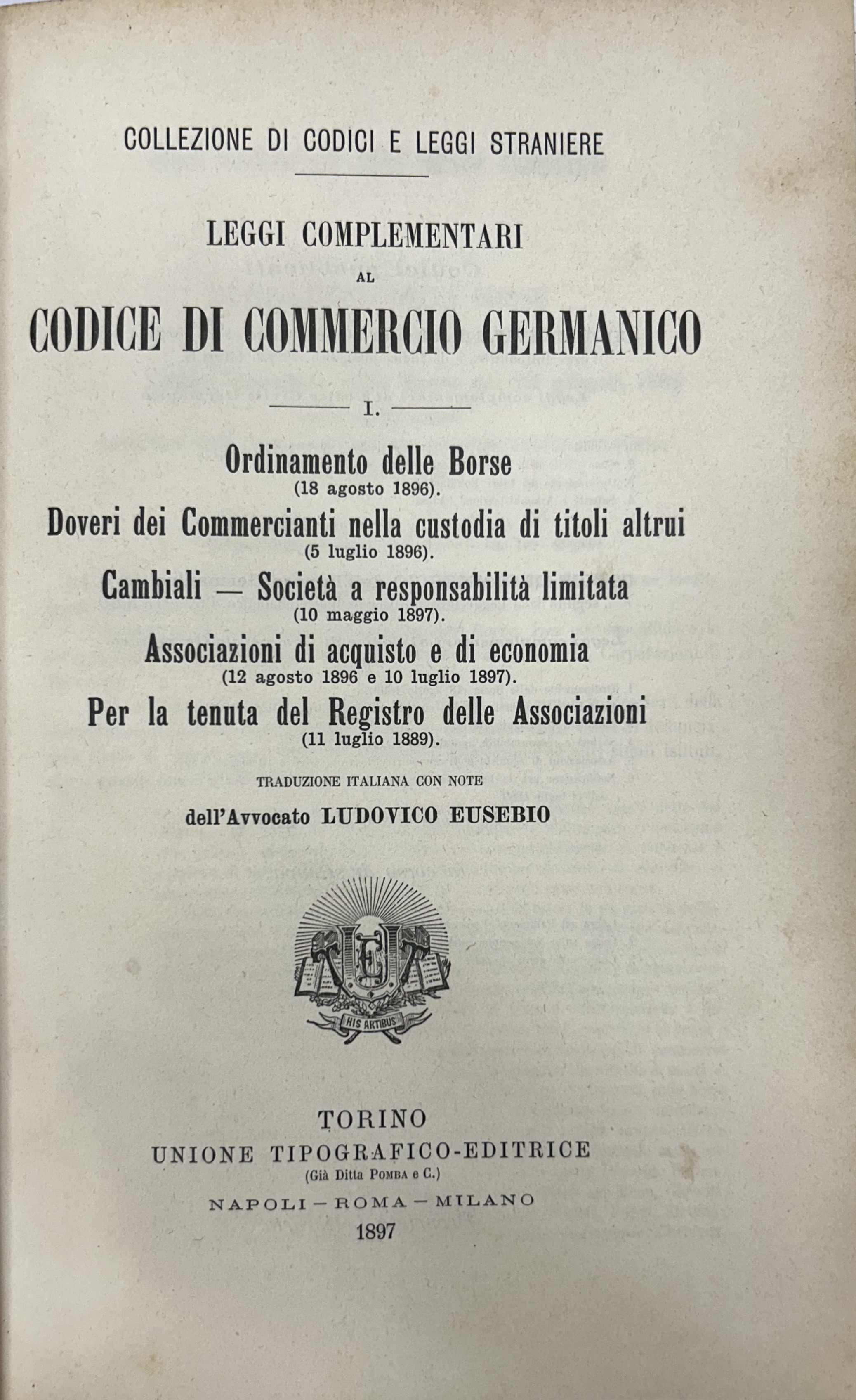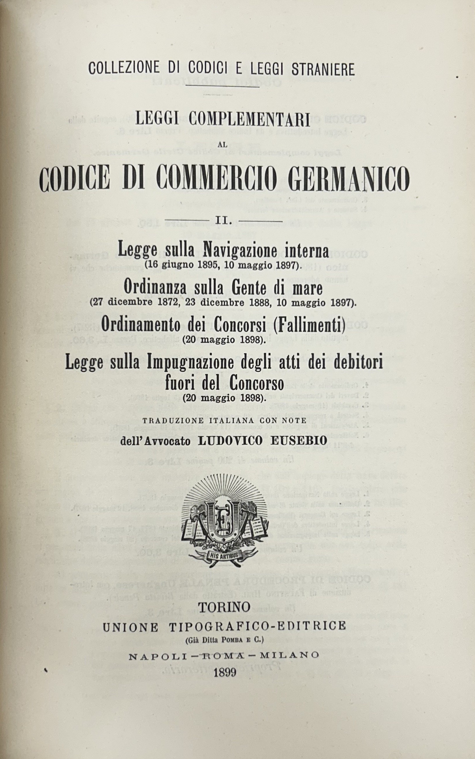 Leggi complementari al Codice di commercio germanico. Vol. I - Ordinamento delle Borse (18 agosto 1896). Doveri dei commercianti nella custodia dei titoli altrui (5 luglio 1896). Cambiali; Società a responsabilità limitata (10 maggio 1896). Associazioni di acquisto e di economia (12 agosto 1896 e 10 luglio 1897). Per la tenuta del Registro delle Assicurazioni (11 luglio 1889). Vol. II - Legge sulla navigazione interna (16 giugno 1895, 10 maggio 1897). Ordinanza sulla gente di mare (27 dicembre 1872, 23 dicembre 1888, 10 maggio 1897). Ordinamento dei concorsi (fallimenti) (20 maggio 1898). Legge sulla impugnazione degli atti dei debitori fuori del concorso (20 maggio 1898). Traduzione italiana con note dell'Avvocato Ludovico Eusebio