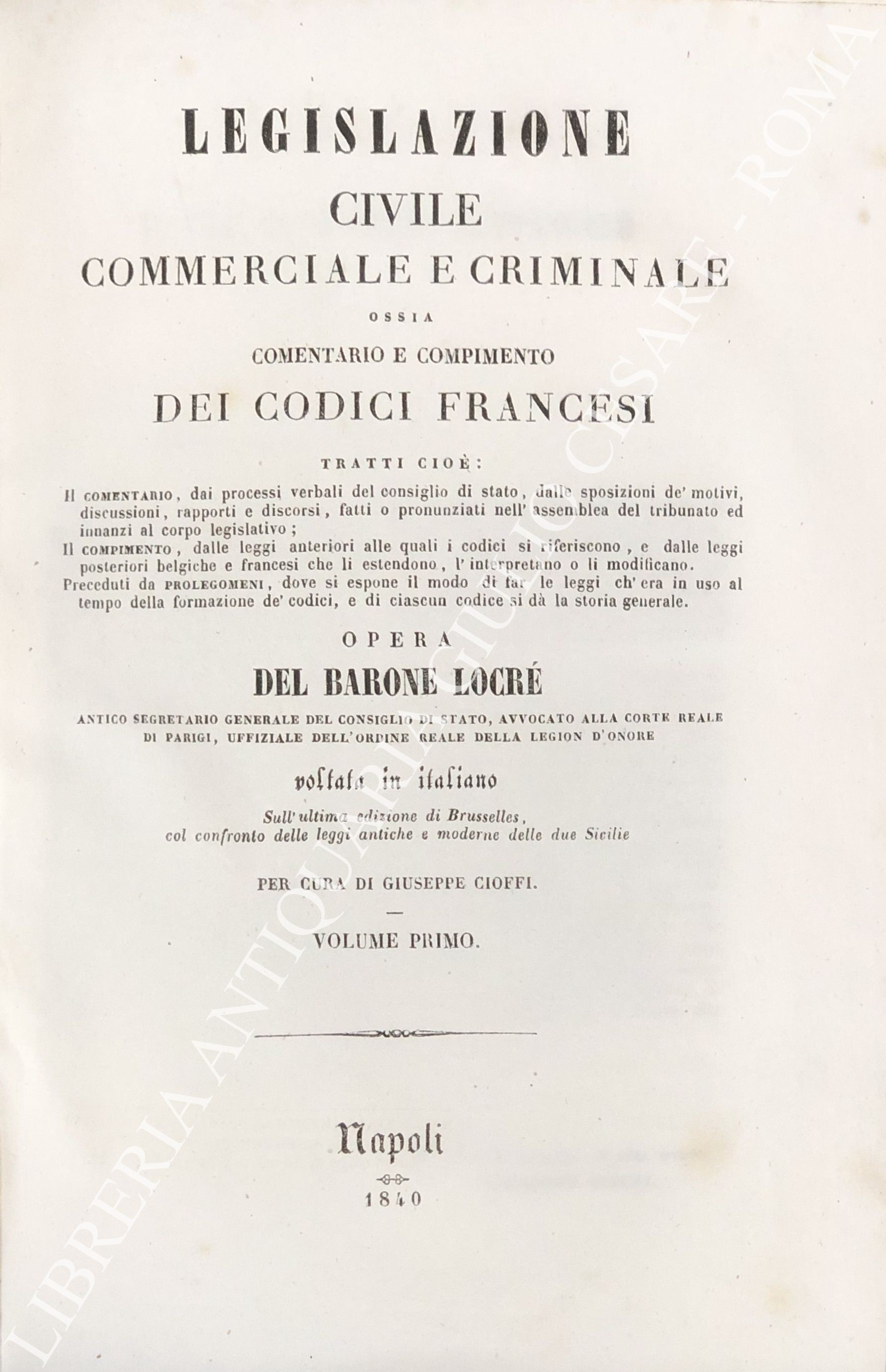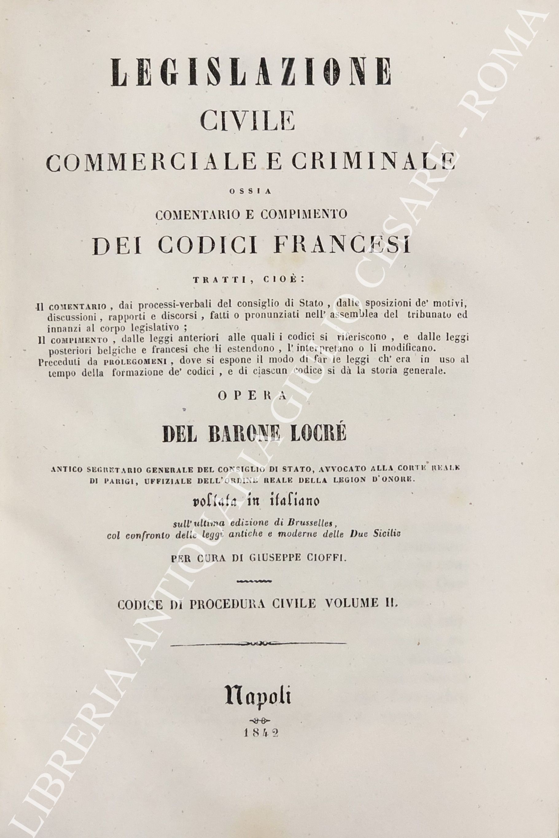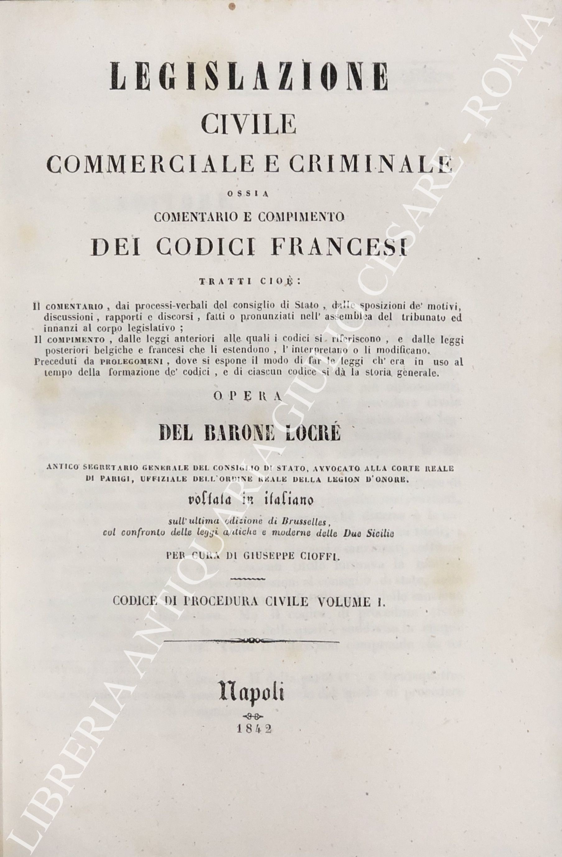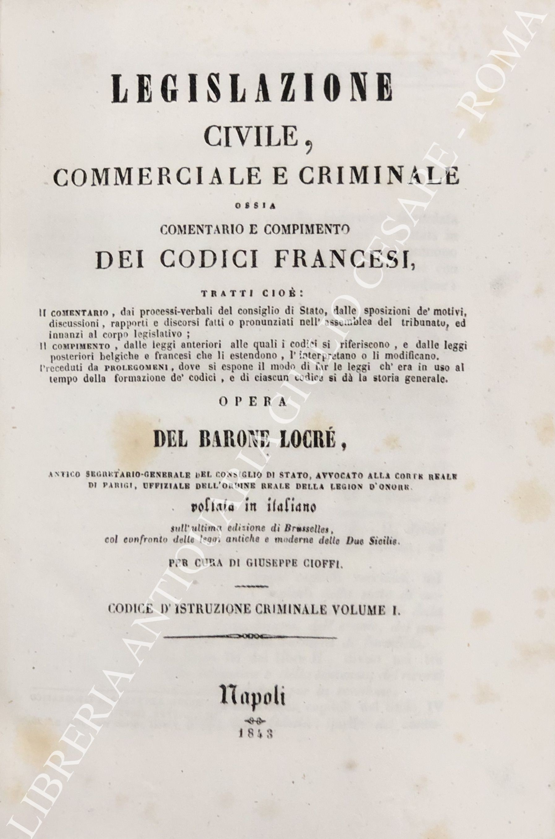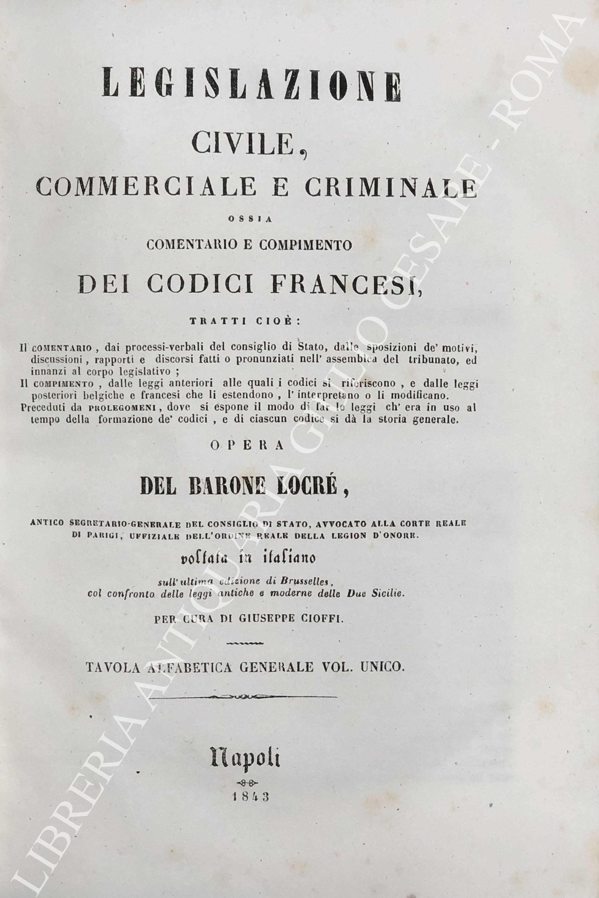 Legislazione civile, commerciale e criminale ossia comentario e compimento dei Codici francesi. Tratti cioè: Il comentario, dai processi verbali del consiglio di Stato, dalle sposizioni de' motivi, discussioni, rapporti e discorsi, fatti o pronunziati nell'assemblea del tribunato ed innanzi al corpo legislativo; Il compimento, dalle leggi anteriori alle quali i codici si riferiscono, e dalle leggi posteriori belgiche e francesi che li estendono, l'interpretano o li modificano. ... Sull'ultima edizione di Brusseles, col confronto delle leggi antiche e moderne delle due Sicilie per cura di Giuseppe Cioffi. Voll. I-VIII - Codice civile. Voll. IX-X - Codice di procedura civile. Voll. XI-XII - Codice di commercio. Voll. XII-XIV - Codice d'istruzione criminale. Vol. XV - Codice penale. Vol. XVI - Tavola alfabetica generale delle materie