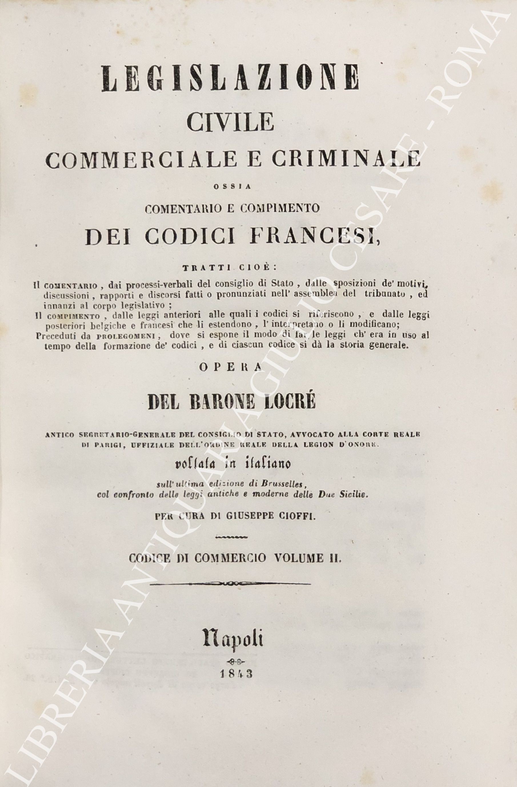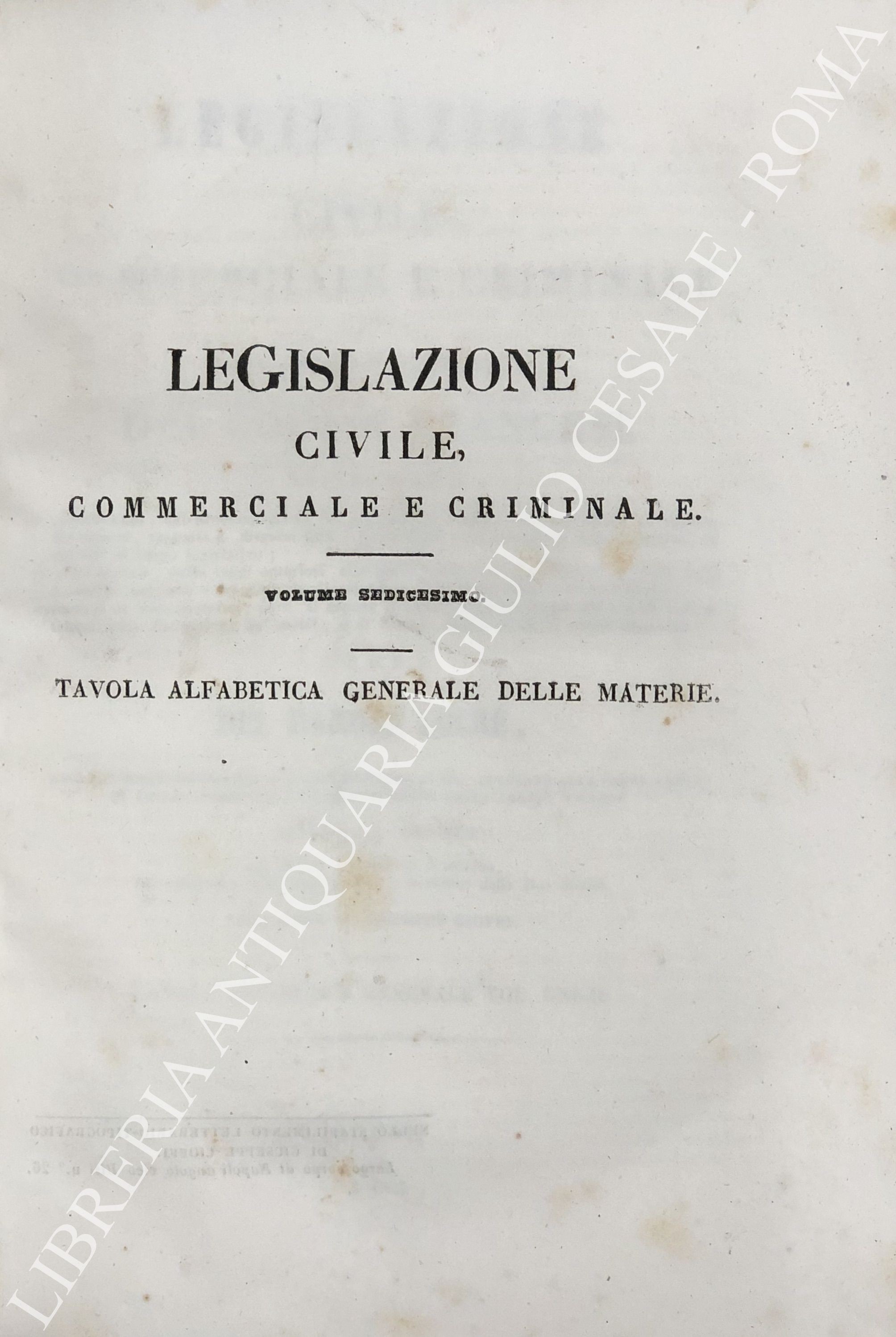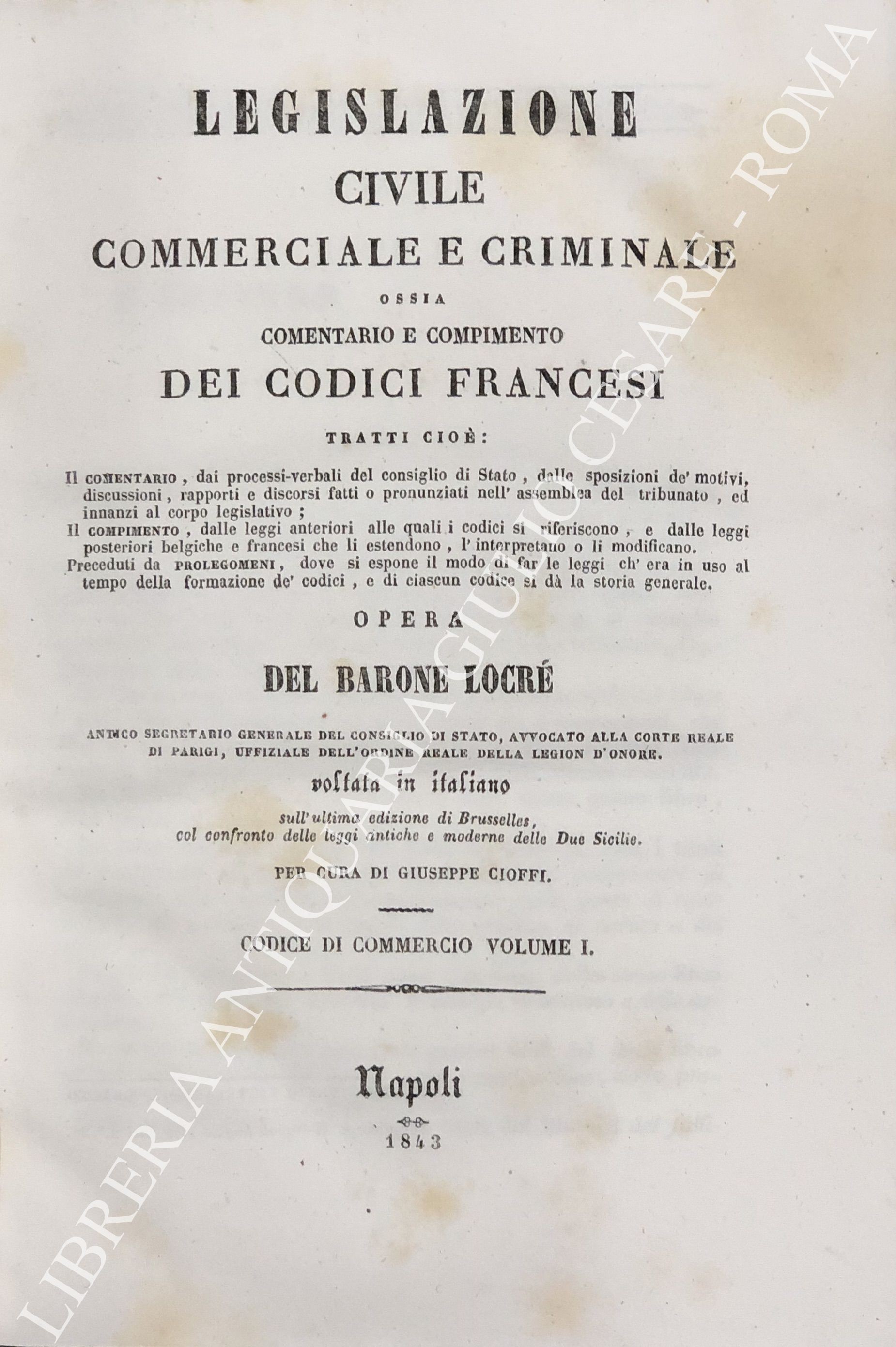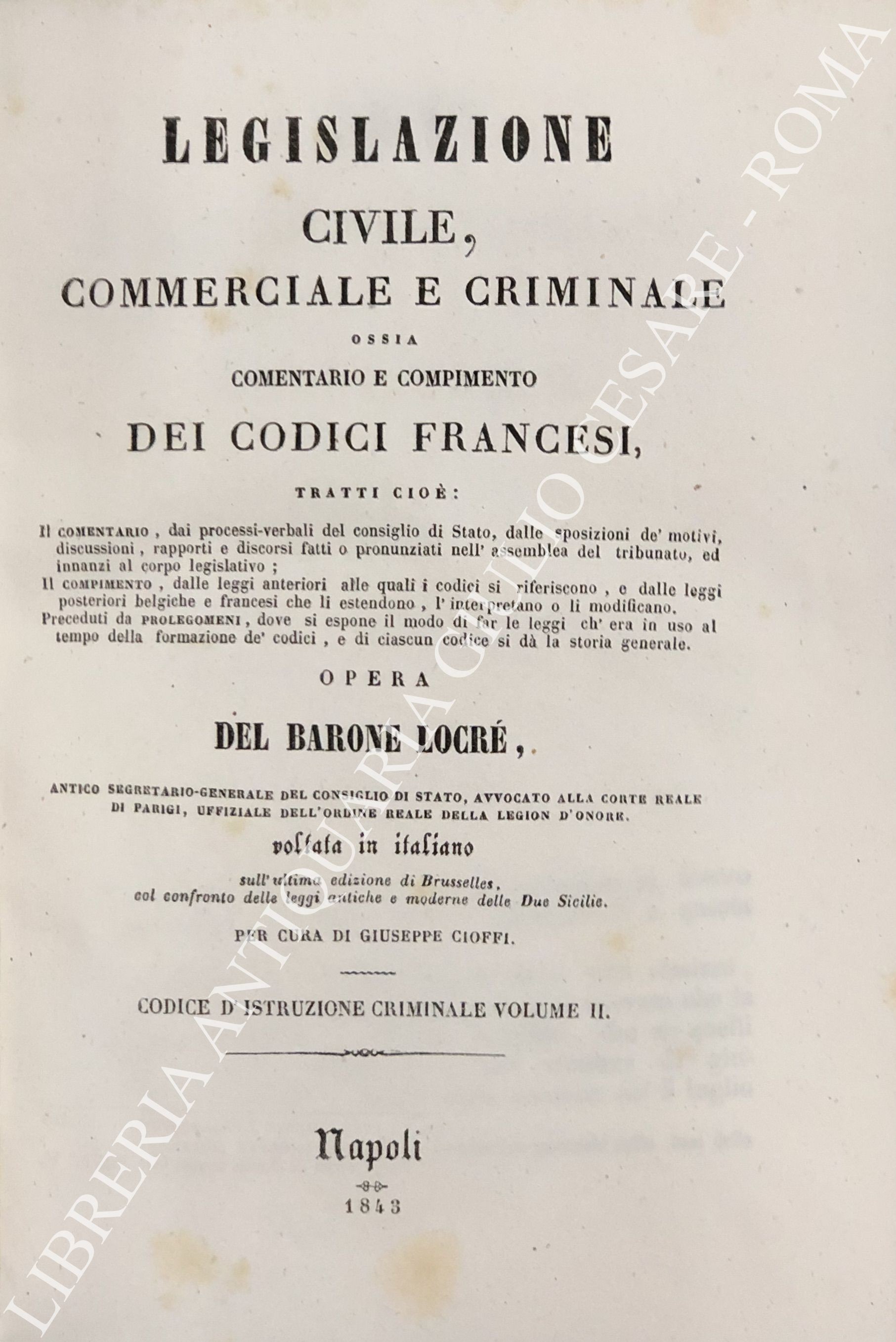 Legislazione civile, commerciale e criminale ossia comentario e compimento dei Codici francesi. Tratti cioè: Il comentario, dai processi verbali del consiglio di Stato, dalle sposizioni de' motivi, discussioni, rapporti e discorsi, fatti o pronunziati nell'assemblea del tribunato ed innanzi al corpo legislativo; Il compimento, dalle leggi anteriori alle quali i codici si riferiscono, e dalle leggi posteriori belgiche e francesi che li estendono, l'interpretano o li modificano. ... Sull'ultima edizione di Brusseles, col confronto delle leggi antiche e moderne delle due Sicilie per cura di Giuseppe Cioffi. Voll. I-VIII - Codice civile. Voll. IX-X - Codice di procedura civile. Voll. XI-XII - Codice di commercio. Voll. XII-XIV - Codice d'istruzione criminale. Vol. XV - Codice penale. Vol. XVI - Tavola alfabetica generale delle materie