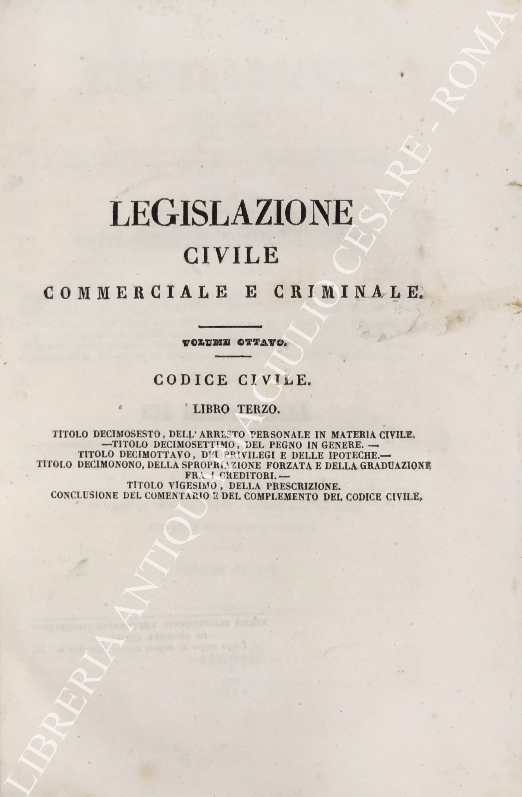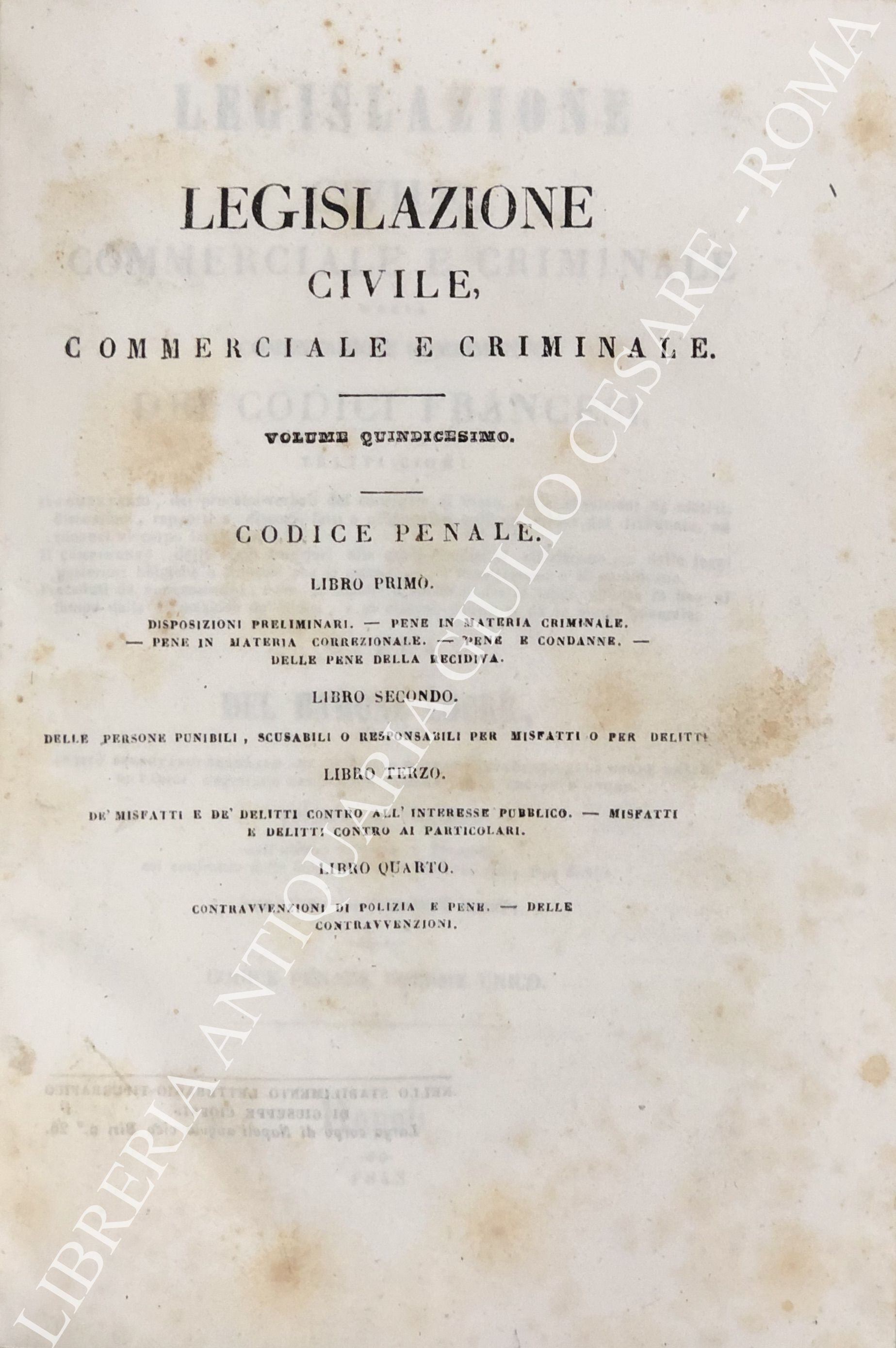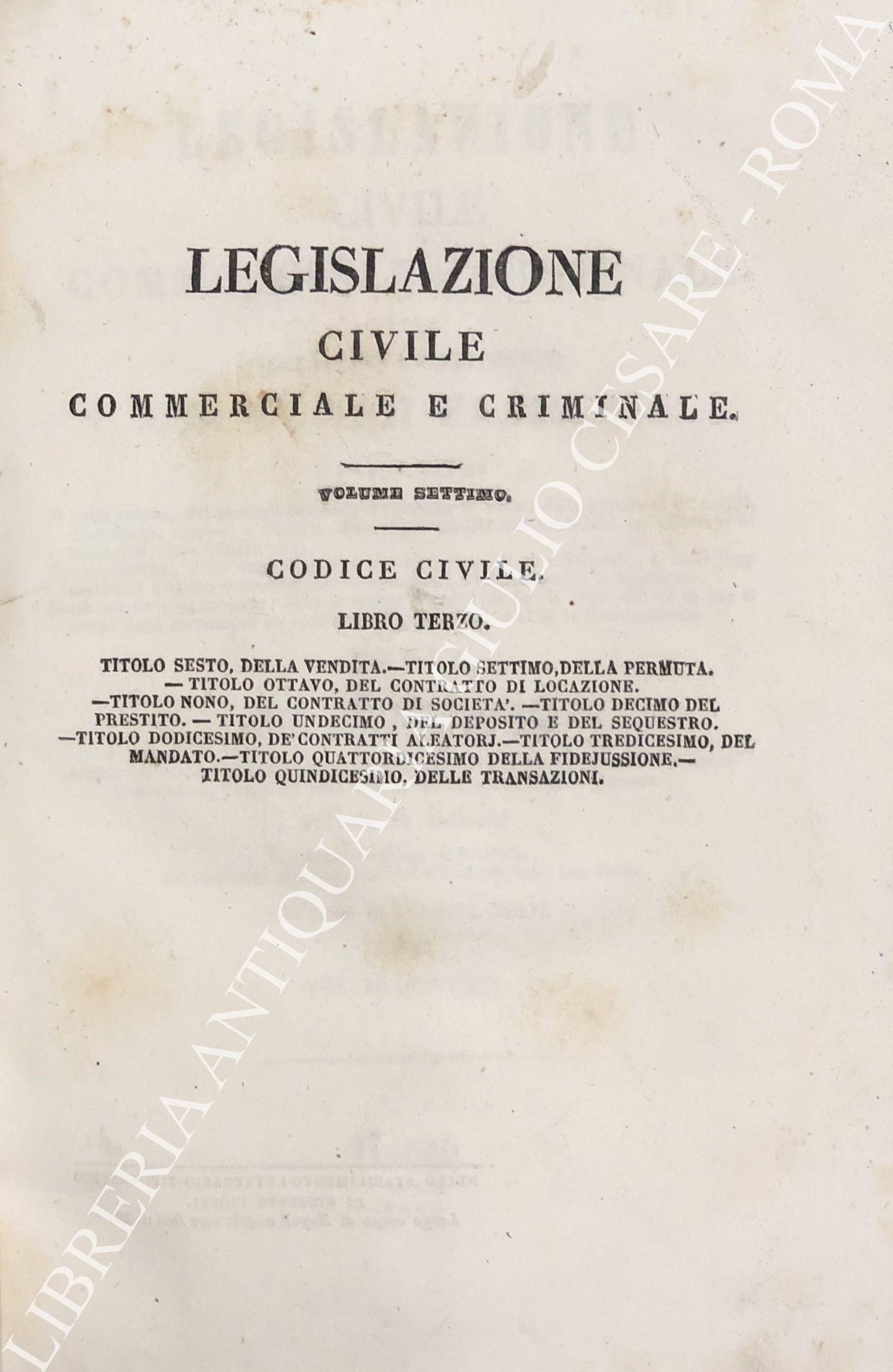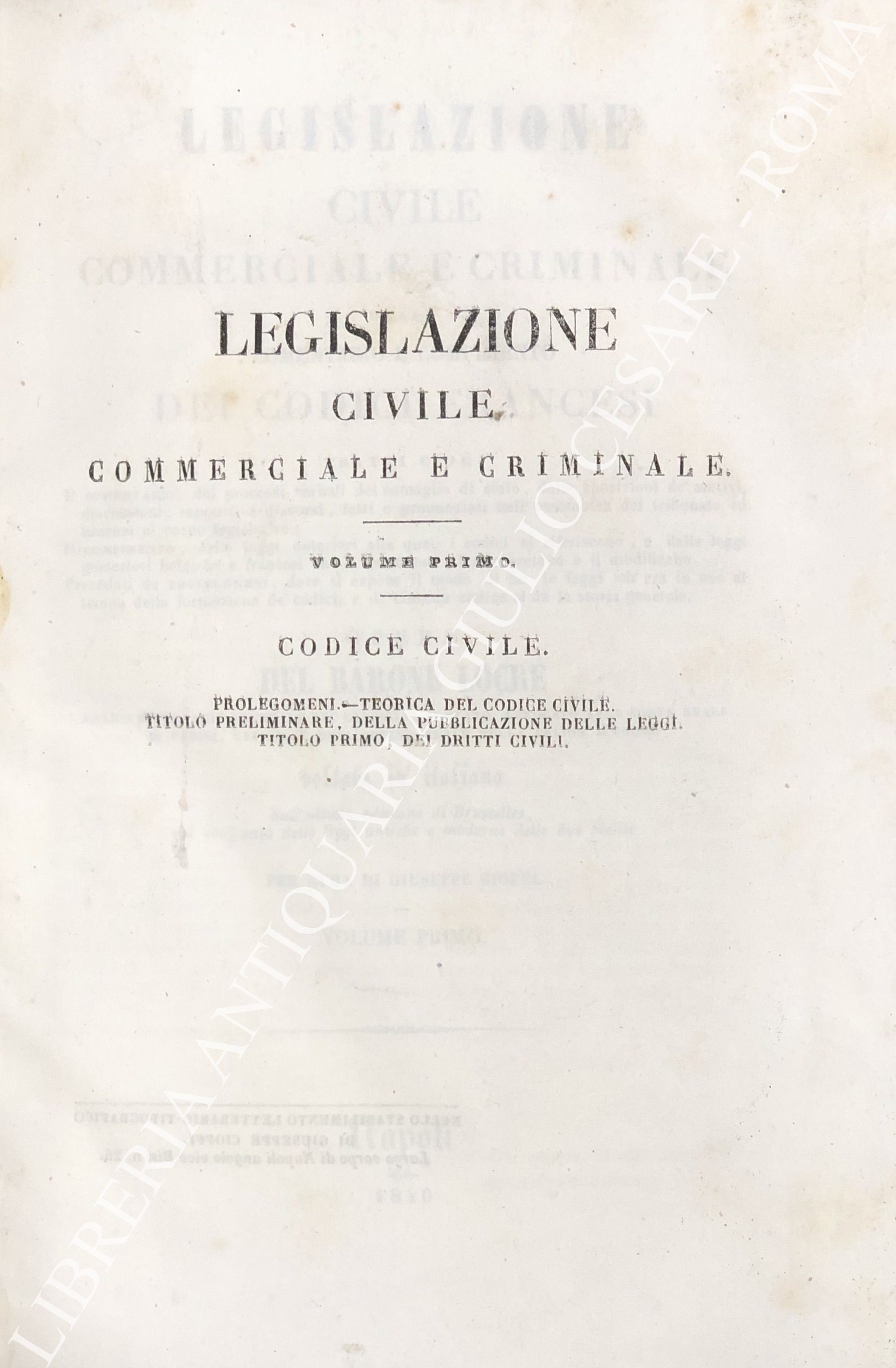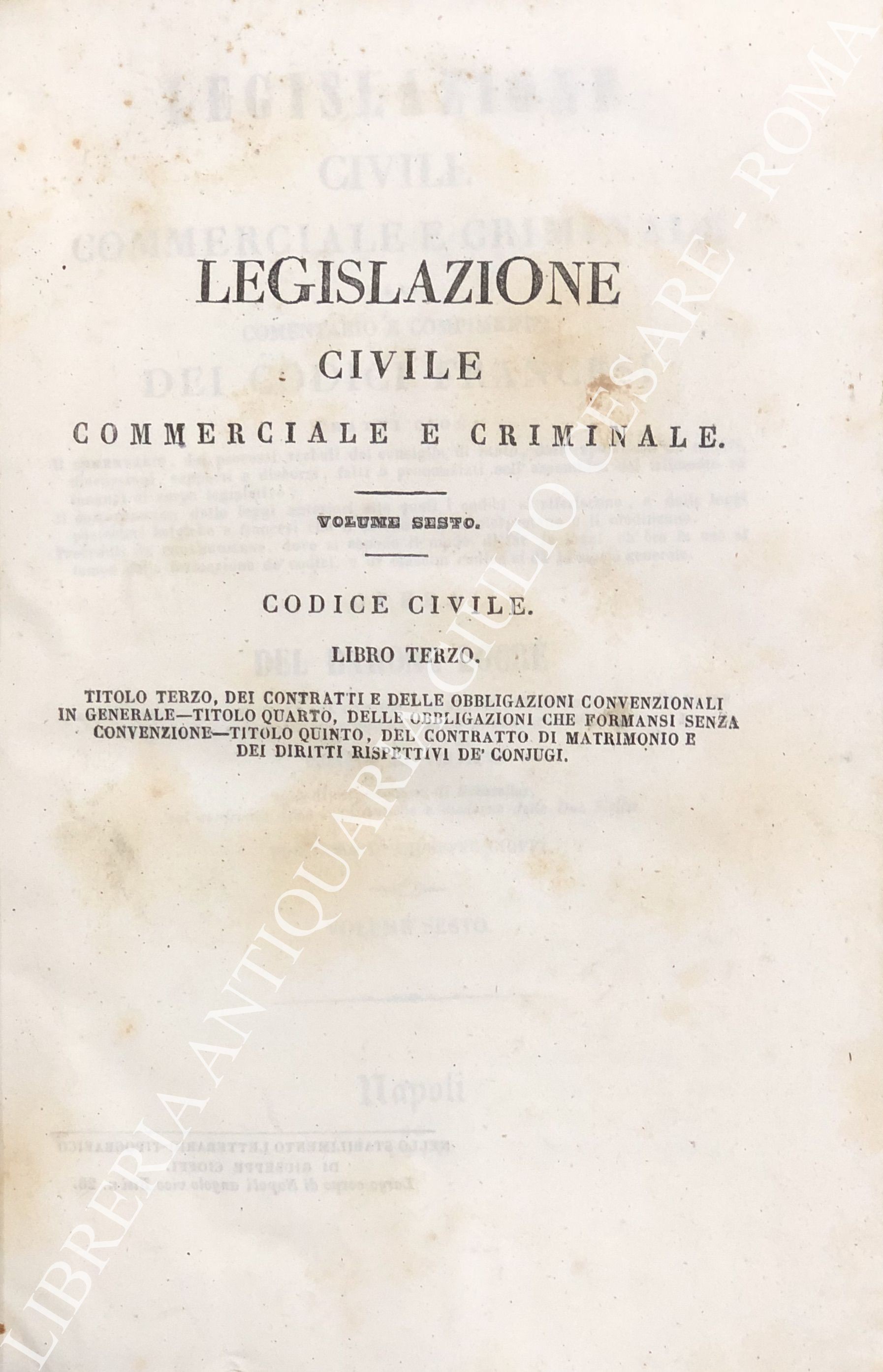 Legislazione civile, commerciale e criminale ossia comentario e compimento dei Codici francesi. Tratti cioè: Il comentario, dai processi verbali del consiglio di Stato, dalle sposizioni de' motivi, discussioni, rapporti e discorsi, fatti o pronunziati nell'assemblea del tribunato ed innanzi al corpo legislativo; Il compimento, dalle leggi anteriori alle quali i codici si riferiscono, e dalle leggi posteriori belgiche e francesi che li estendono, l'interpretano o li modificano. ... Sull'ultima edizione di Brusseles, col confronto delle leggi antiche e moderne delle due Sicilie per cura di Giuseppe Cioffi. Voll. I-VIII - Codice civile. Voll. IX-X - Codice di procedura civile. Voll. XI-XII - Codice di commercio. Voll. XII-XIV - Codice d'istruzione criminale. Vol. XV - Codice penale. Vol. XVI - Tavola alfabetica generale delle materie