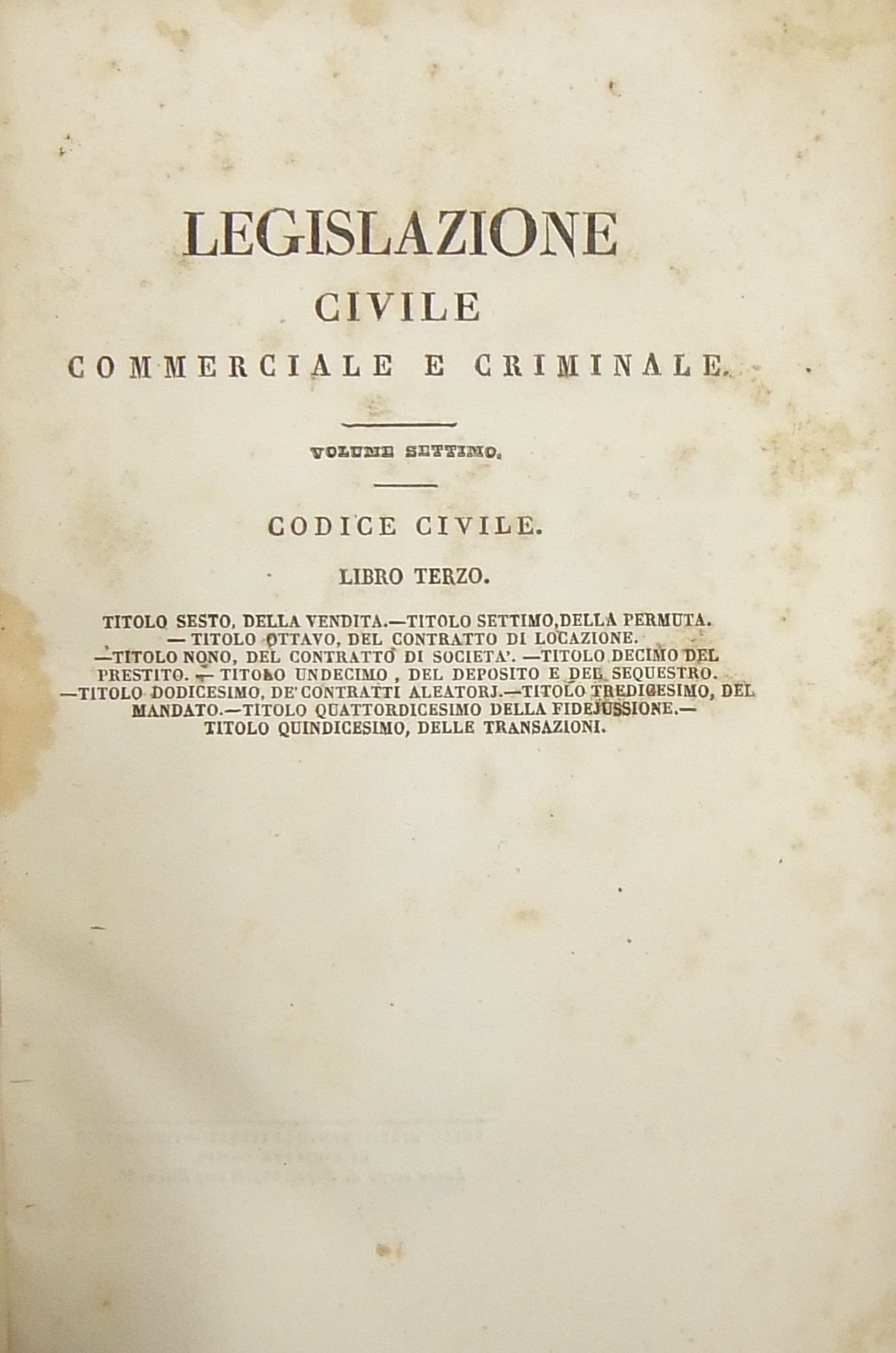 Legislazione civile commerciale e criminale. Vol. VII - Codice Civile. Libro Terzo - Titolo sesto, della vendita. Titolo settimo, della permuta. Titolo ottavo, del contratto di locazione. Titolo nono, del contratto di società . Titolo decimo, del prestito. Titolo undecimo, del deposito e del sequestro. Titolo dodicesimo, de' contratti aleatorj. Titolo tredicesimo, del mandato. Titolo quattordicesimo, della fidejussione. Titolo quindicesimo, delle transazioni