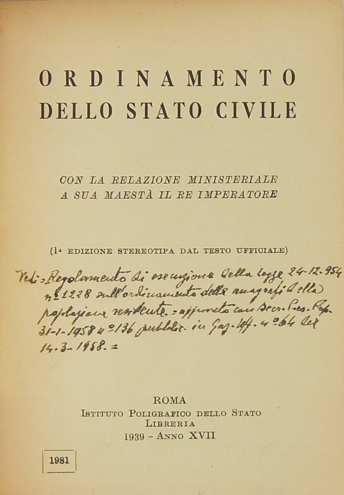 Ordinamento dello stato civile. Con la relazione ministeriale alla Maestà del Re Imperatore