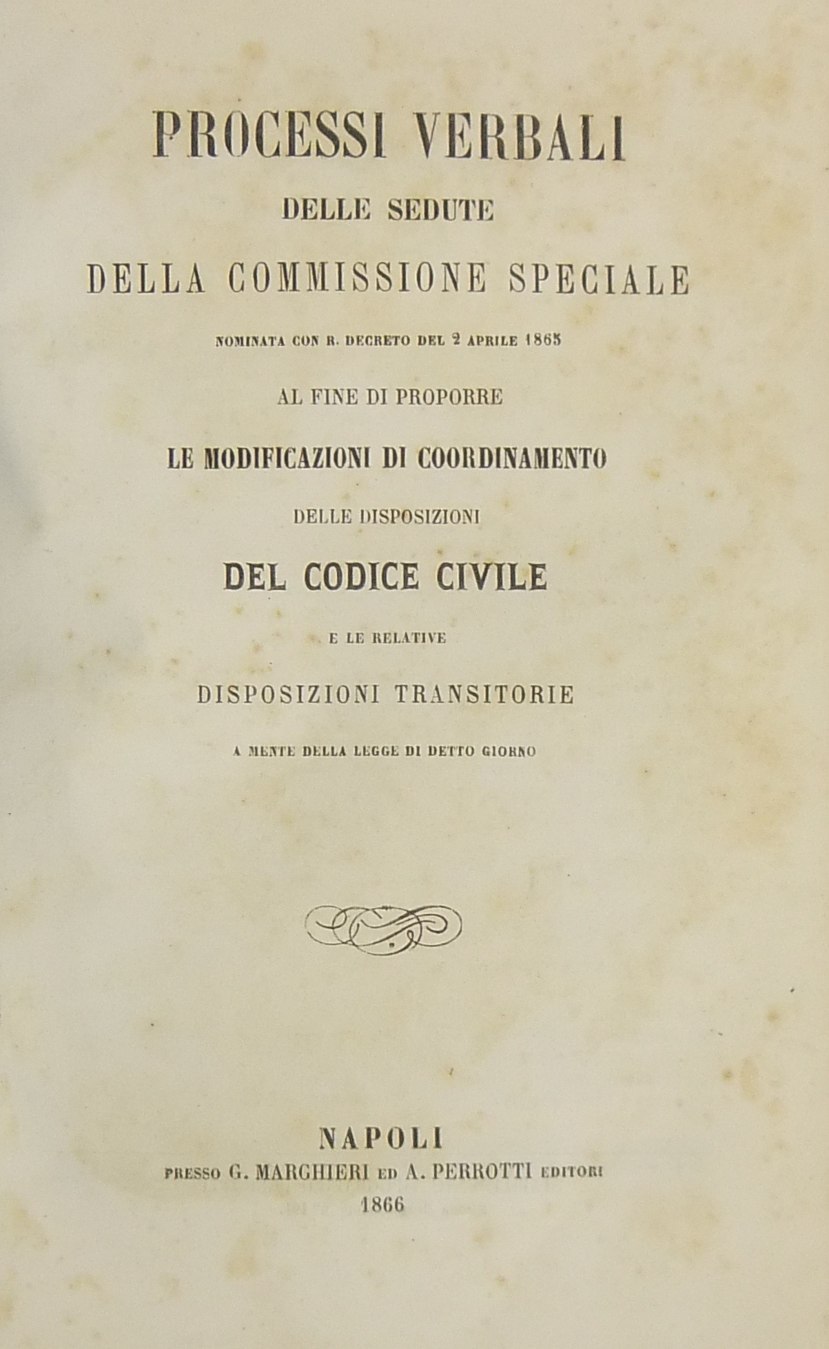Processi verbali delle sedute della Commissione speciale nominata con R. Decreto del 2 aprile 1865 al fine di proporre le modificazioni di coordinamento delle disposizioni del codice civile e le relative disposizioni transitorie a mente della legge di detto giorno