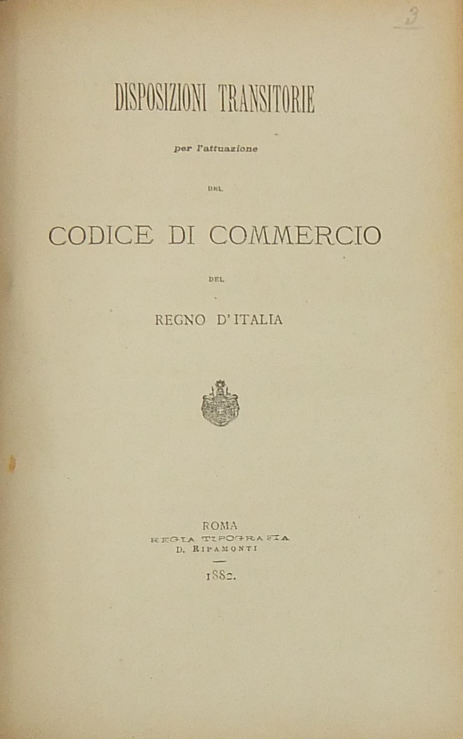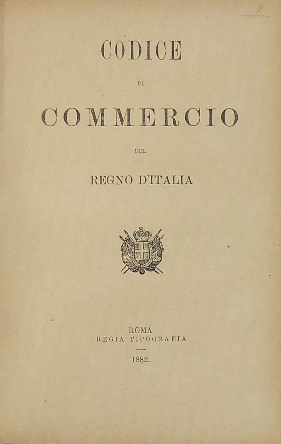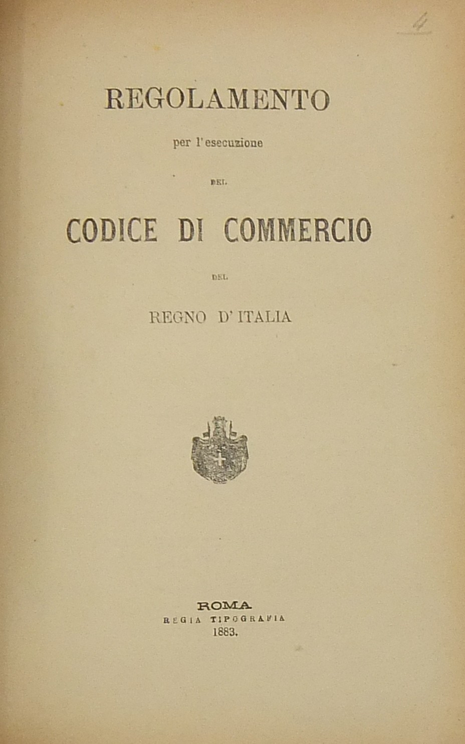 Relazione a S. M. del Ministro Guardasigilli (G. Zanardelli) nell'udienza del 31 ottobre 1882 per l'approvazione del testo definitivo del Codice di Commercio; UNITO A: Codice di Commercio del Regno d'Italia; UNITO A: Disposizioni transitorie per l'attuazione del Codice di Commercio del Regno d'Italia; UNITO A: Regolamento per l'esecuzione del Codice di Commercio del Regno d'Italia