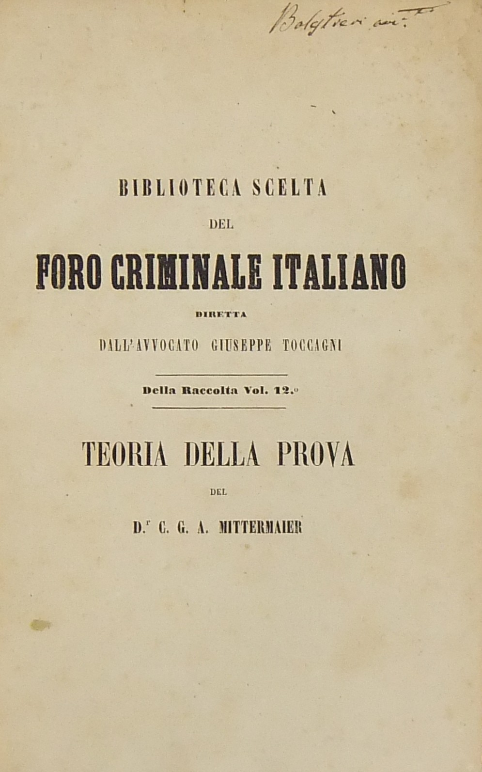 Teoria della prova nel processo penale del Dr. C. G. A. Mittermaier.. Traduzione italiana eseguita sull'originale tedesco dal Dr. Filippo Ambrosoli. Con molte aggiunte inedite dell'Autore e con note del traduttore sulla legislazione austriaca