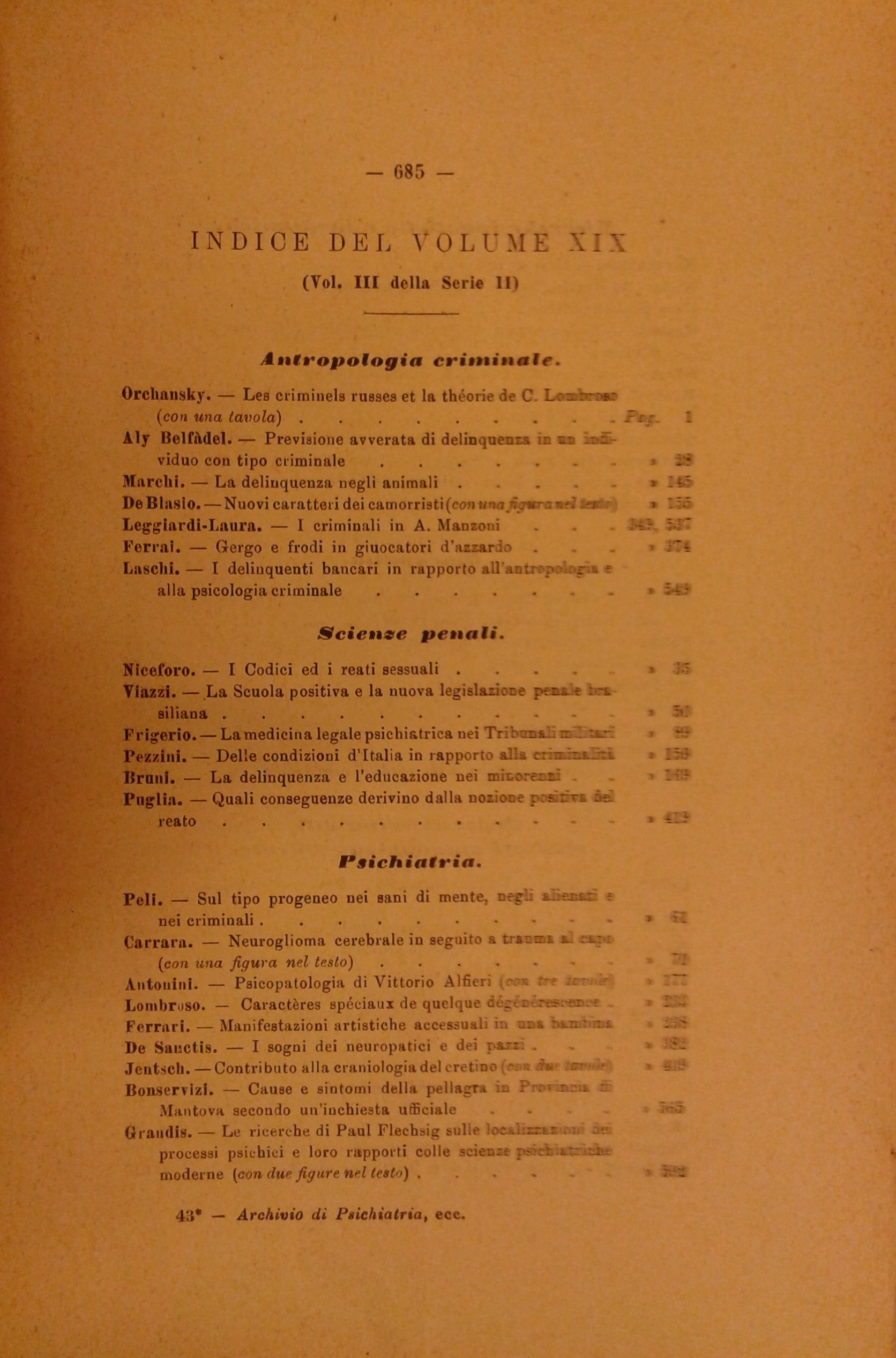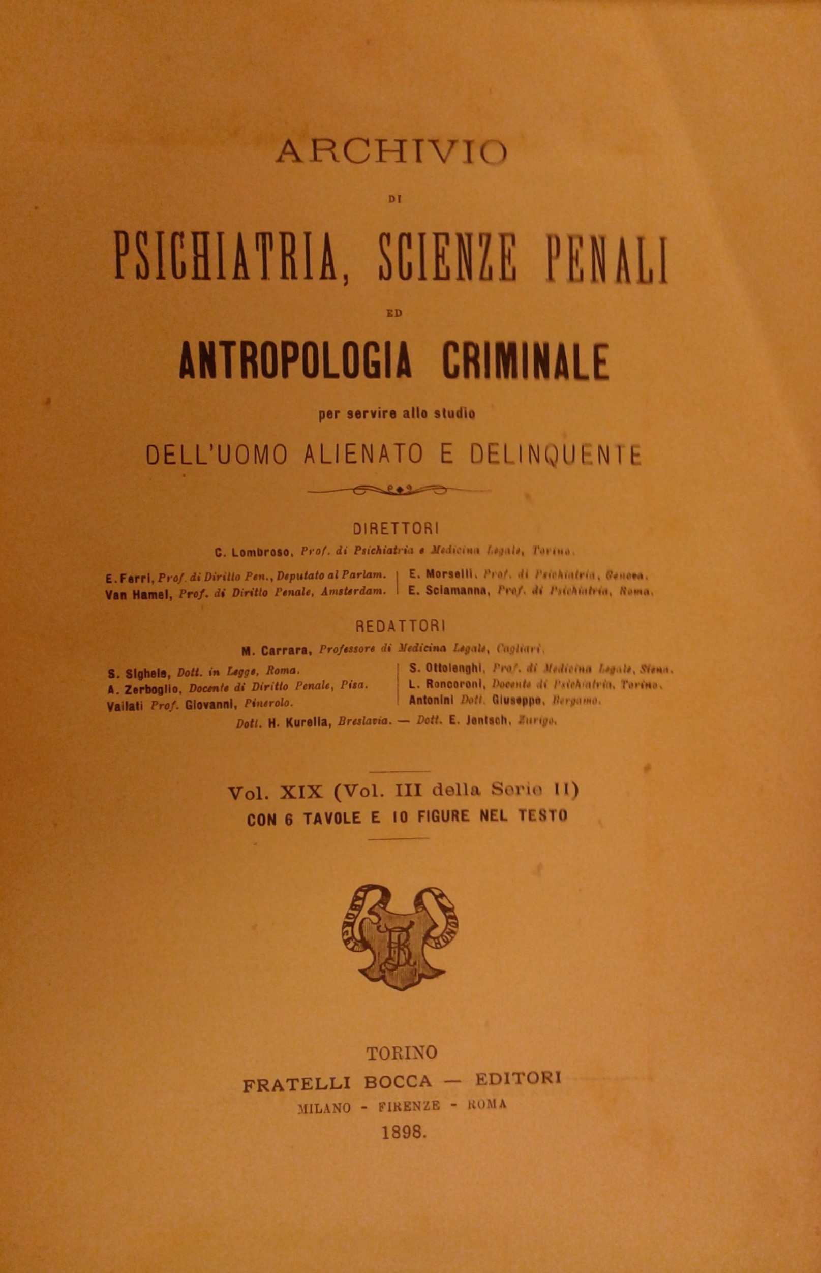 Archivio di Psichiatria, Scienze penali, ed Antropologia criminale per servire allo studio dell'uomo alienato e delinquente. Diretto da C. Lombroso, E. Ferri, E. Morselli, Van Hamel, E. Sciamanna. Volume XIX - Anno 1898