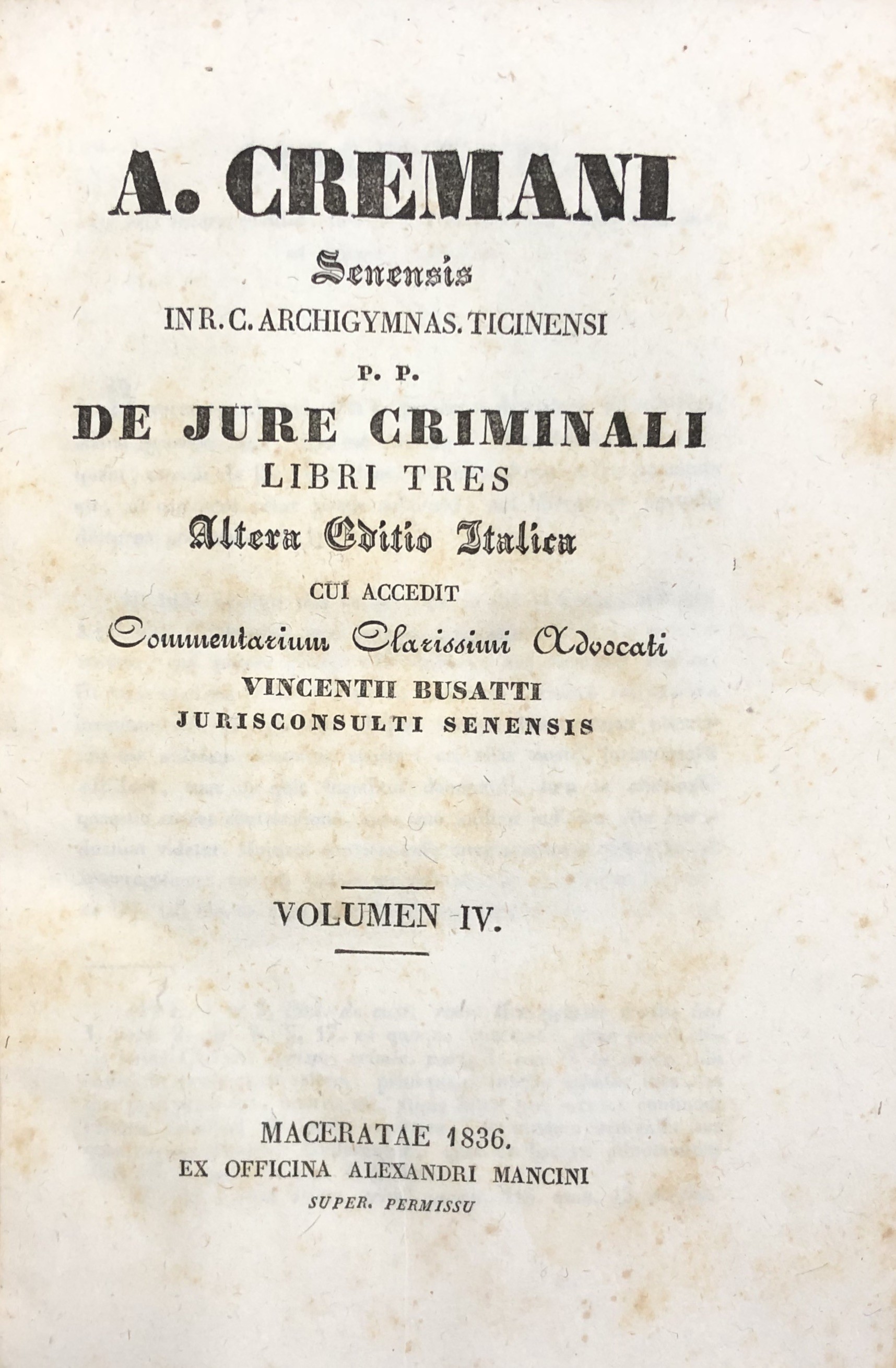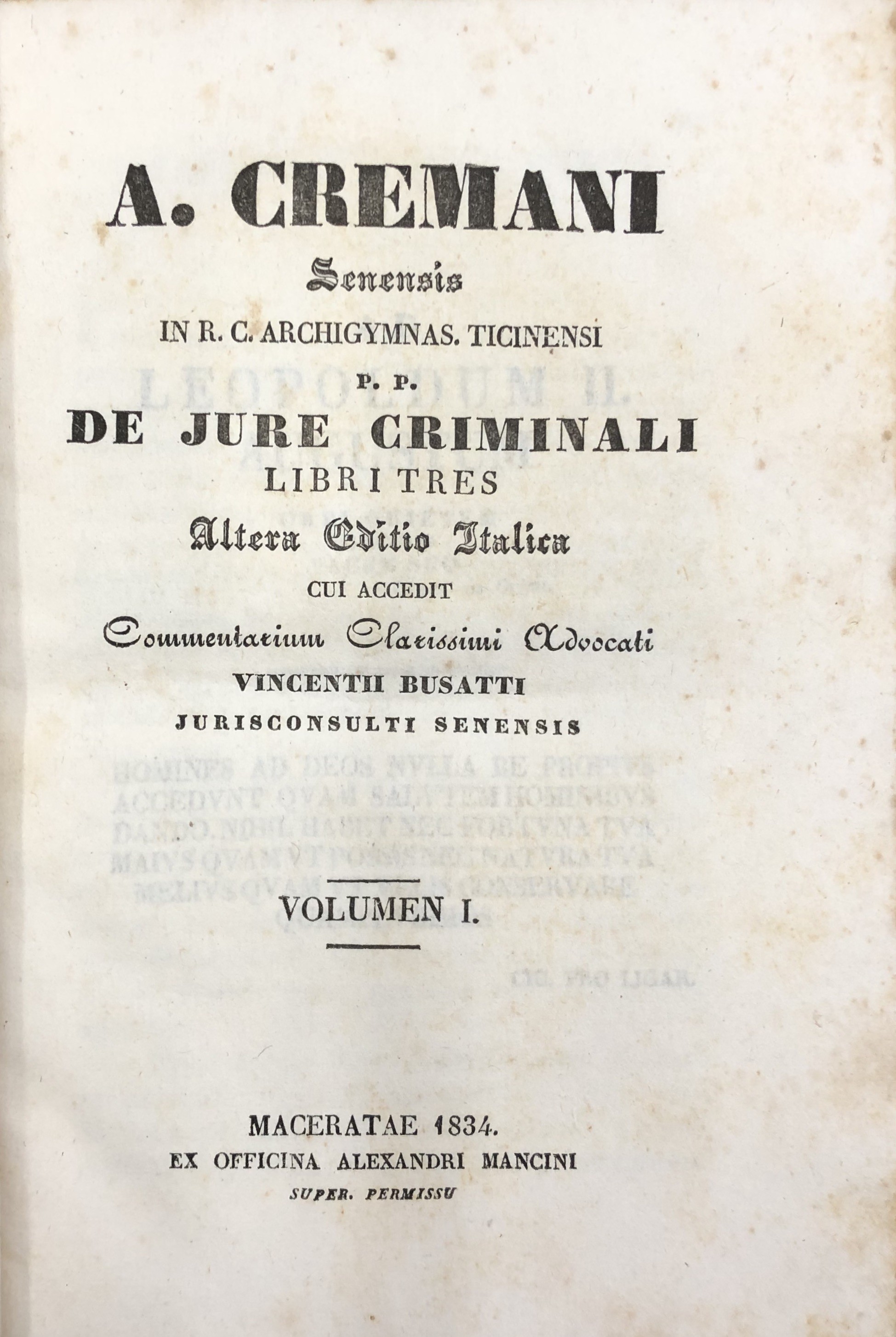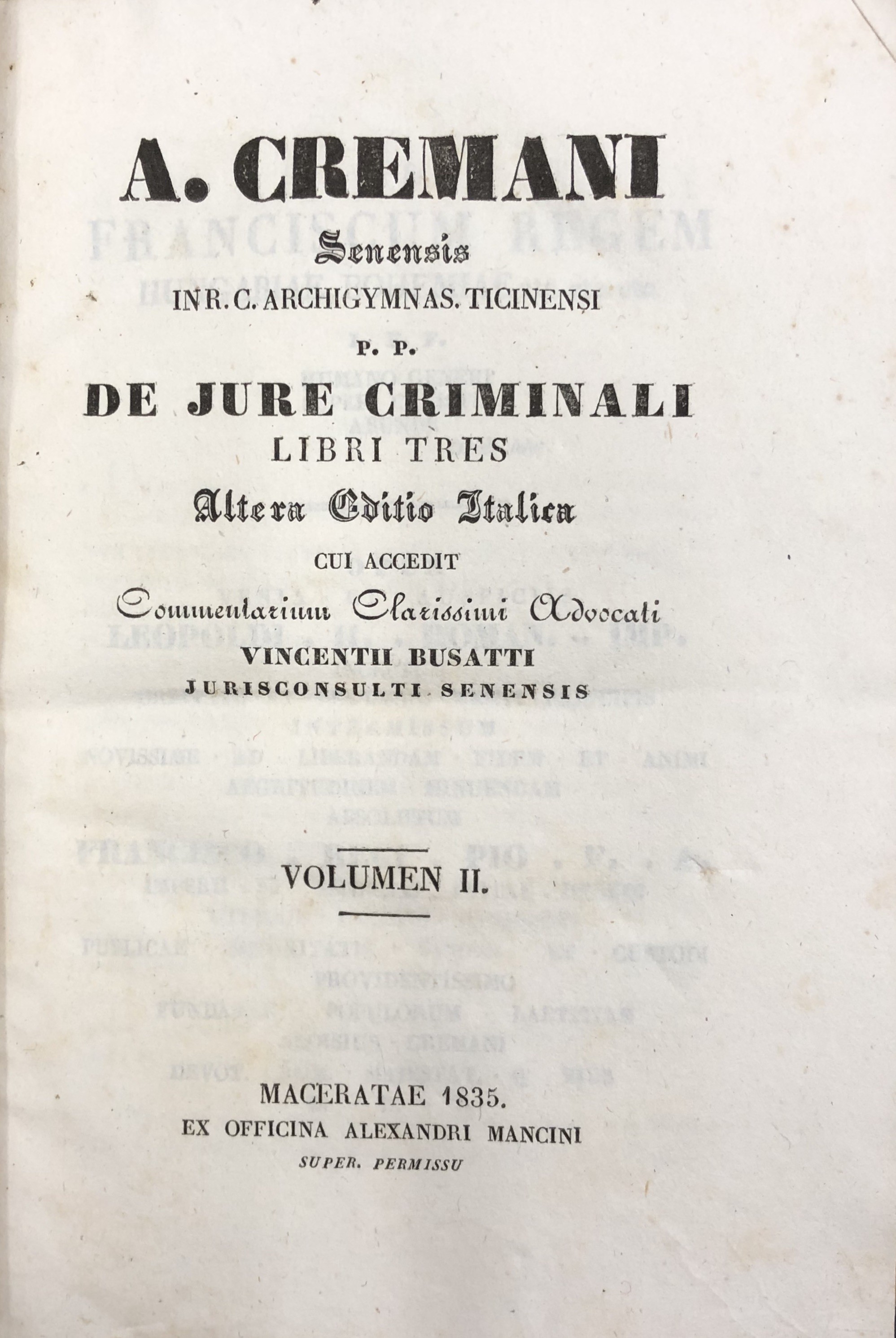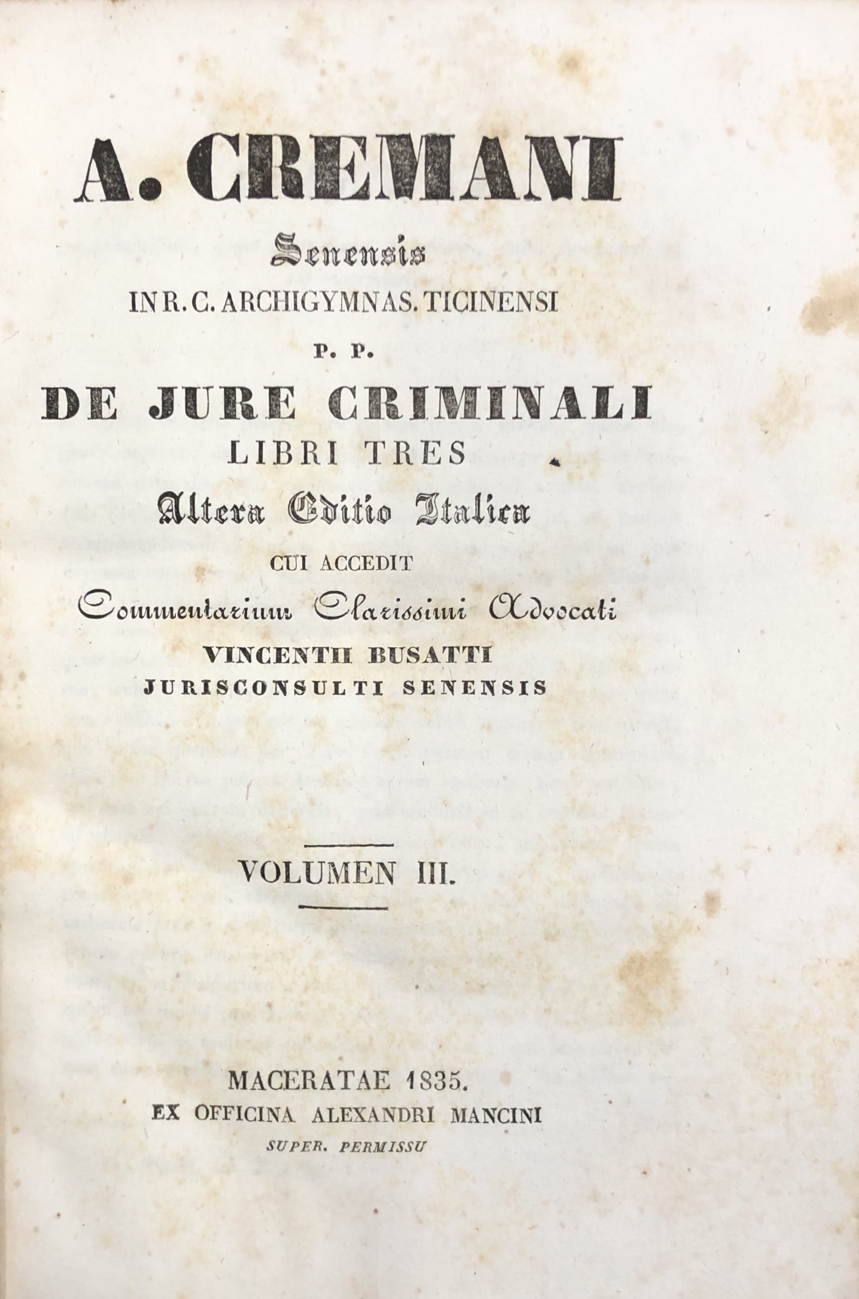 De jure criminali libri tres cui accedit commentarium clarissimi advocati Vincentii Busatti jurisconsulti senensis