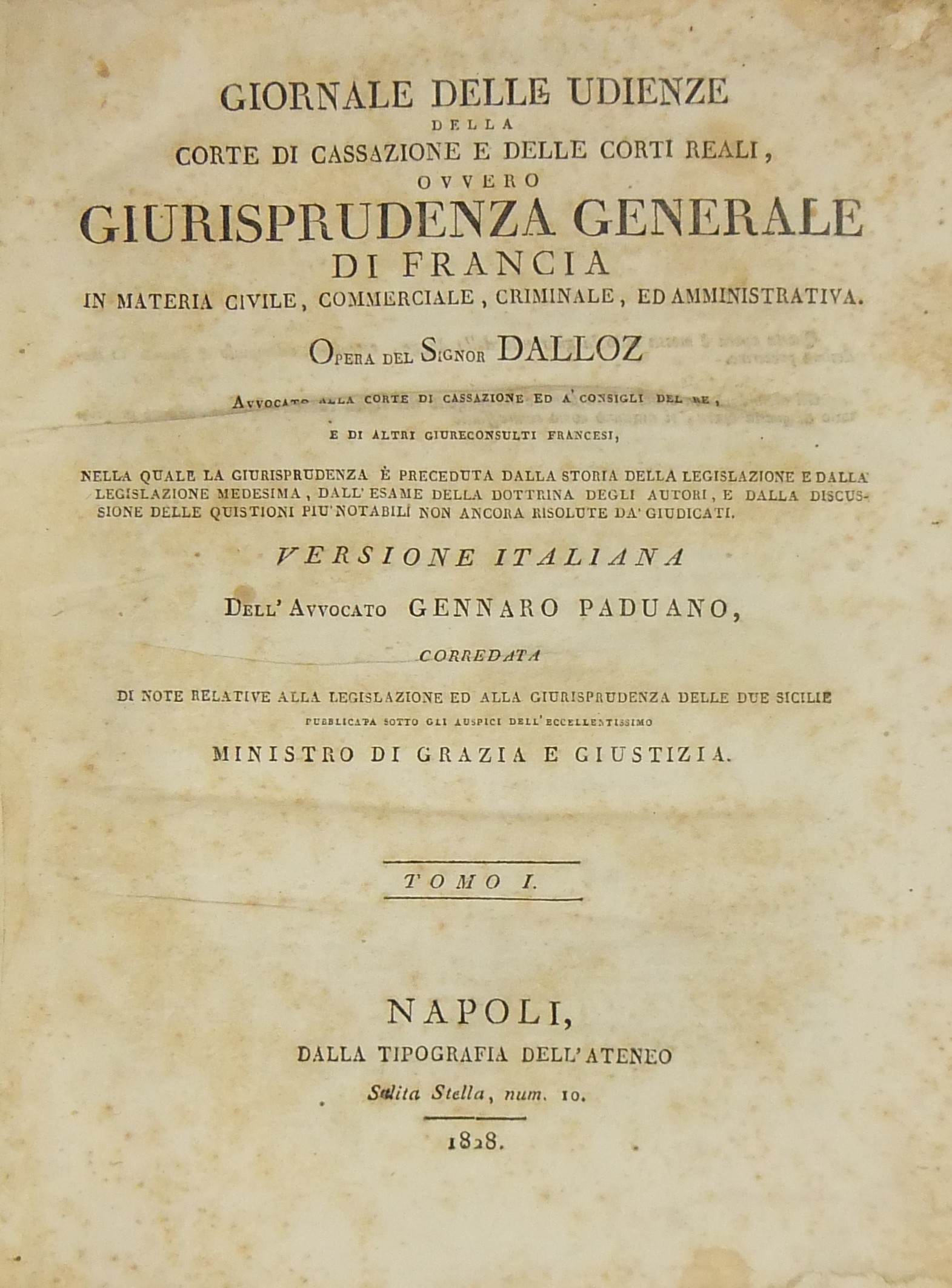 Giornale delle udienze della Corte di Cassazione e delle Corti Reali, ovvero Giurisprudenza generale di Francia in materia civile, commerciale, criminale ed amministrativa. Nella quale la giurisprudenza è preceduta dalla storia della legislazione e dalla legislazione medesima, dall'esame della dottrina degli autori, e dalla discussione delle quistioni più notabili non ancora risolute da' giudicati. Versione italiana dell'Avvocato Gennaro Paduano corredata di note relative alla legislazione ed alla giurisprudenza delle Due Sicilie pubblicata sotto gli auspici dell'eccellentissimo Ministro di Grazia e Giustizia