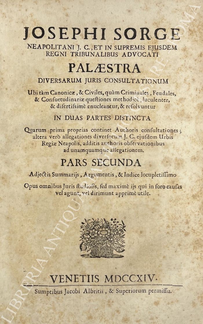 Palaestra diversarum juris consultationum. Ubi tam Canonicae, & Civiles, quam Criminales, Feudales, & Consuetudinariae questiones methodice, luculenter, & disertissime enucleantur, & revolvuntur in duas partes distincta. Quarum prima proprias continet Authoris consultationes; altera vero allegationes diversorum J. C. ajusdem Urbis Regiae Neapolis, additis authoris observationibus ad unamquamque allegationem. Adjectis Summarijs, Argumentis, & Indice locupletissimo. Opus omnibus Juris studiosis, sed maxime ijs qui in foro causas vel agunt, vel dirimunt apprime utile. Pars prima et secunda