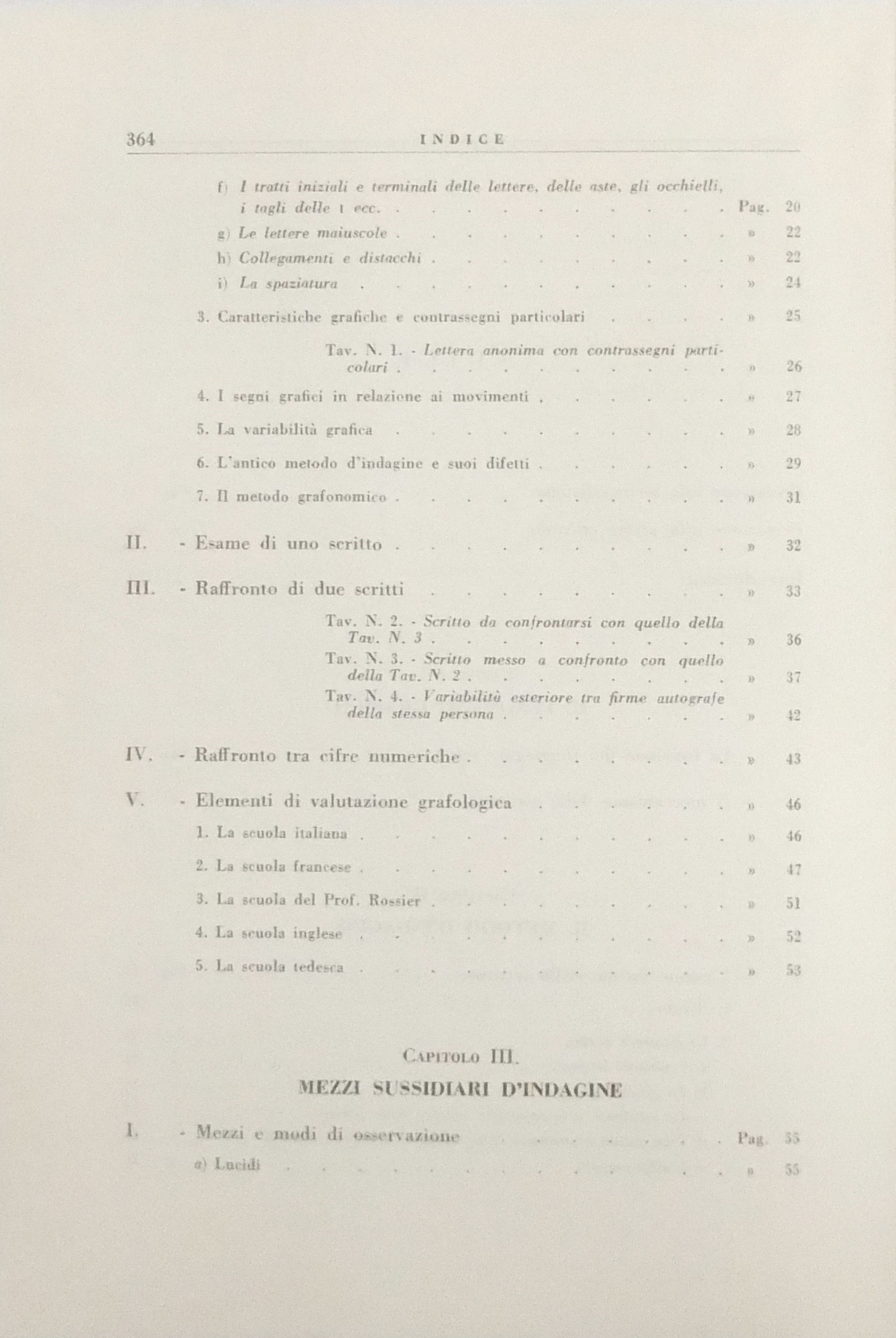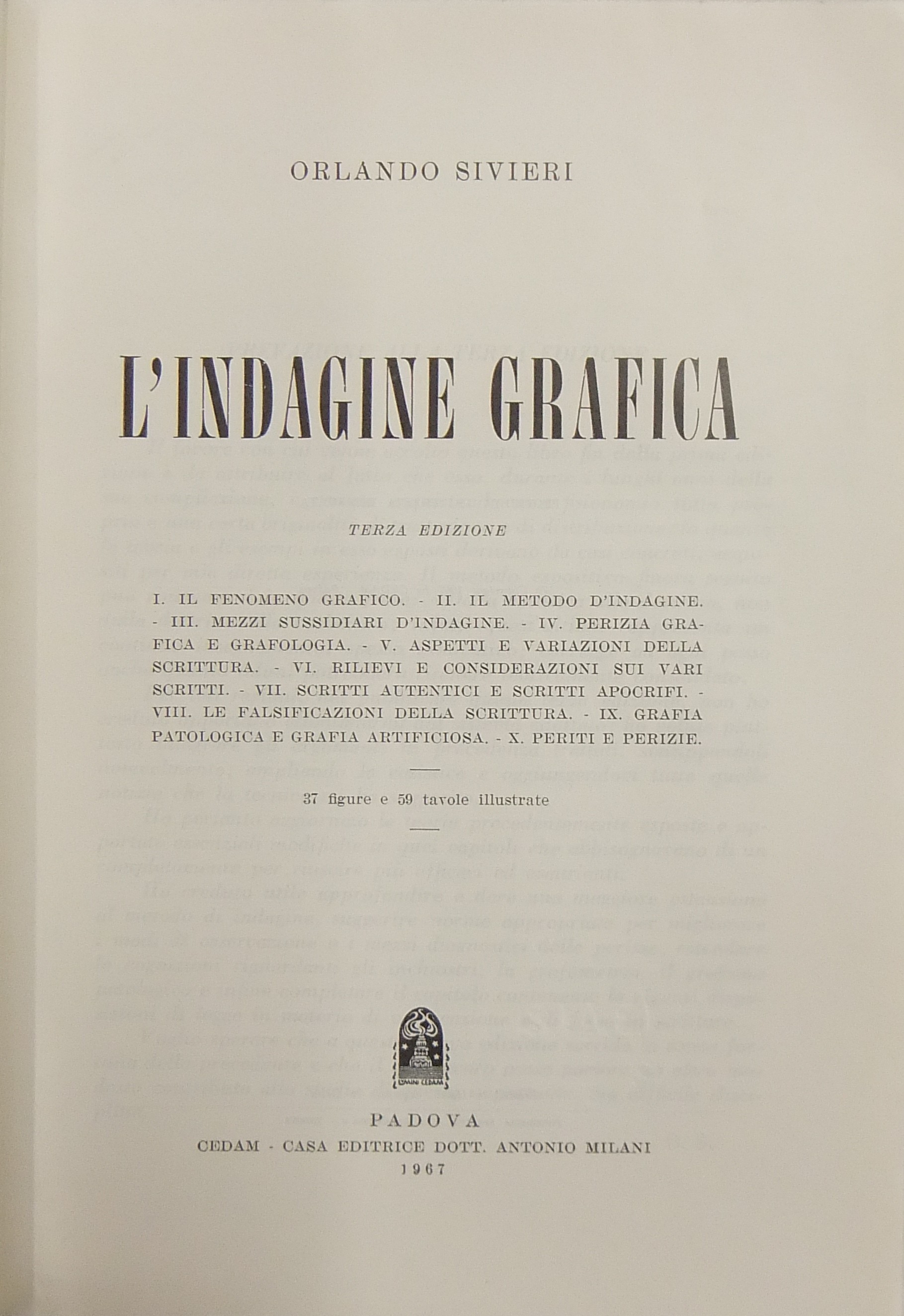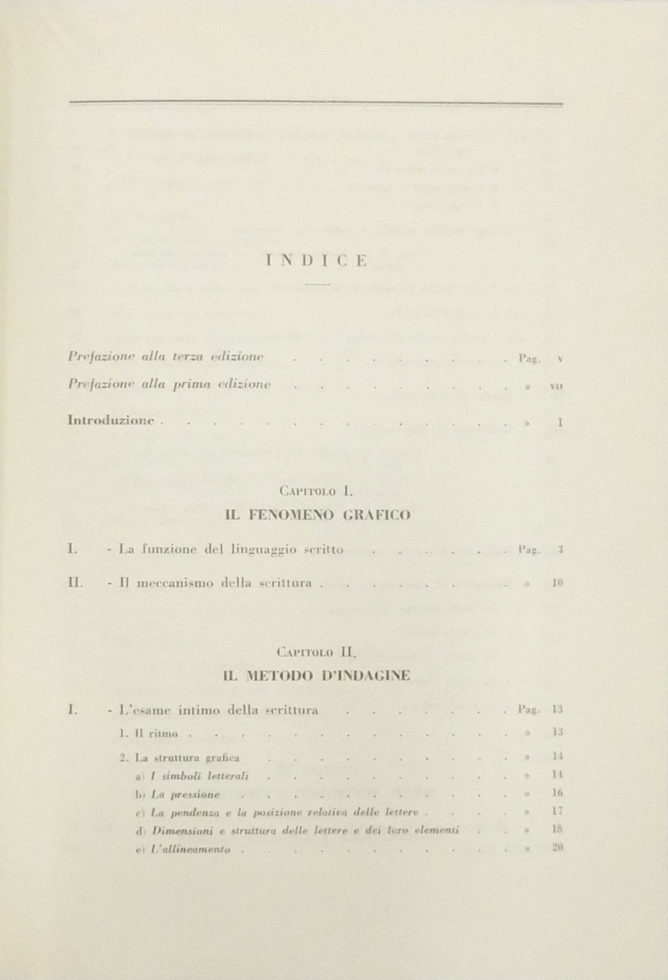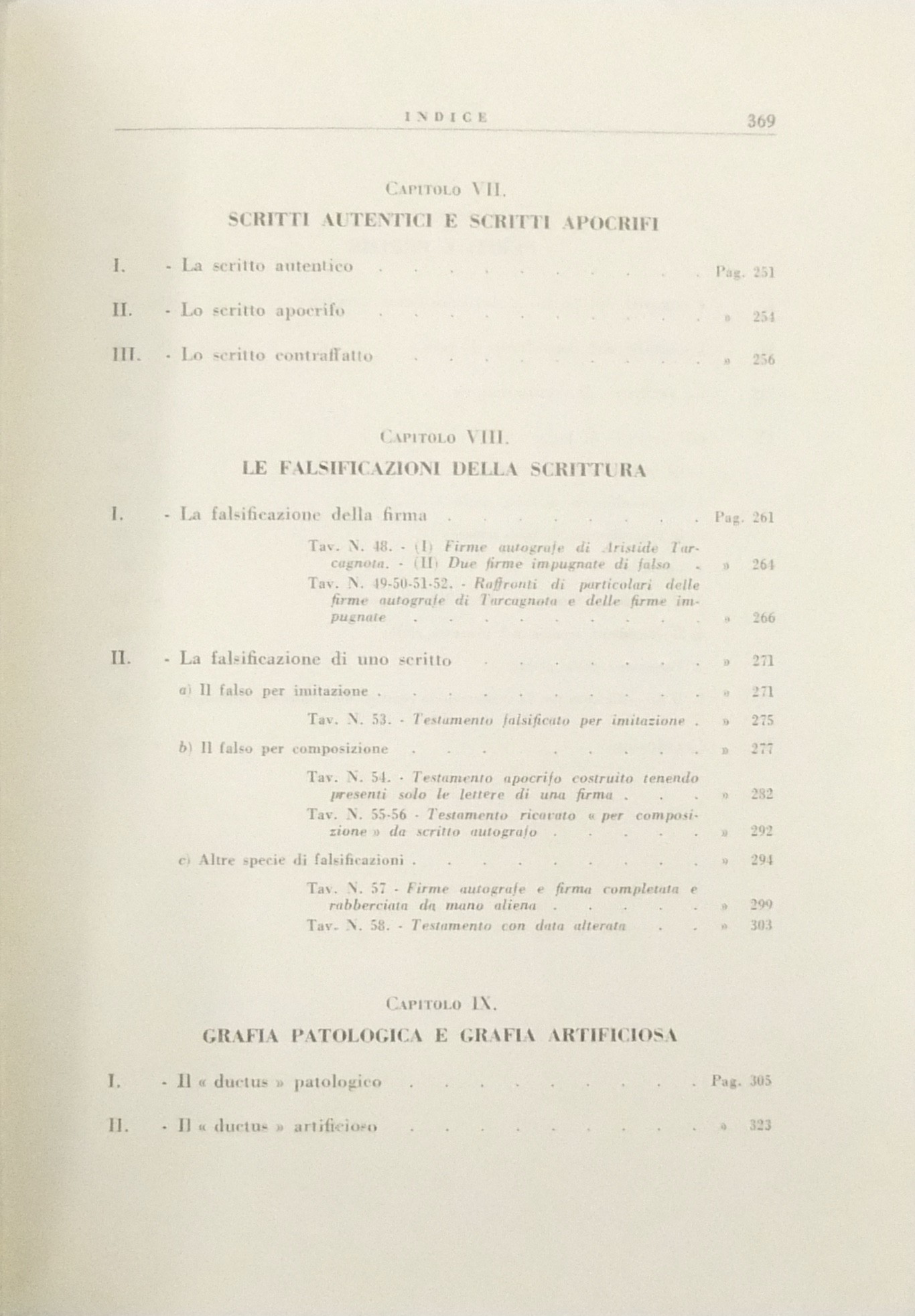 L'indagine grafica. Il fenomeno grafico. Il metodo d'indagine. Mezzi sussidiari d'indagine. Perizia grafica e grafologia. Aspetti e variazioni della scrittura. Rilievi e considerazioni sui vari scritti. Scritti autentici e scritti apocrifi. Le falsificazioni della scrittura. Grafia patologica e grafia artificiosa. Periti e perizie. Con 37 figure e 59 tavole illustrate