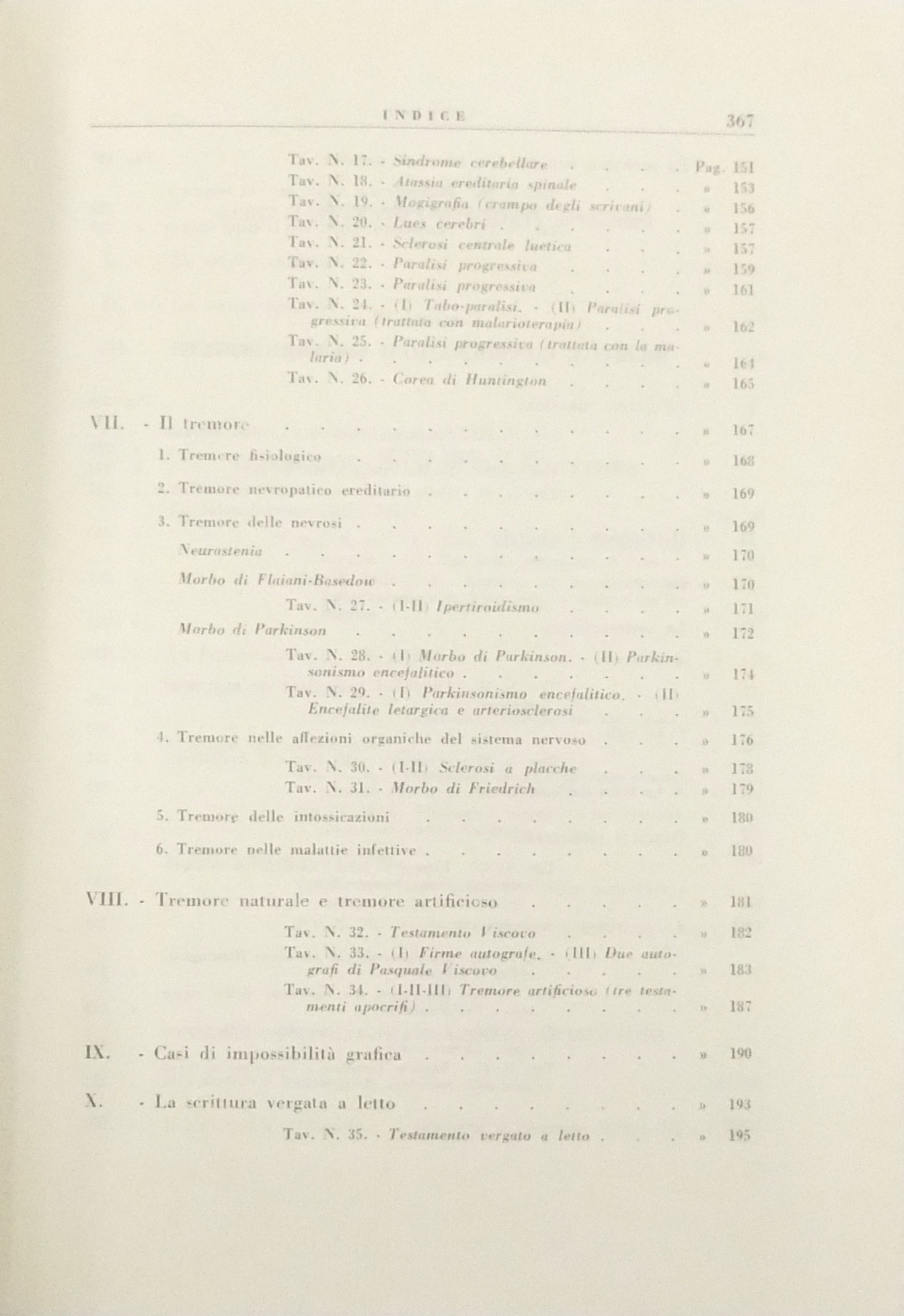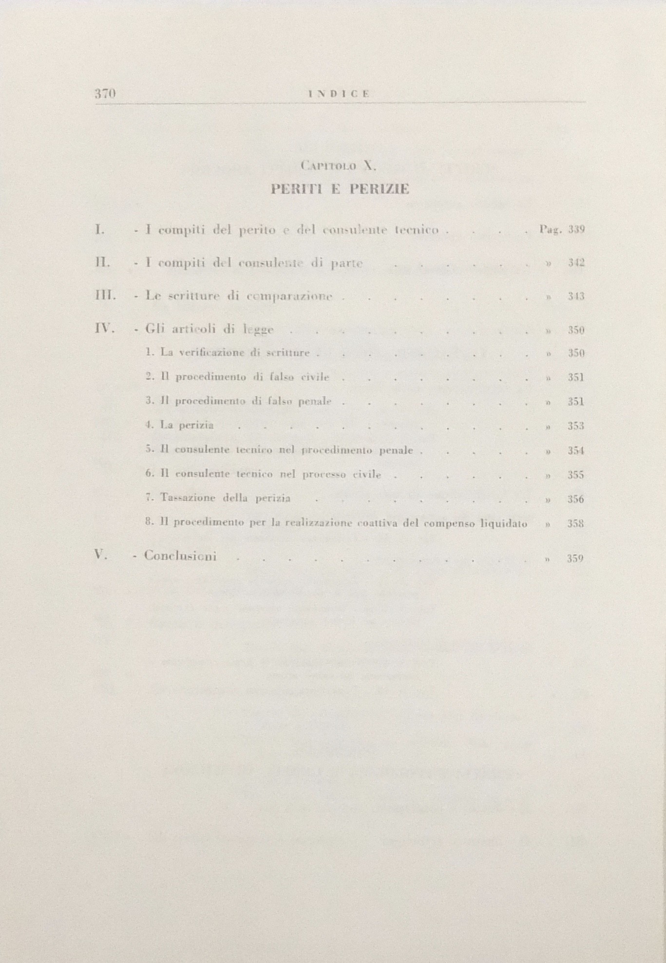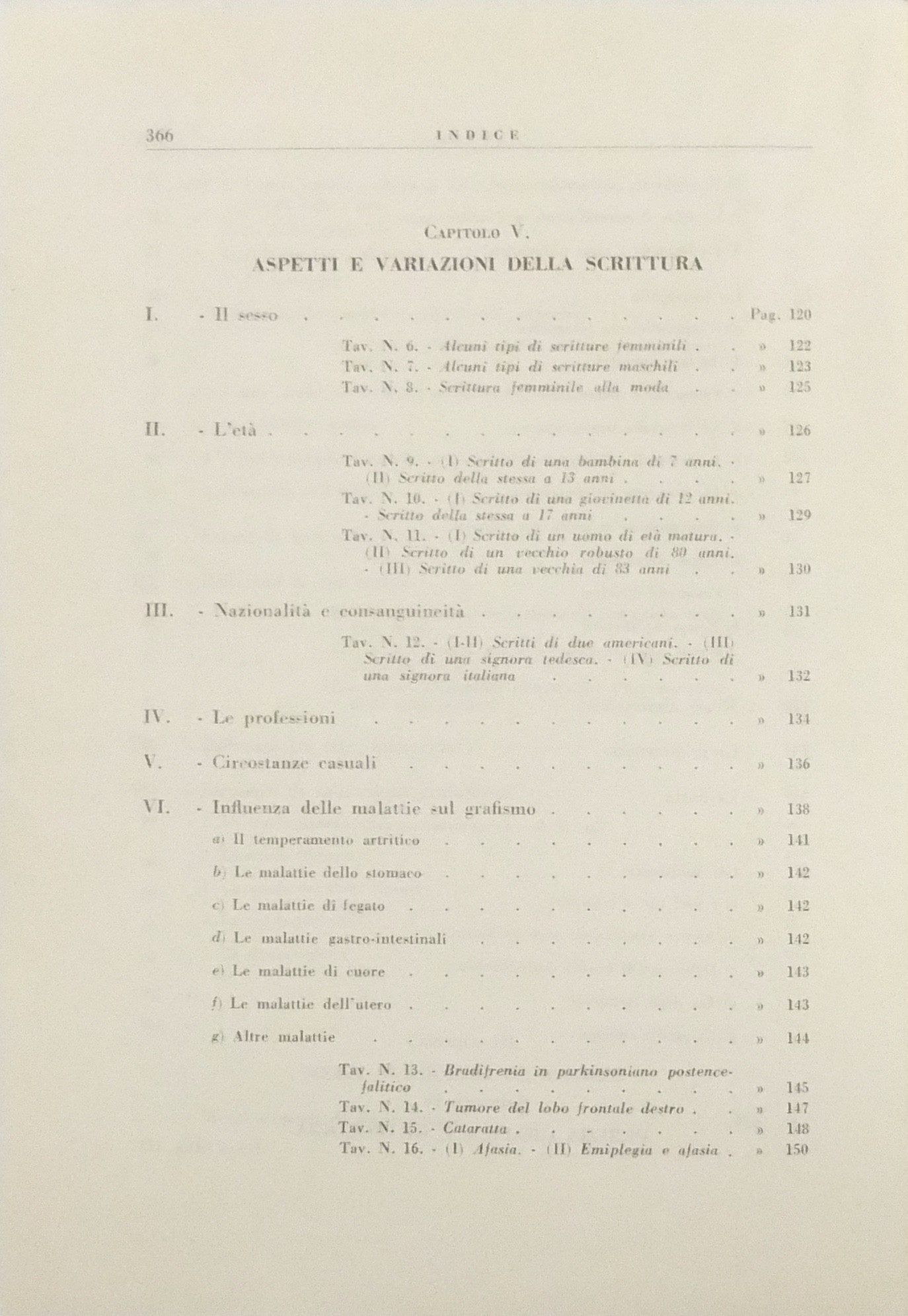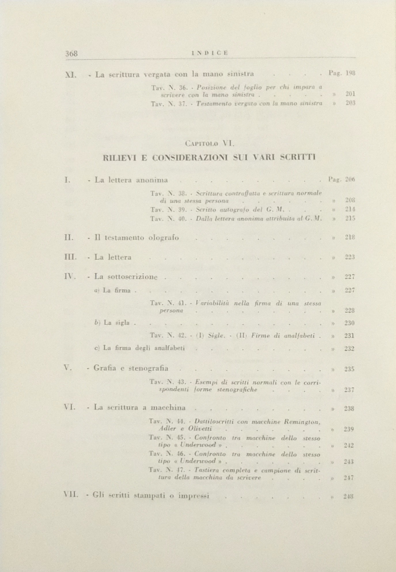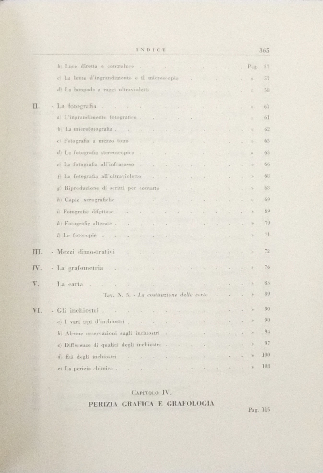L'indagine grafica. Il fenomeno grafico. Il metodo d'indagine. Mezzi sussidiari d'indagine. Perizia grafica e grafologia. Aspetti e variazioni della scrittura. Rilievi e considerazioni sui vari scritti. Scritti autentici e scritti apocrifi. Le falsificazioni della scrittura. Grafia patologica e grafia artificiosa. Periti e perizie. Con 37 figure e 59 tavole illustrate