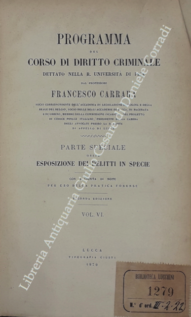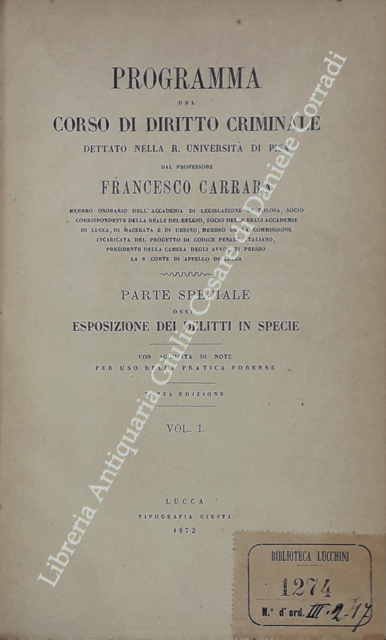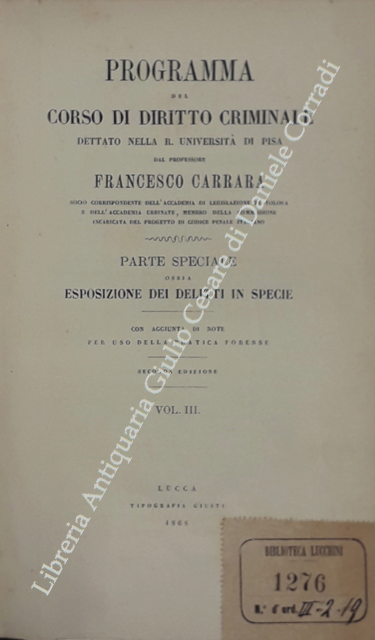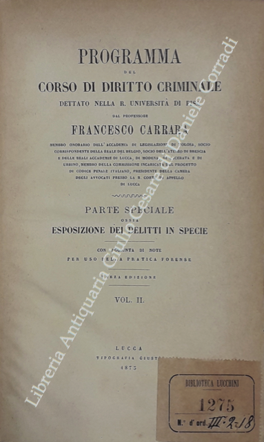 Programma del corso di diritto criminale dettato nella R. Università di Pisa. Parte speciale ossia esposizione dei delitti in specie. Con aggiunta di note per uso della pratica forense