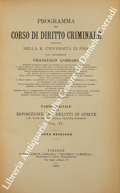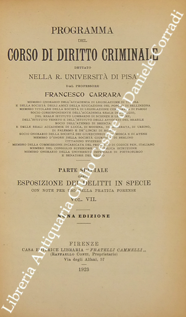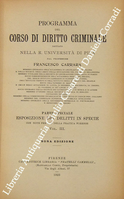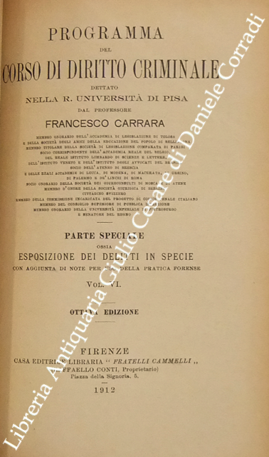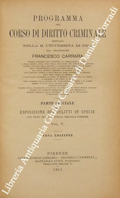 Programma del corso di diritto criminale dettato nella R. Università di Pisa. Parte speciale ossia esposizione dei delitti in specie. Con aggiunta di note per uso della pratica forense