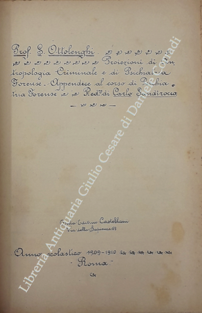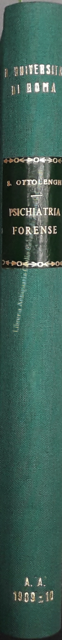 Psichiatria forense. Lezioni compilate da Carlo Sandirocco. Anno scolastico 1909-10. UNITO A: Proiezioni di antropologia criminale e di psichiatria forense. Appendice al corso di psichiatria forense. Anno scolastico 1909-1910. Riedizione di Carlo Sandirocco. Castellani, Roma, 1910, pp. 92 + (2)