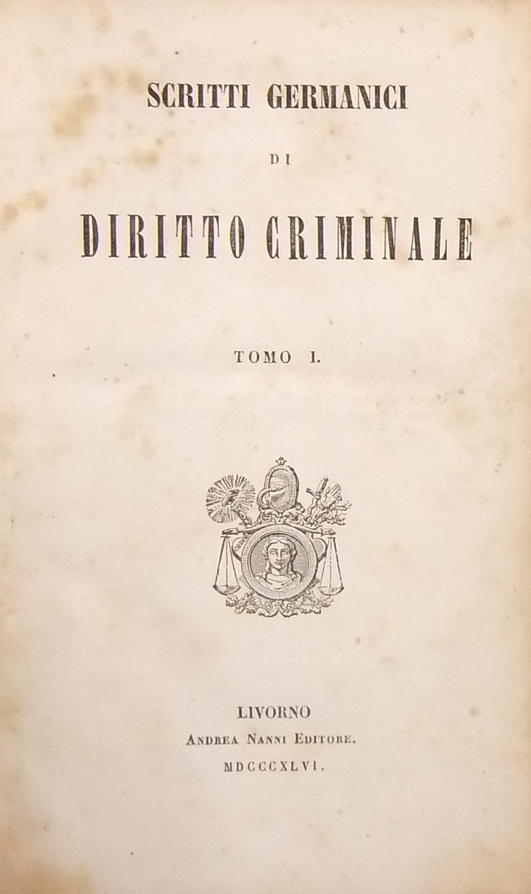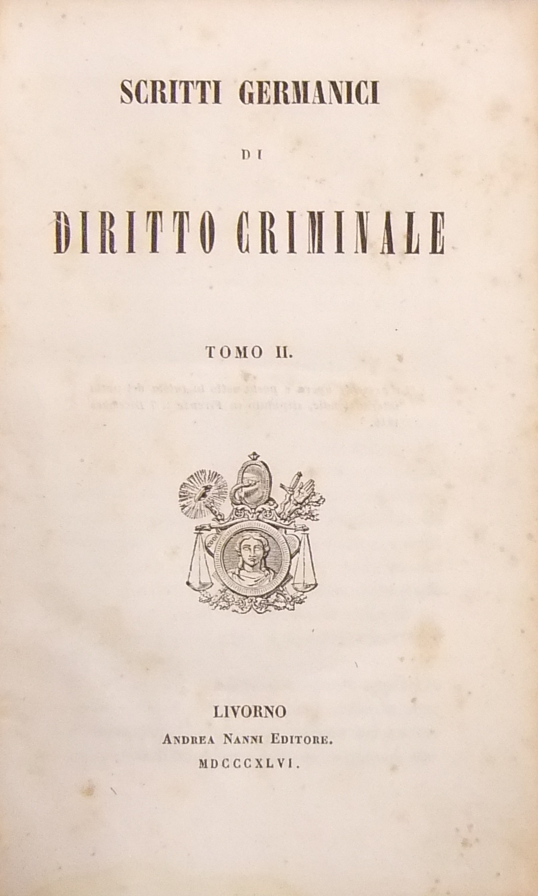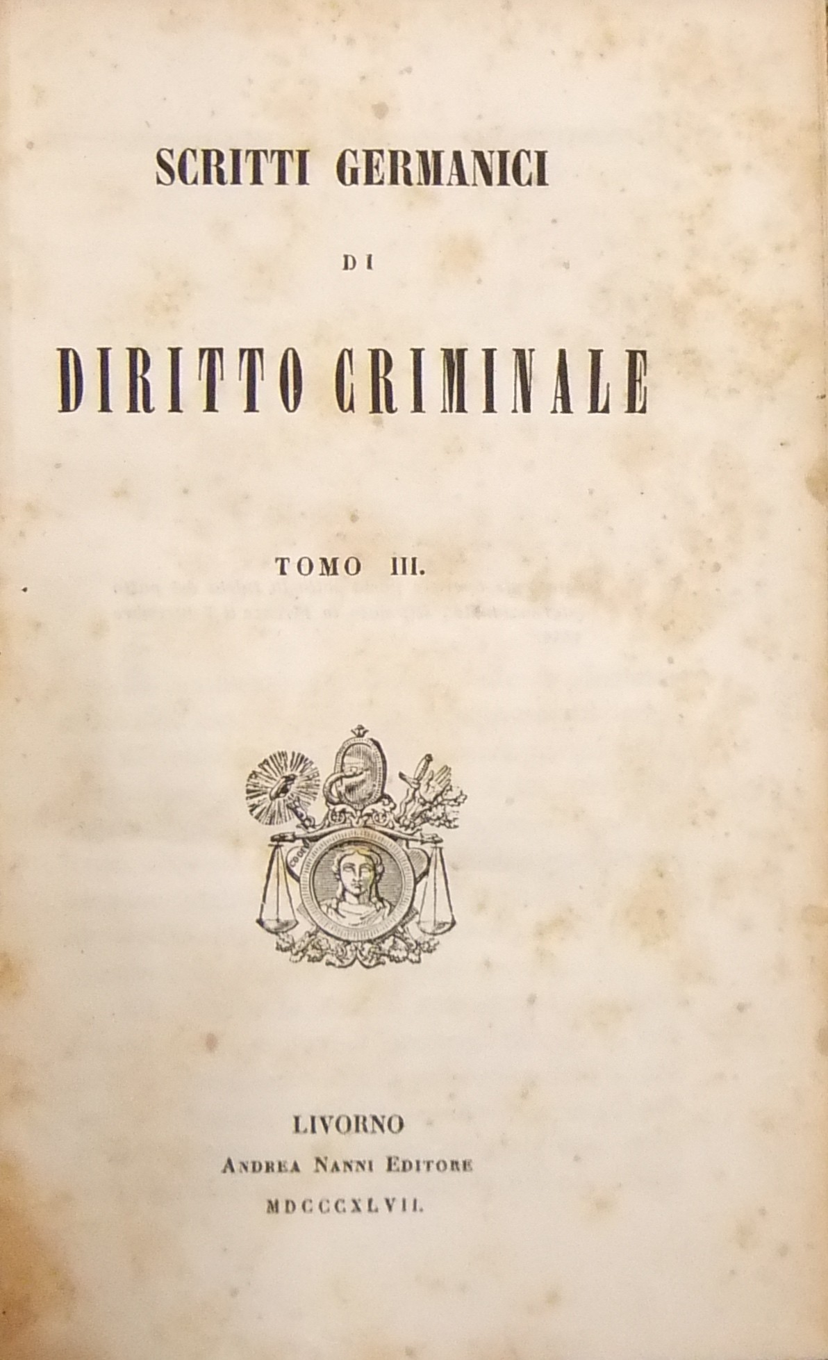 Interessante compilazione a cura di F.A. Mori di scritti penalistici di: Bauer, Friedreich, Geib, Hepp, Hesse, Hofacker, von Jagemann, Kitka, Kleinschrod, Mittermaier, Rosshirt, Sander, Schenck, Scheurlen, Spangenberg, Walter, Waechter, Wening, Zachariae. Contiene inoltre il testo del Codice penale (6 marzo 1845), di procedura penale e la legge organica dei tribunali del Granducato di Baden.