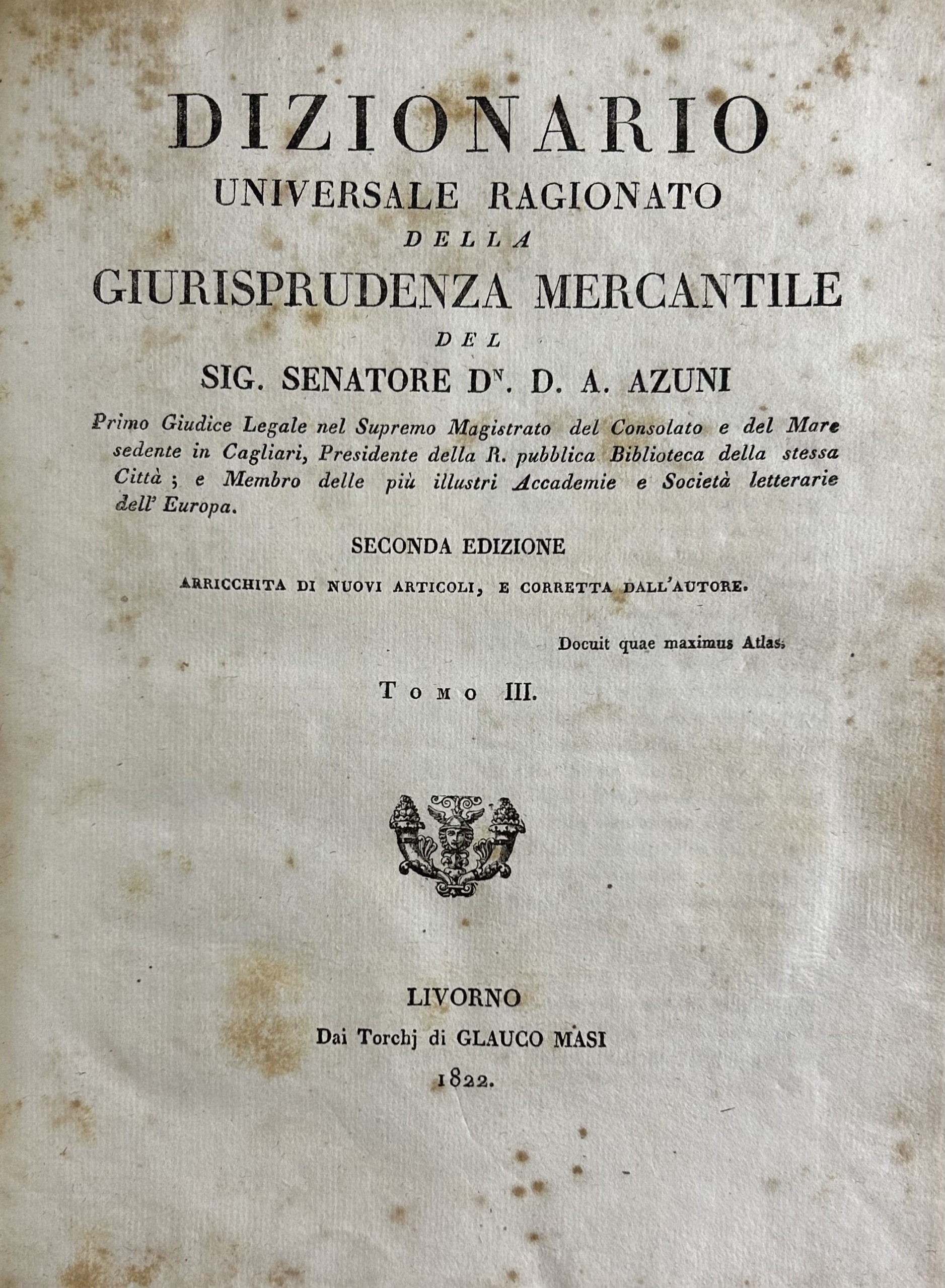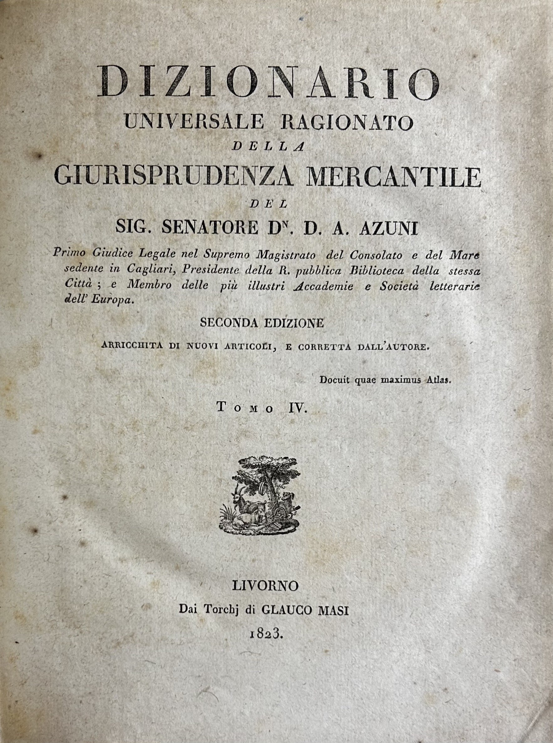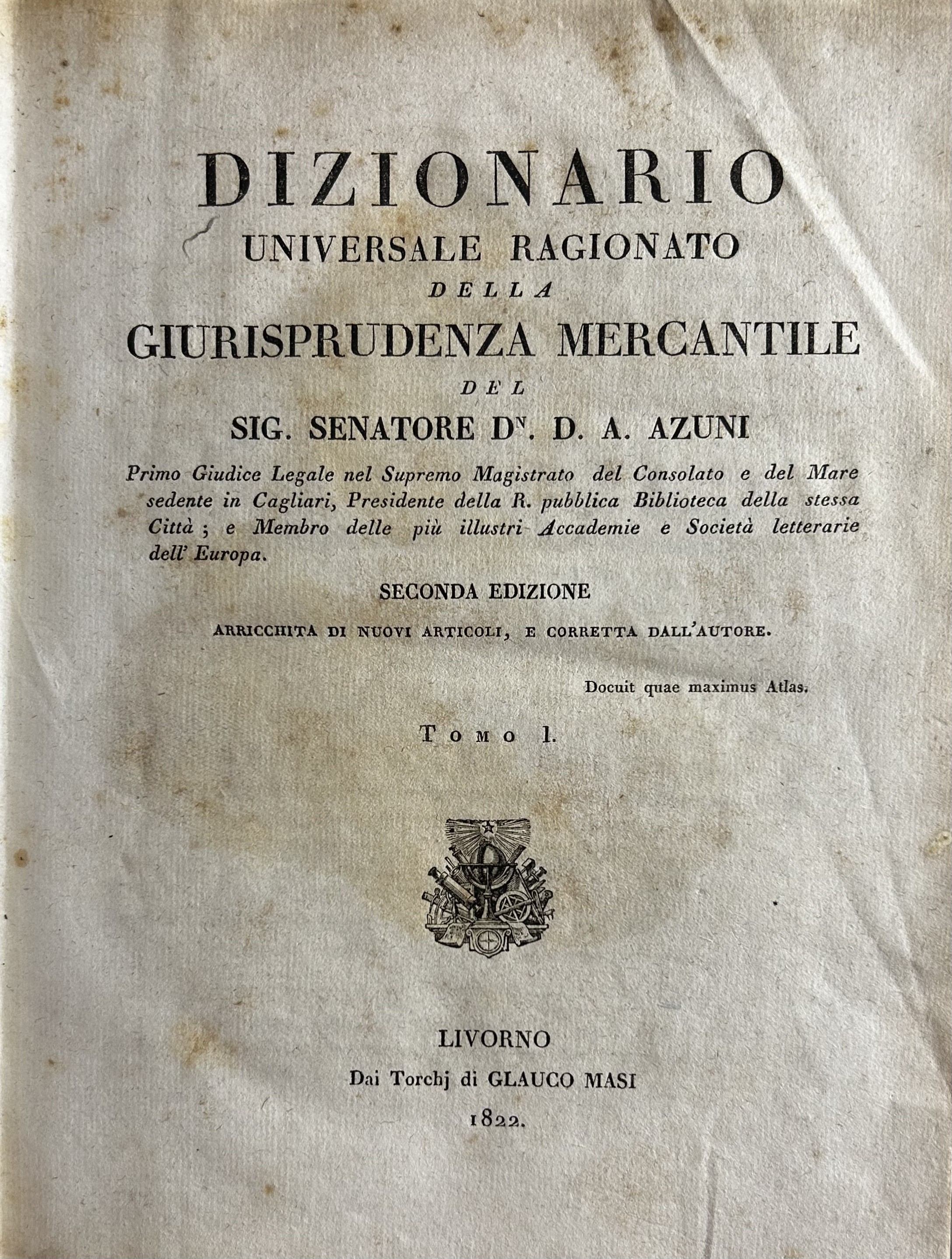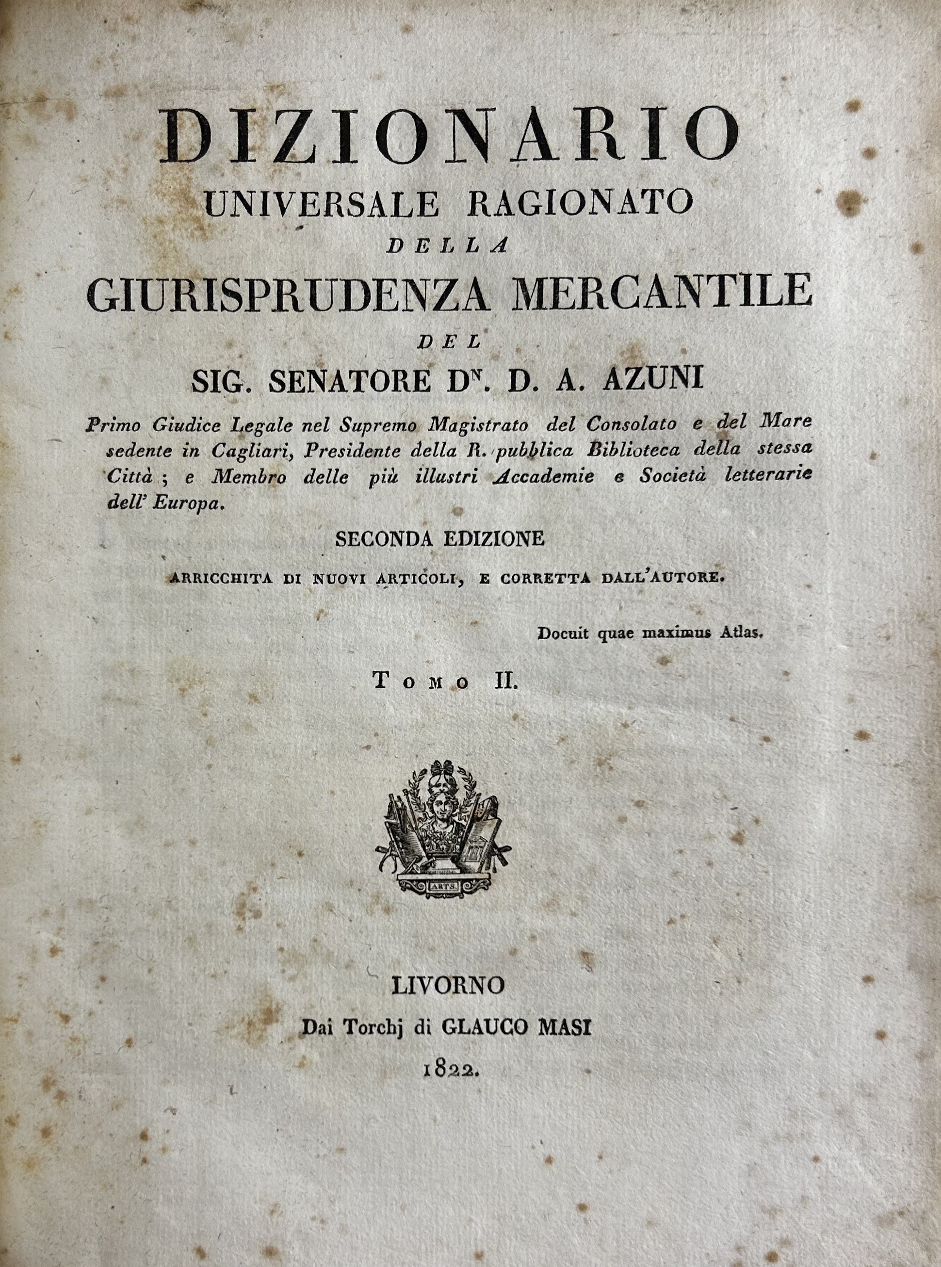 Dizionario universale ragionato della giurisprudenza mercantile del Sig. Senatore... Primo Giudice Legale nel Supremo Magistrato del Consolato e del Mare sedente in Cagliari