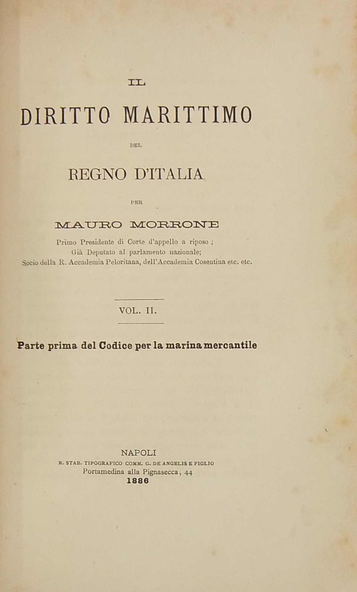 Il diritto marittimo del Regno d'Italia. Vol. I - Introduzione generale; Vol. II - Parte prima del Codice per la Marina mercantile