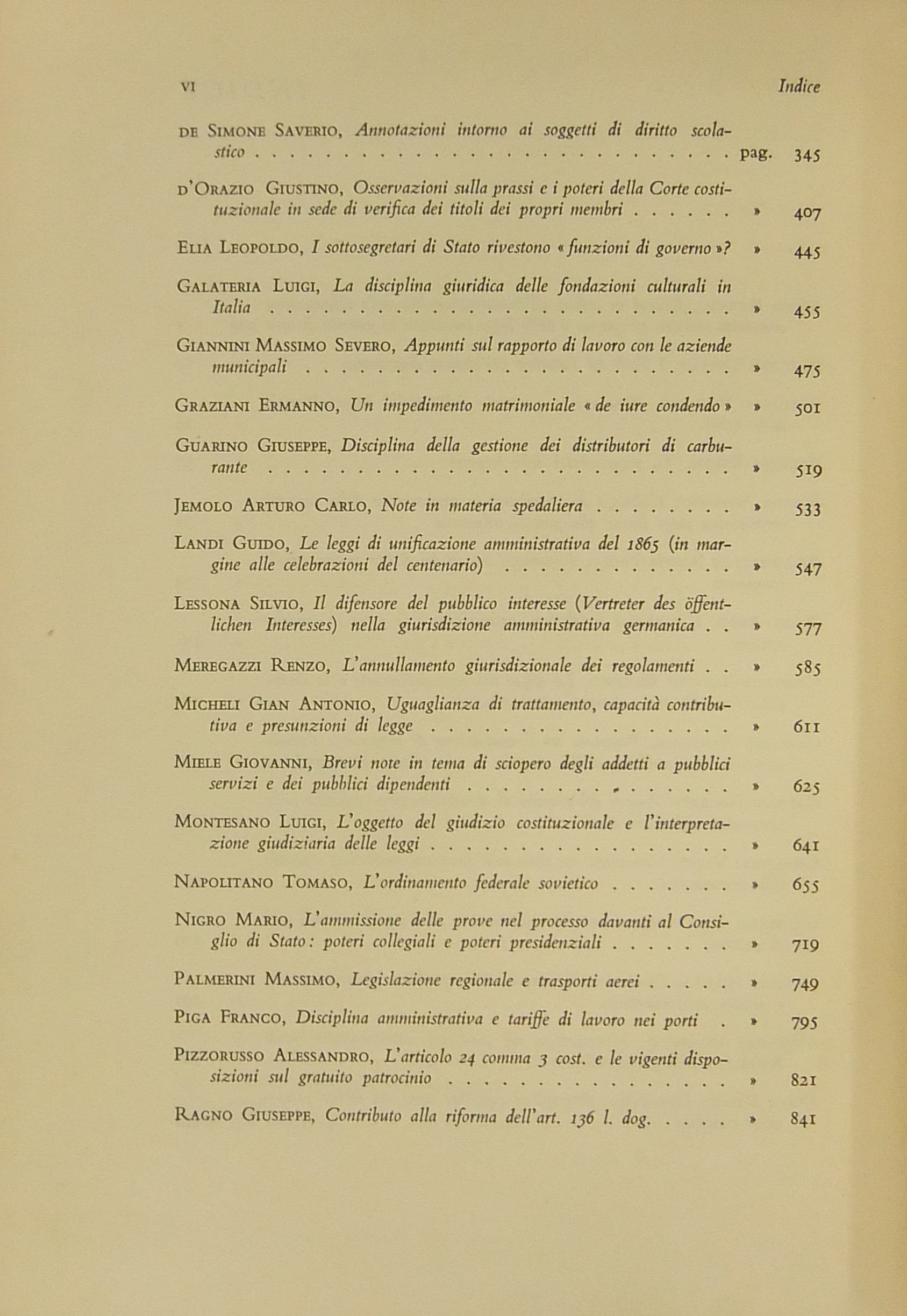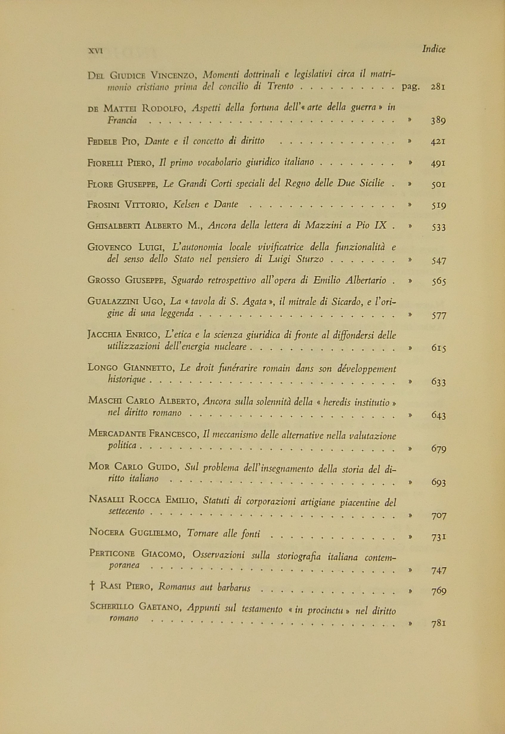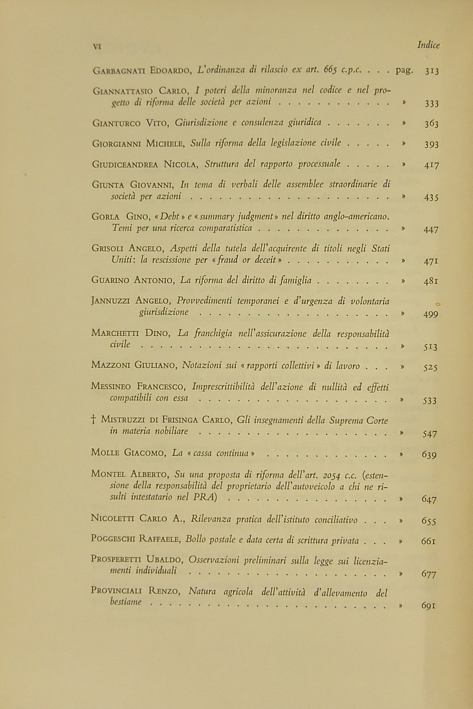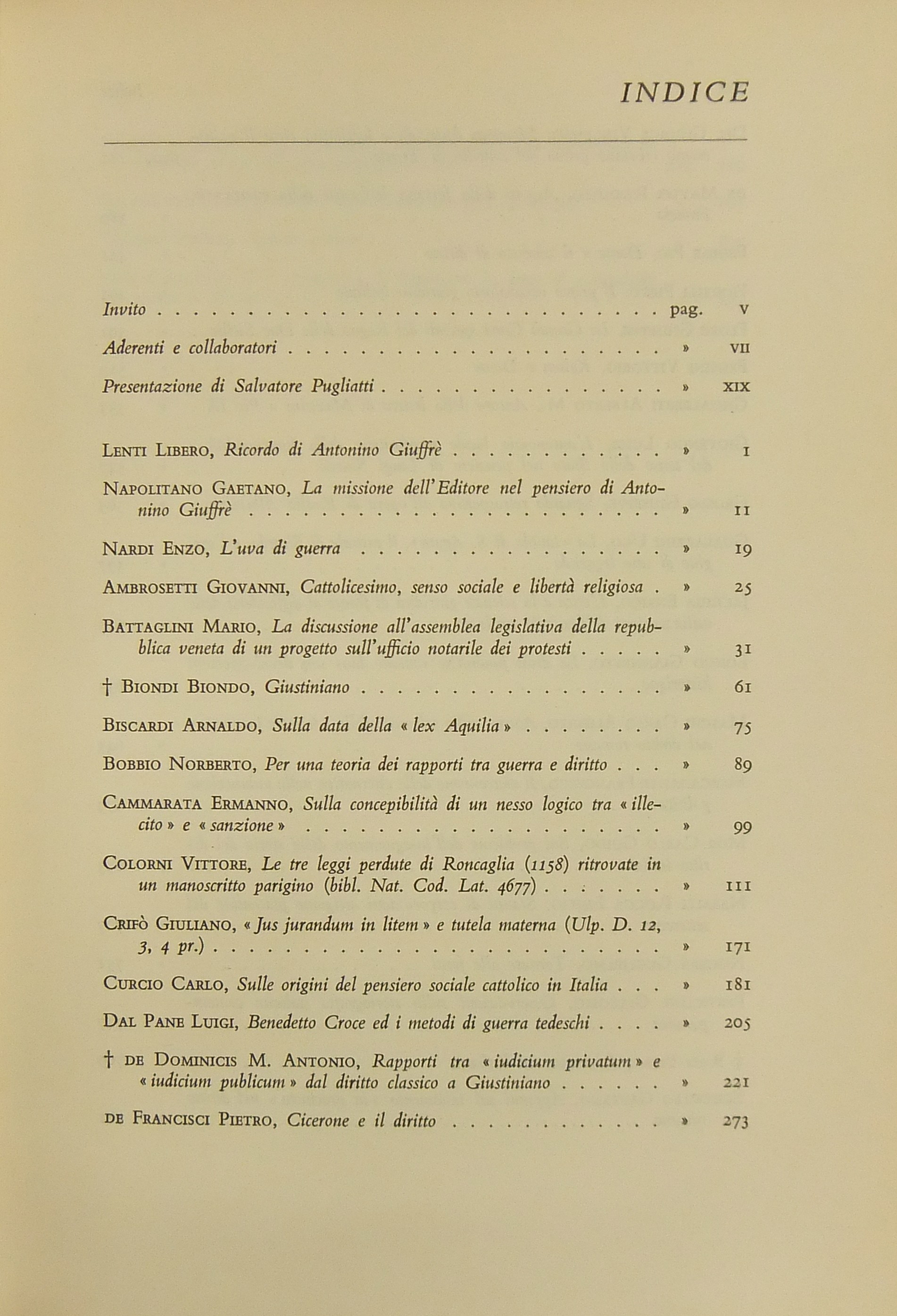 Ritratto fotografico di Giuffrè a inizio opera. Nel primo volume scritti di: Ambrosetti, Battaglini, Biondi, Biscardi, Bobbio, Cammarata, Colorni, Crifò, Curcio, Dal Pane, De Dominicis, De Francisci, V. Del Giudice, De Mattei, Fedele, Fiorelli, Flore, V. Frosini, Ghisalberti, Giovenco, Grosso, Gualazzini, Jacchia, Lenti, Longo, Maschi, Mercadante, Mor, Napolitano, Nardi,  Nasalli, Nocera, Perticone, Rasi, Scherillo, Spinelli, Talamanca, Vaccari, Voci. Nel secondo volume: Andrioli, Angeloni, Ardau, Betti, Bianchi d'Espinosa, Bigiavi, Borselli, Branca, Cappelletti, Chiappelli, Cigolini, De Cupis, R. Del Giudice, A. Donati, F.Ferrara, Fragali, Garbagnati, Giannattasio, Gianturco, M. Giorgianni, Giudiceandrea, Giunta, Gorla, Grisoli, A. Guarino, Jannuzzi, Marchetti, Mazzoni, Messineo, Mistruzzi di Frisinga, Molle, Montel, Nicoletti, Poggeschi, U. Prosperetti, Provinciali, Ragusa Maggiore, P. Rescigno, Romagnoli, Salis, Scarlata Fazio, M. Stella Richter, Vellani, Visco, Vocino. Nel terzo volume: Alessi, Baccari, Bachelet, Bagnoli, Berliri, Biscaretti di Ruffia, Bozzi, Cannada Bartoli, Carugno, Cataldi, V.Crisafulli, S. D'Albergo, Daniele, D'Audino, Della Rocca, De Simone, D'Orazio, Elia, Galateria, M.S.Giannini, Graziani, G. Guarino, Jemolo, Landi, Lessona, Meregazzi, Micheli, G. Miele, Montesano, T. Napolitano, Nigro, Palmerini, Piga, Pizzorusso, Ragno, Rossano, Ruini, A.M. Sandulli, Sciascia, Spadari, Stendardi, G. Stolfi, Villari. Nel quarto volume: Barberi, Bettiol, Biscottini, Boldrini, Caffè, Conso, Costanzo, E. D'Albergo, De Nardo, Di Nardi, Duni, G. Foschini, Frisoli, Gaeta, Lattanzi, Levi Sandri, Malintoppi, Manca, Maresca, M. Miele, Napoletano, G. Napolitano, Papi, Parrillo, G. Pescatore, Pisani, Pisapia, Ranieri, Sereni, Sperduti, Tagliacarne, Tommasi di Vignano, G. Vassalli, Vitta, P. Ziccardi, Zingali.