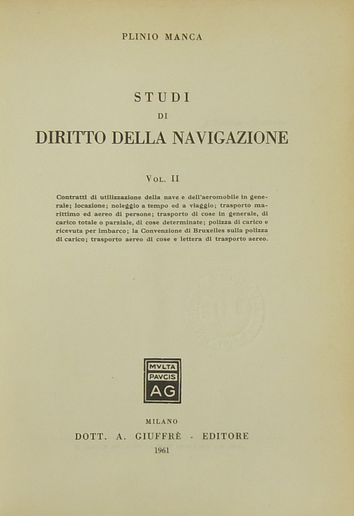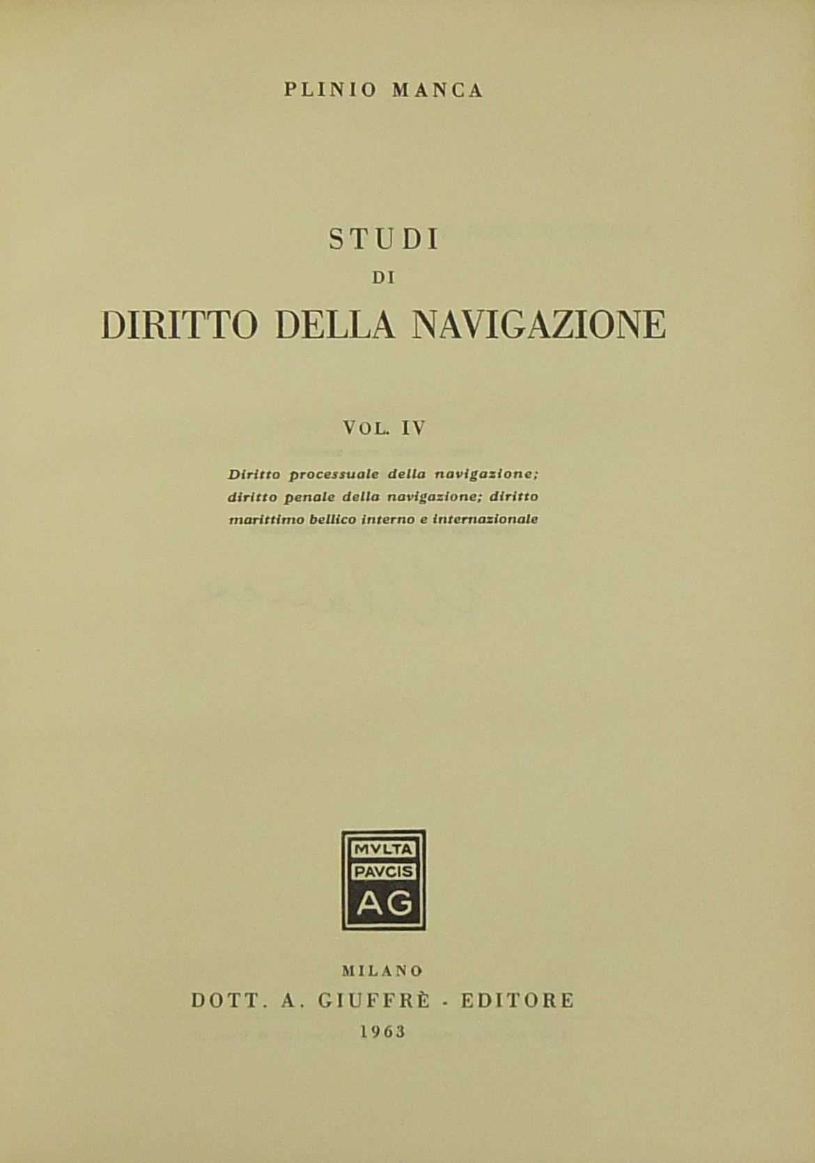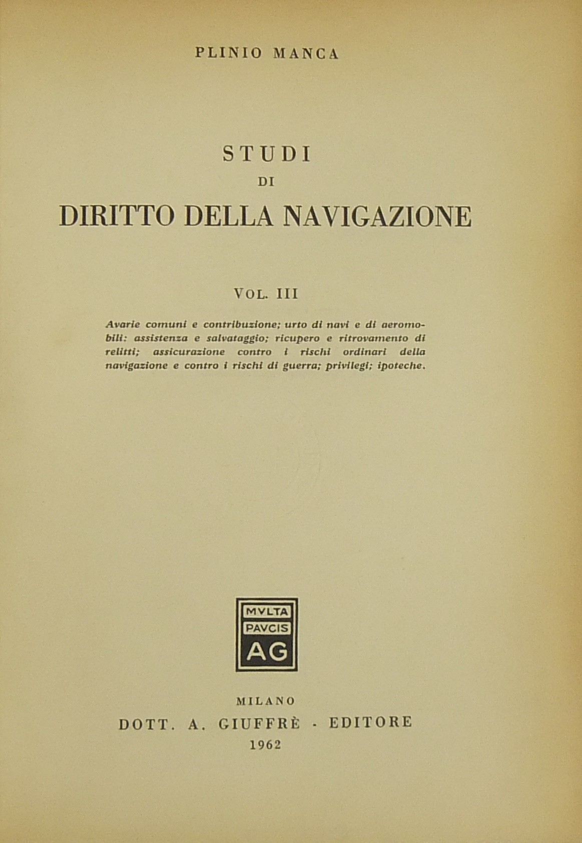 Studi di diritto della navigazione. Vol. I - Diritto della navigazione e sue fonti mare territoriale e norme di diritto internazionale privato; ordinamento amministrativo della navigazione; costruzione della nave proprietà e comproprietà; imprenditore nautico; armatore; società di armamento; raccomandatario; comandante; equipaggio. Vol. II - Contratti di utilizzazione della nave e dell'aeromobile in generale; locazione; noleggio a tempo ed a viaggio; trasporto marittimo ed aereo di persone; trasporto di cose in generale, di carico totale o parziale, di cose determinate; polizza di carico e ricevuta per imbarco; la Convenzione di Bruxelles sulla polizza di carico, trasporto aereo di cose e lettera di trasporto aereo. Vol. III - Avarie comuni e contribuzione; urto di navi e di aeromobili; assistenza e salvataggio; ricupero e ritrovamento di relitti; assicurazione contro i rischi ordinari della navigazione e contro i rischi di guerra; privilegi; ipoteche. Vol. IV - Diritto processuale della navigazione; diritto penale della navigazione; diritto marittimo bellico interno e internazionale.